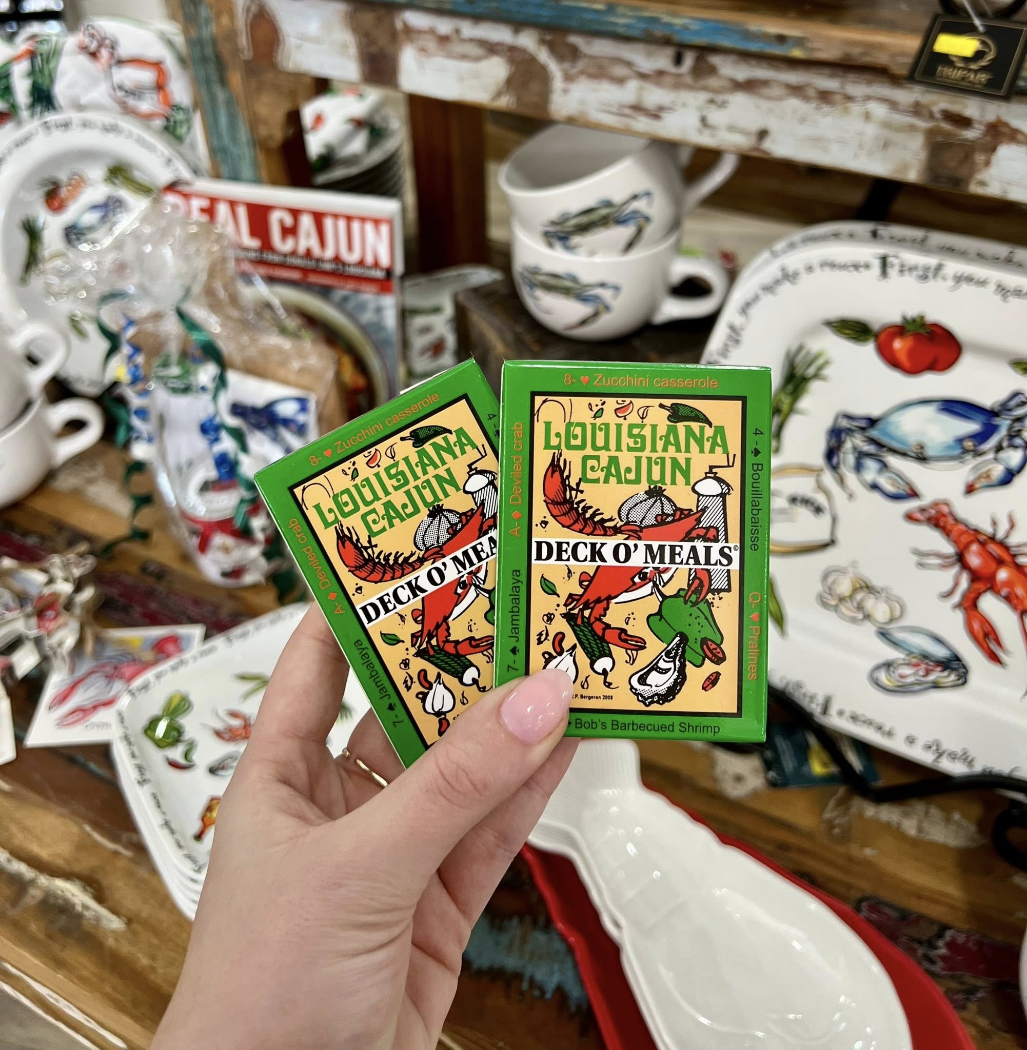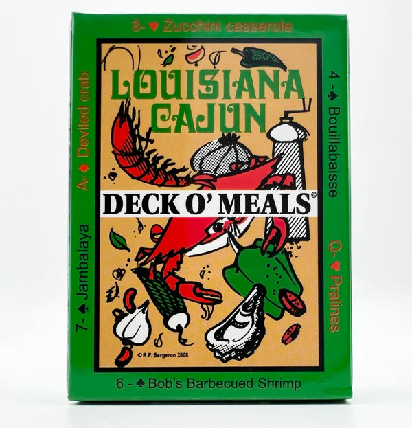 With our original Louisiana Cajun Deck O' Meal Deck, bring a taste of Southern Louisiana to your kitchen with the Louisiana Cajun Deck O' Meals! This playable deck of 52 recipe playing cards guar-on-tee a good time with tried-and-true recipes that will have everyone lining up for seconds. With a magnet on the back and directions on how to play Bourre, it's a memorable souvenir or gift. Get ready to eat good food and pass a good time!
