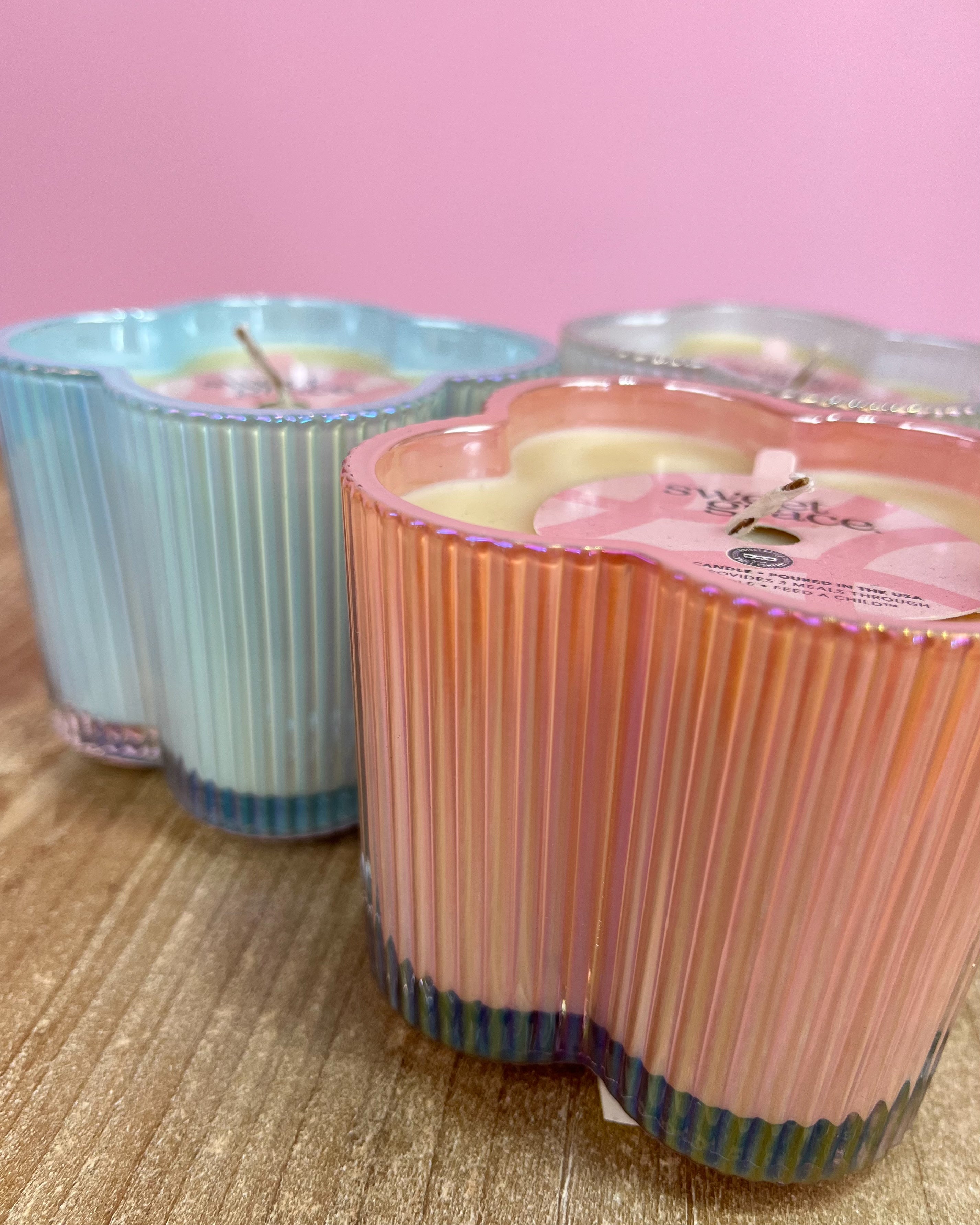 Charming, feminine, and full of character, the Sweet Grace Candle #077 blooms beautifully in a delicate flower-shaped vessel. The ribbed glass texture and soft iridescent light blue finish reflect light from every angle, adding a fresh yet elegant glow to your space. It’s the perfect little statement piece for nightstands, coffee tables, vanities, or gifting moments that deserve something special.