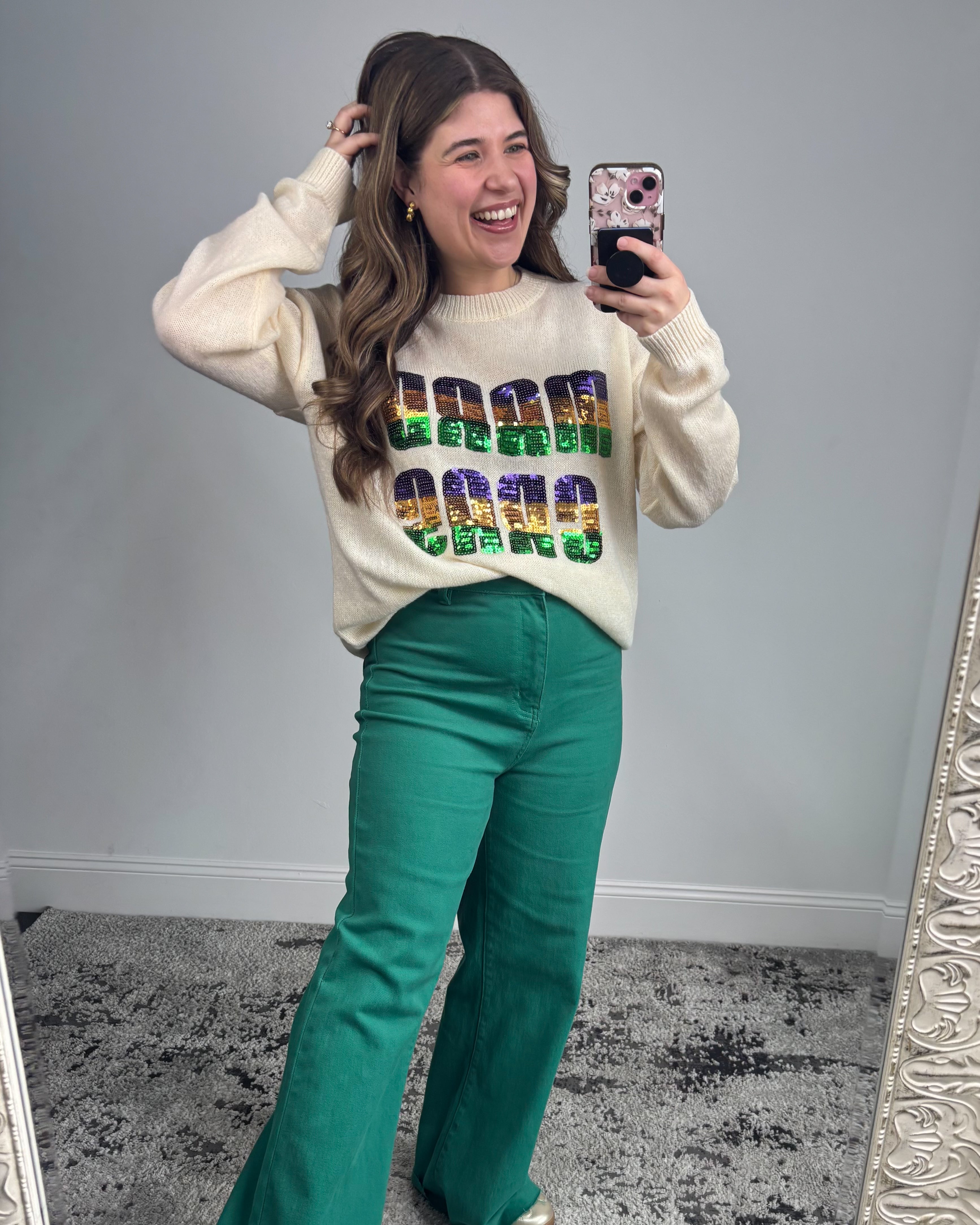 Meet the Bayou Babe Sparkle Top — a festive favorite that blends cozy comfort with eye-catching Mardi Gras flair. This soft cream knit sweater features bold sequin lettering in classic purple, gold, and green, giving it that unmistakable Louisiana spirit while still feeling elevated and boutique-worthy. It’s playful, polished, and perfect for celebrating in style. 💜💛💚