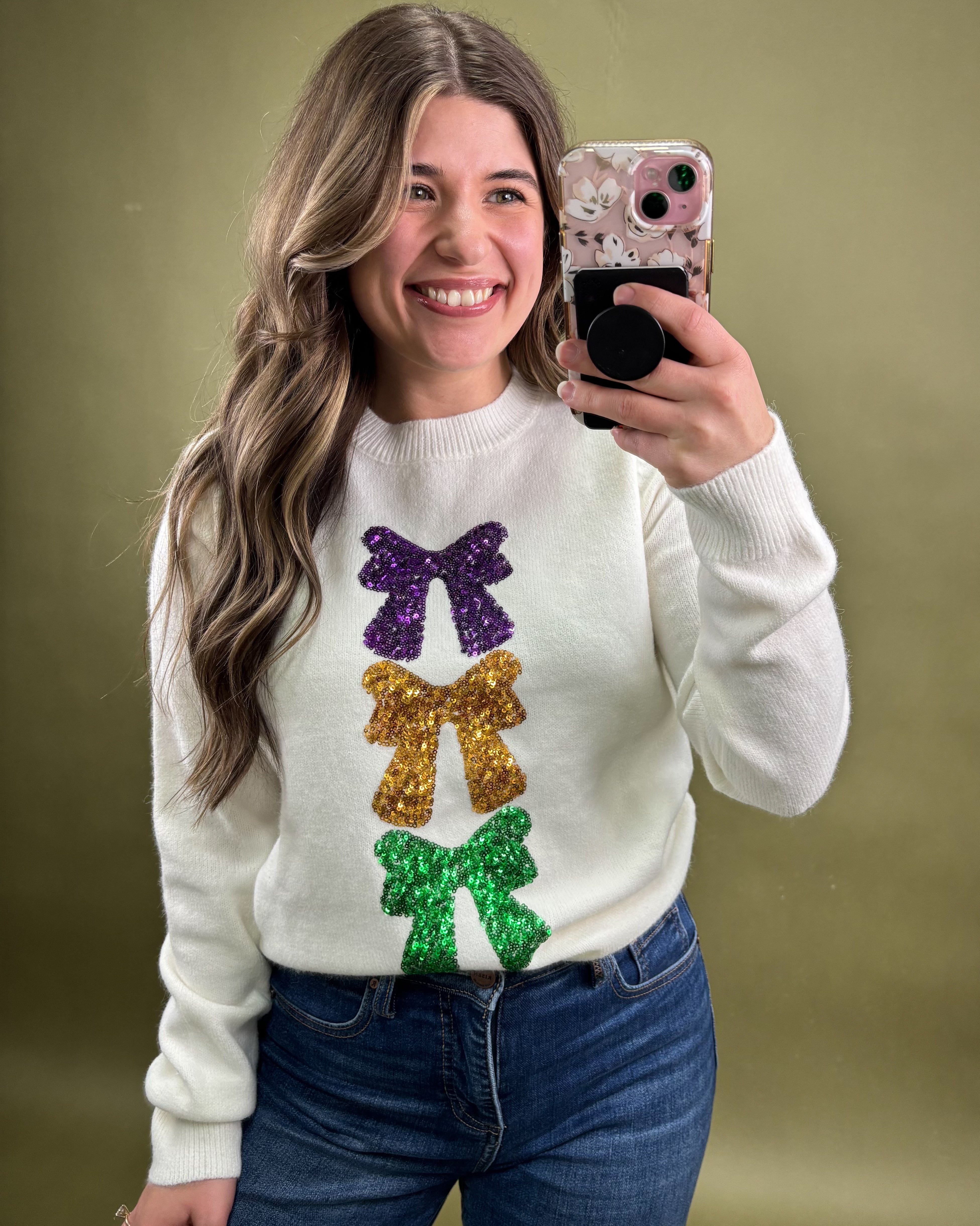 Meet the Krewe of Bows Sequin Sweater — the sweetest way to sparkle through Mardi Gras season! 🎭✨ This cozy knit takes a classic winter silhouette and transforms it into a festive statement piece with three glittering sequin bows in the iconic Mardi Gras palette: purple for justice, gold for power, and green for faith. Each bow catches the light beautifully, giving you just the right amount of shimmer whether you're at a parade, party, or just adding a little Carnival spirit to your day.