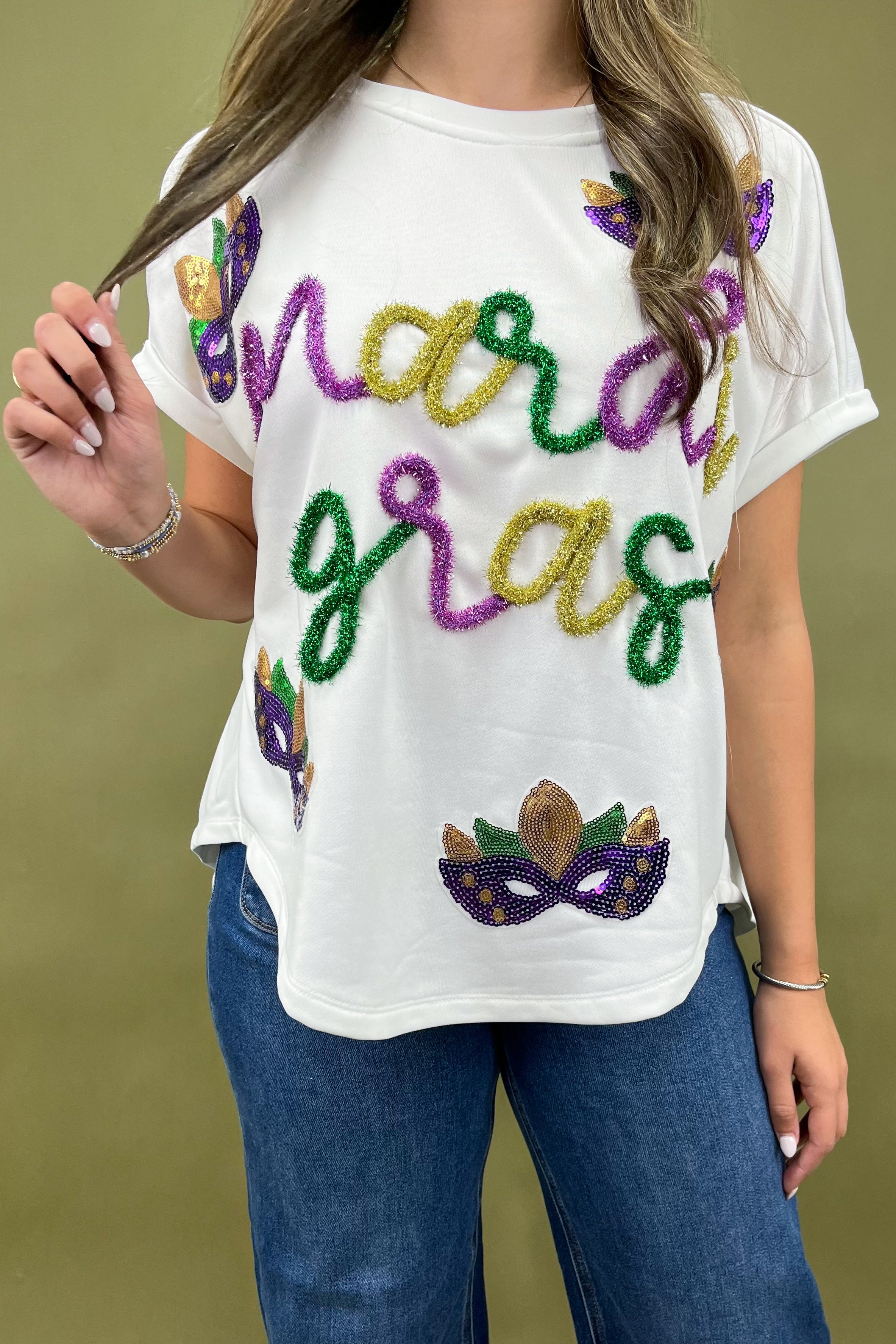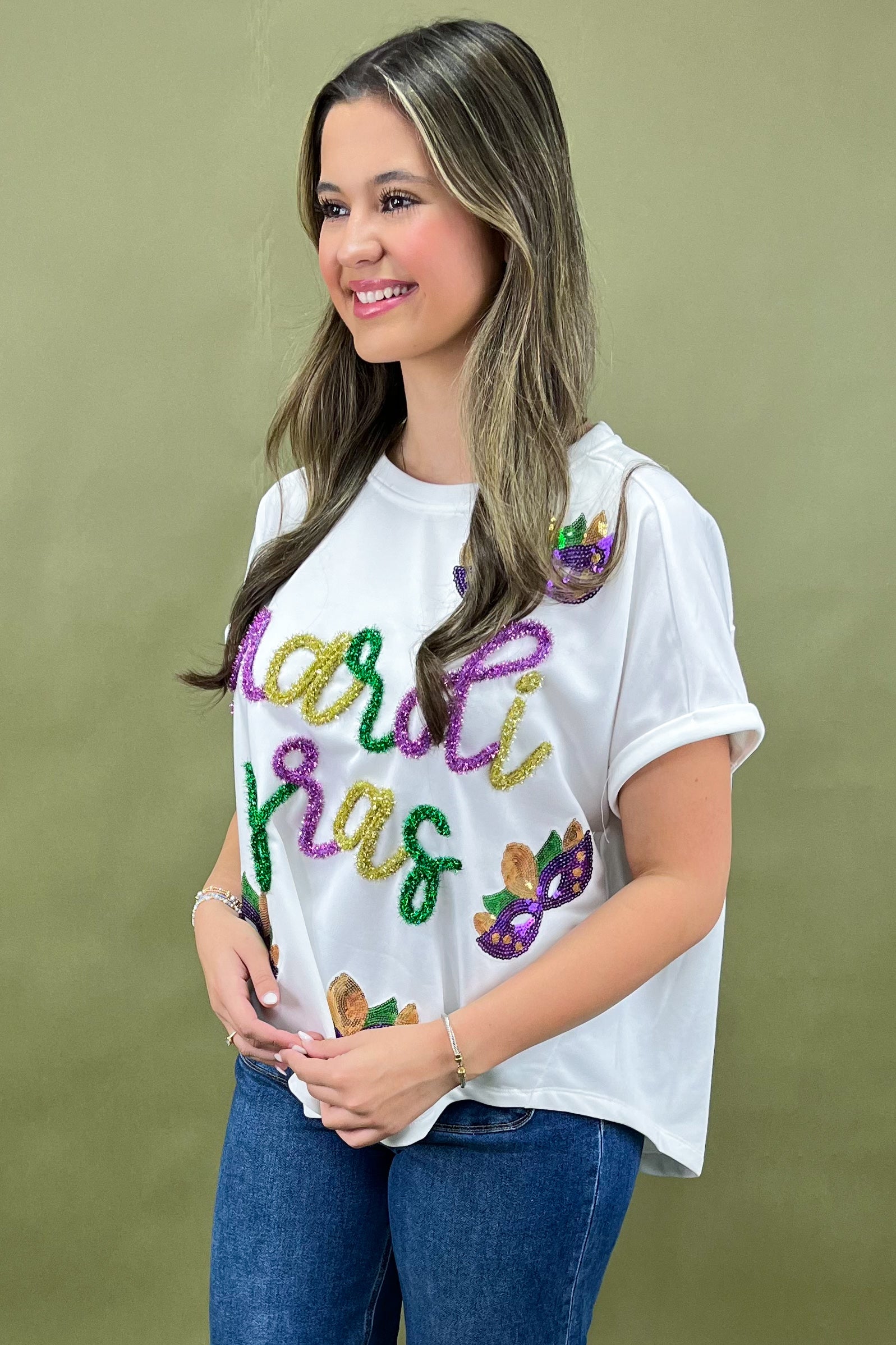 Show your Mardi Gras pride in the most fabulous way possible with The Krewe Spirit Sparkle Top 💜💚💛 — a statement piece that shines brighter than the parade lights! Crafted in a soft white fabric and adorned with glittering sequin “mardi gras” lettering and jeweled mask appliqués, this top is all about celebration, sparkle, and that unstoppable carnival energy.
