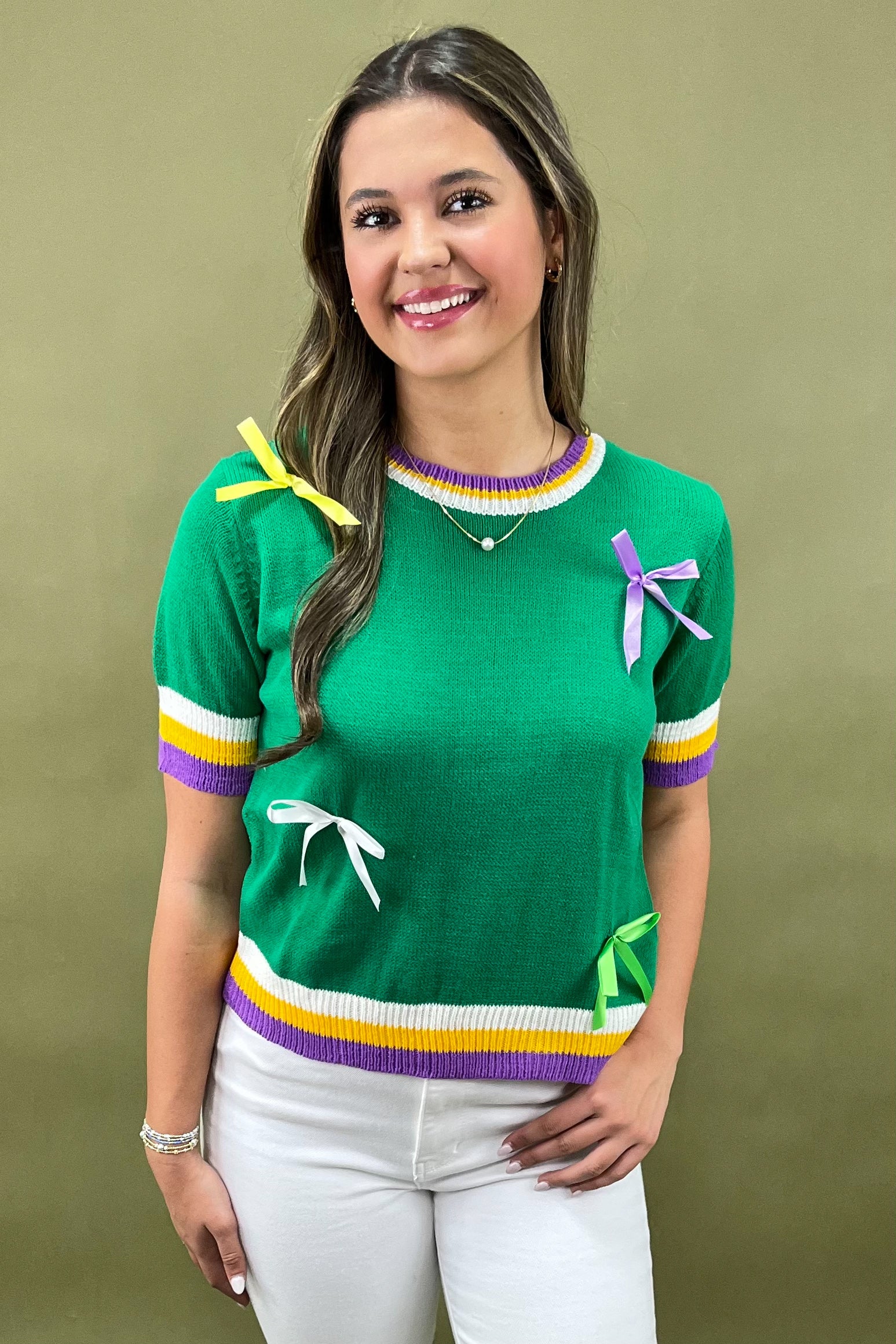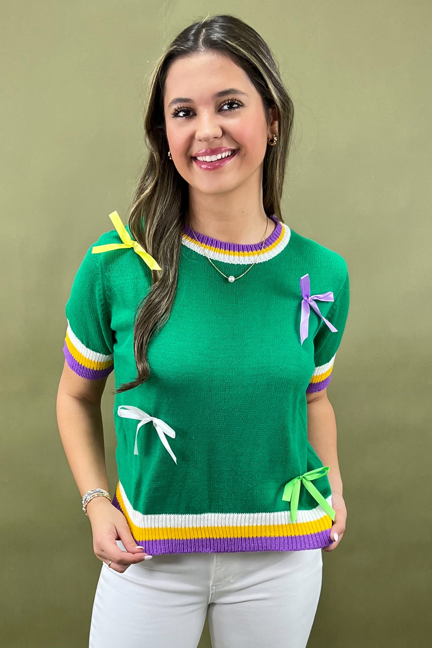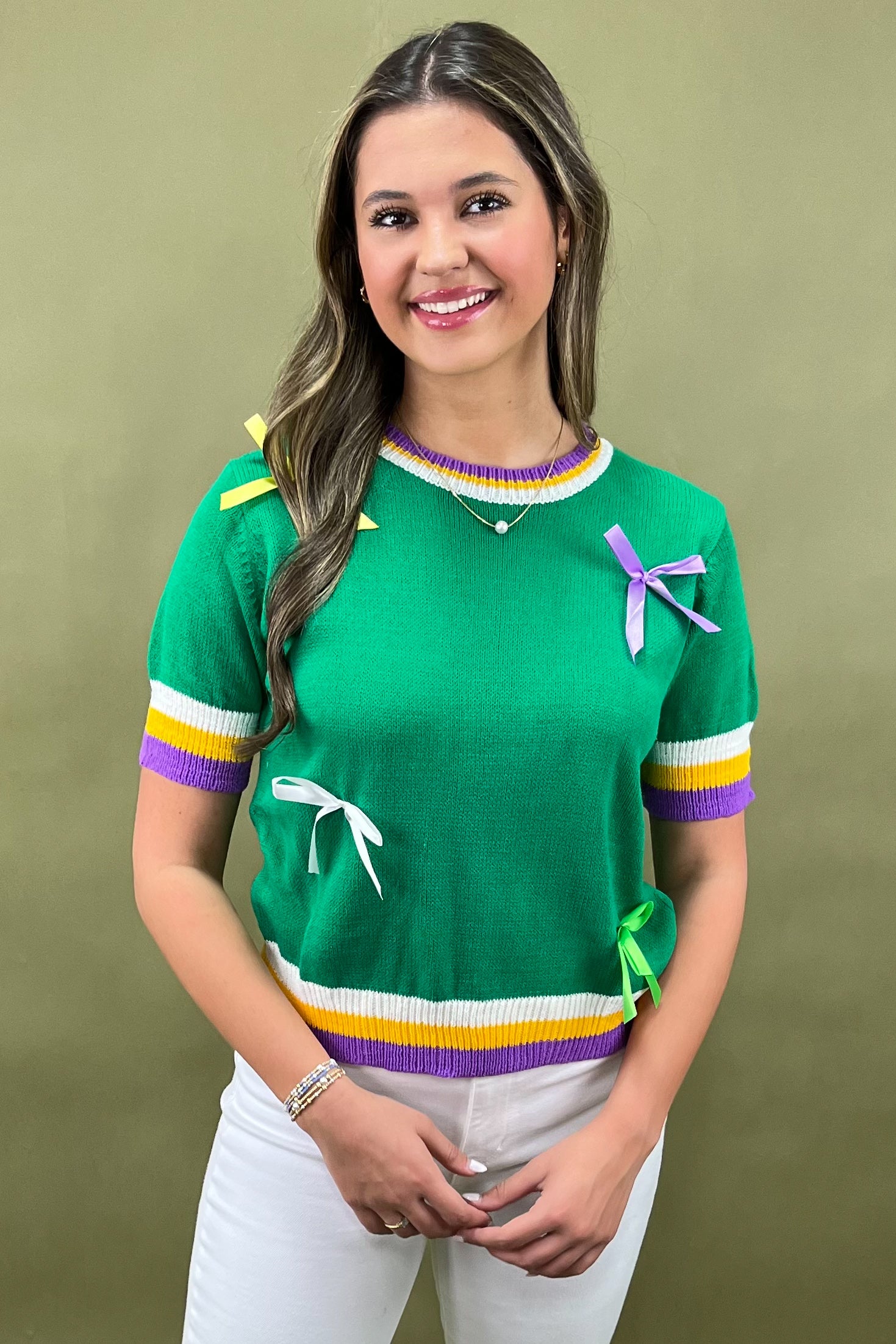 Say hello to instant fun in sweater form — meet the Parade Day Knit! 💜💚💛 She’s bold, she’s playful, and she’s ready to bring the party wherever you go. With her bright green base, pops of purple and gold striping, and sweet satin bow details sprinkled like confetti, this sweater is practically made for celebration season. Whether you’re front-row at a Mardi Gras parade, strolling through town with your besties, or just want to add a splash of whimsy to your wardrobe, Parade Day Knit is the ultimate statement piece.