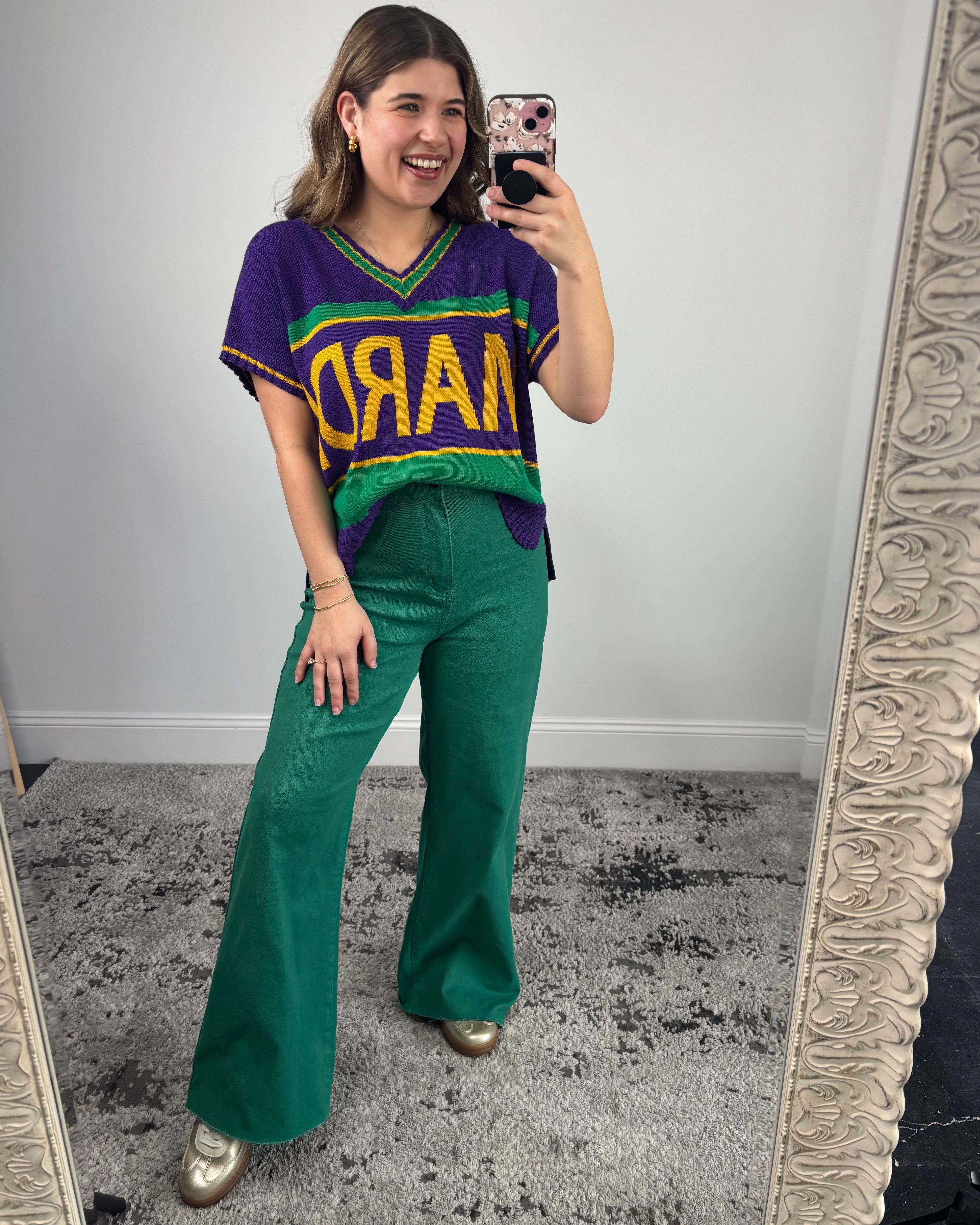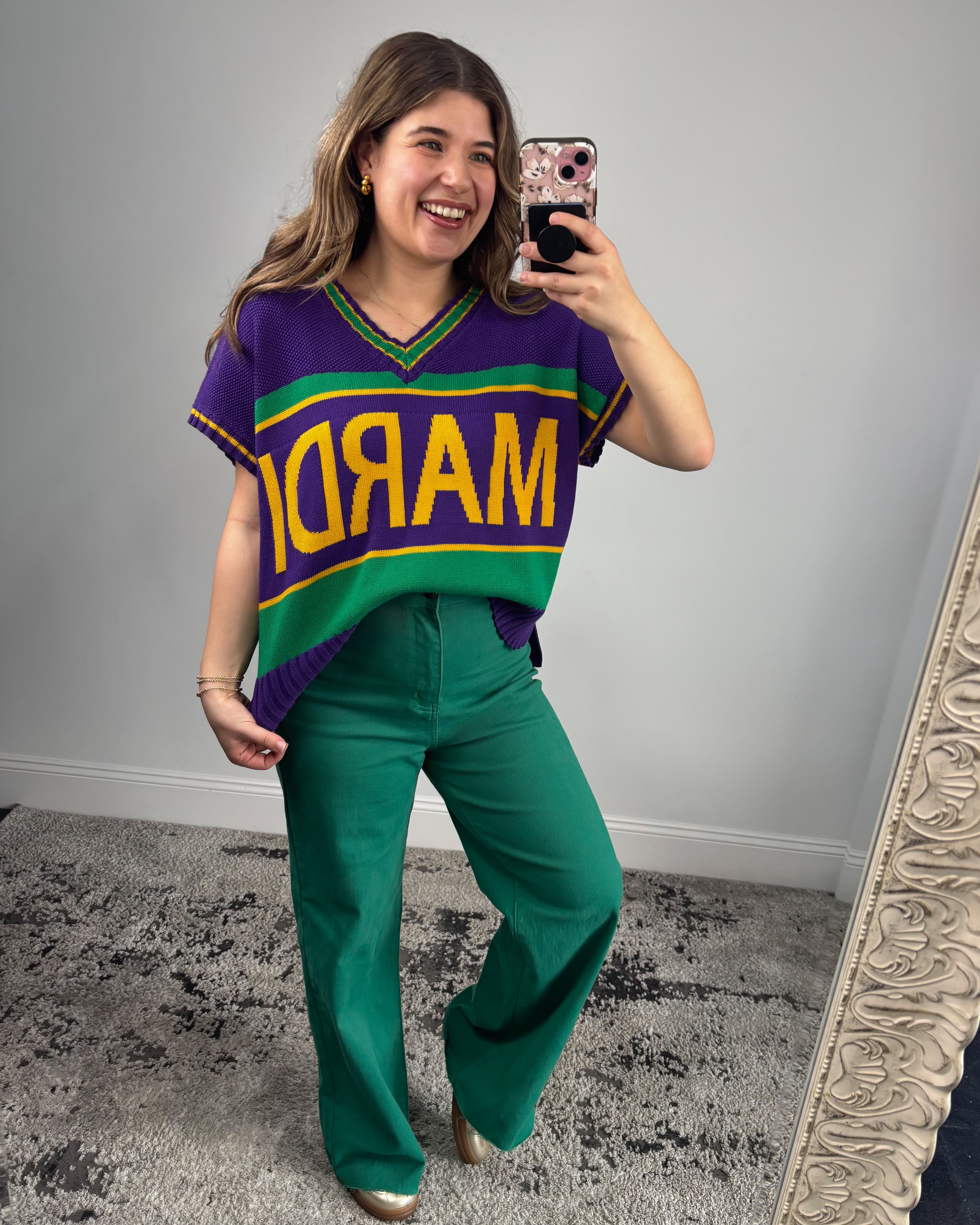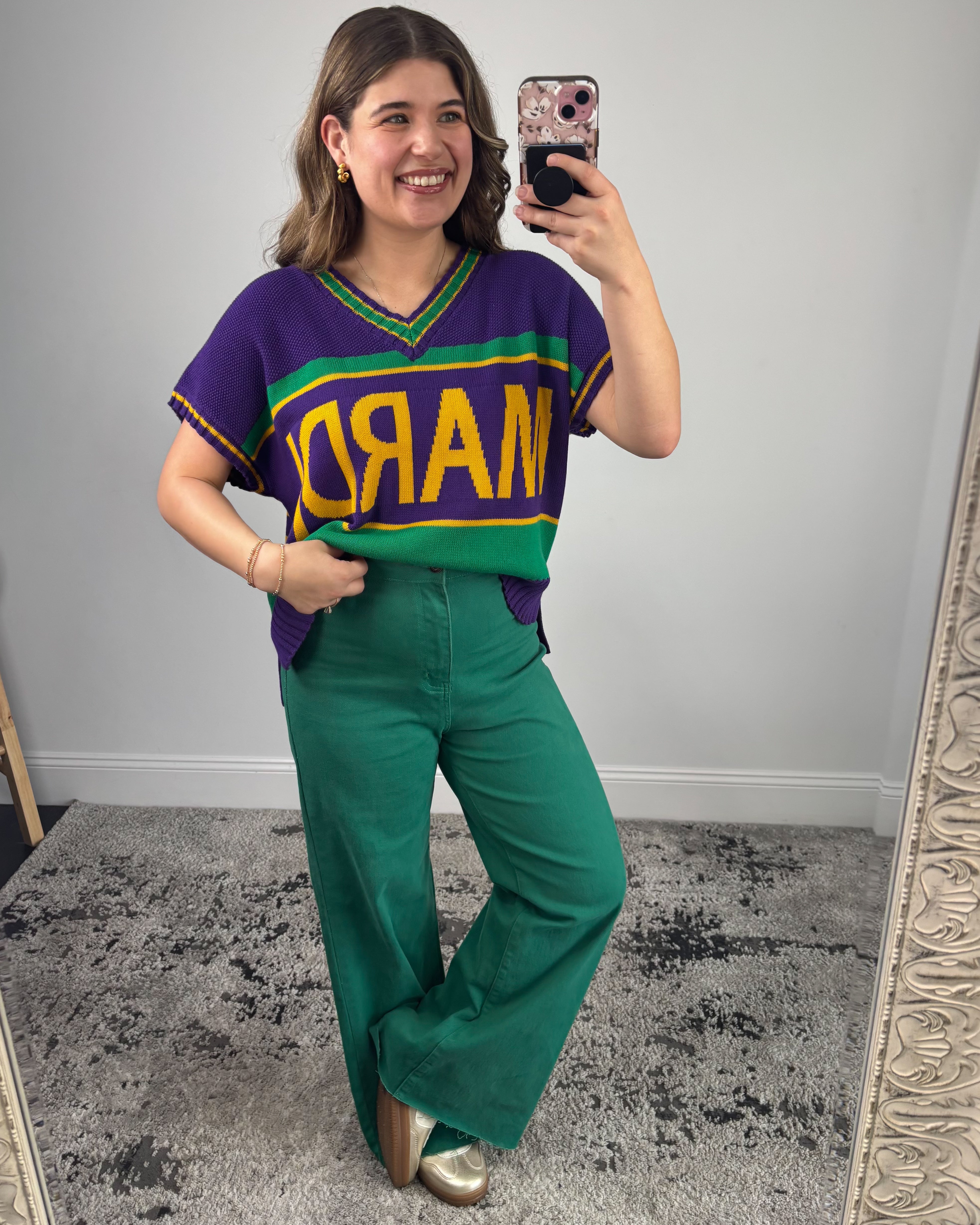 Crafted from a textured knit, this sweater top offers structure without feeling heavy, making it perfect for layering or wearing solo. The V-neckline adds a flattering touch, while the short sleeves keep it seasonally versatile for Louisiana weather. It’s festive enough for parade days but chic enough for casual outings.