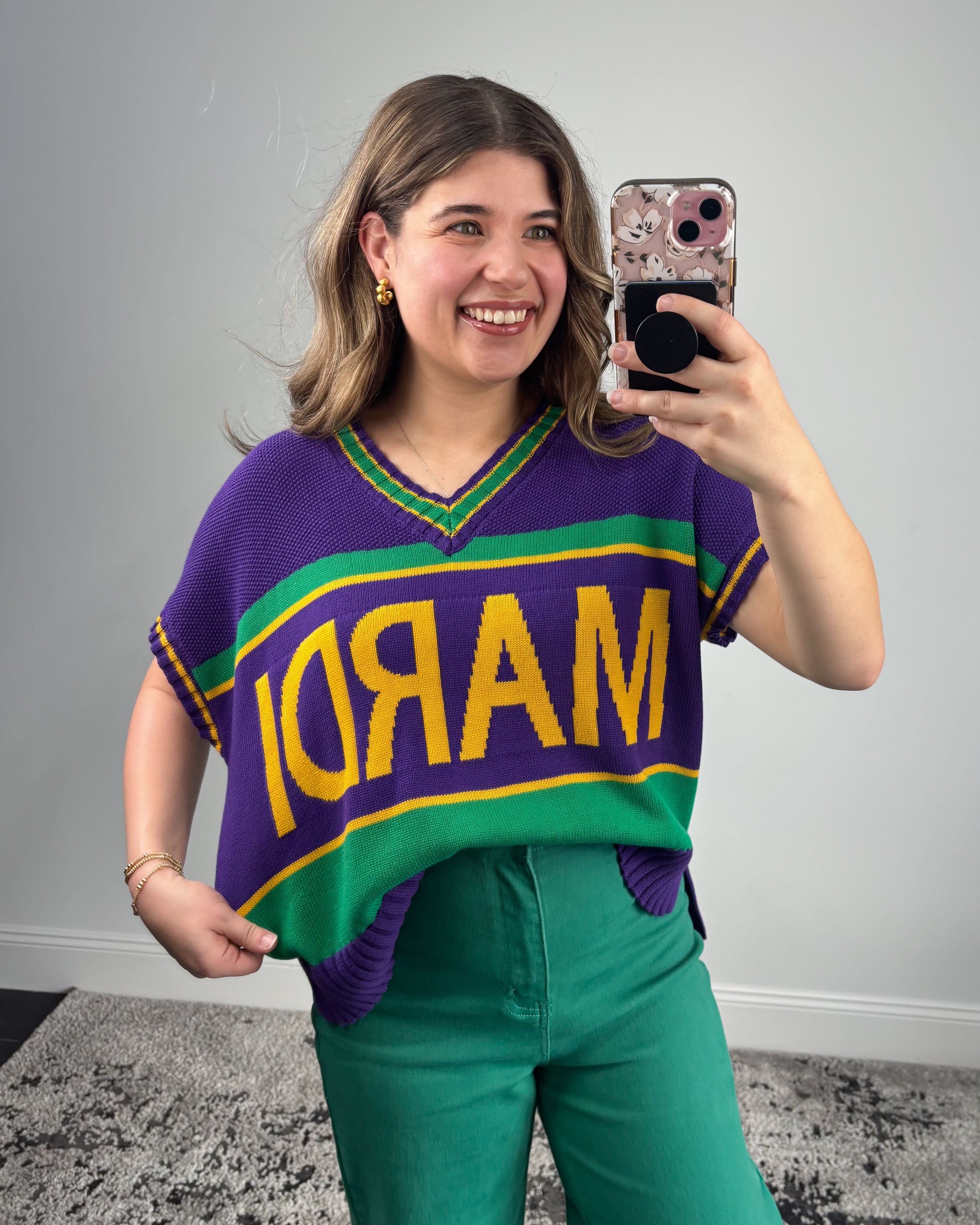 The Parade Ready Sweater Top is made for standing out in true Mardi Gras style, featuring bold purple, green, and gold colorblocking with an eye-catching “MARDI” knit across the front. The varsity-inspired design gives it a fun, festive feel while still staying polished and wearable for everyday plans. It’s the kind of top that instantly turns heads and sparks compliments.