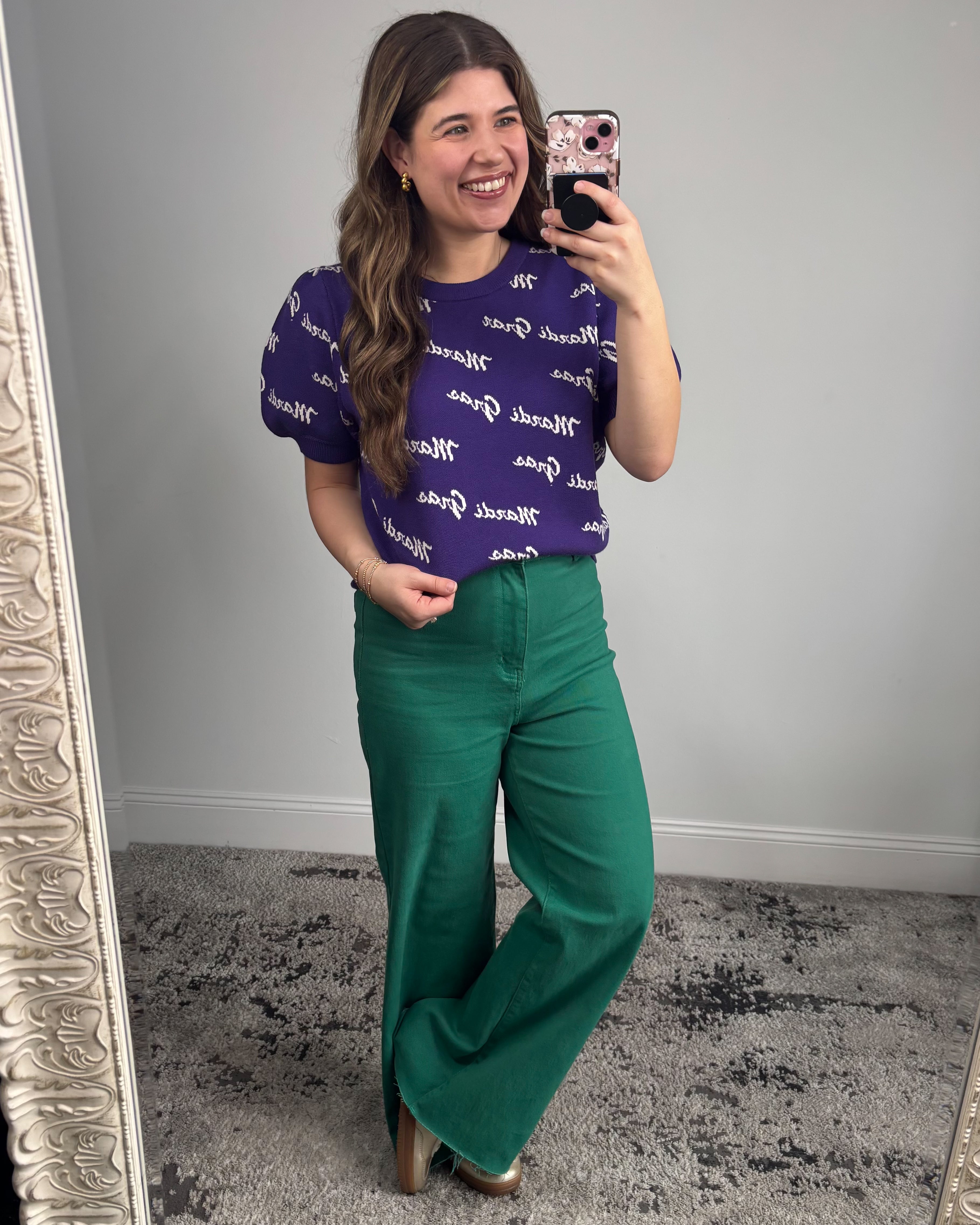 Whether you’re styling it with jeans, colorful trousers, or a fun skirt, the Purple Parade Sweater Top brings that festive Louisiana flair in a way that still feels chic and wearable. It’s bold, fun, and effortlessly cute—exactly what your closet needs for Mardi Gras season and beyond.