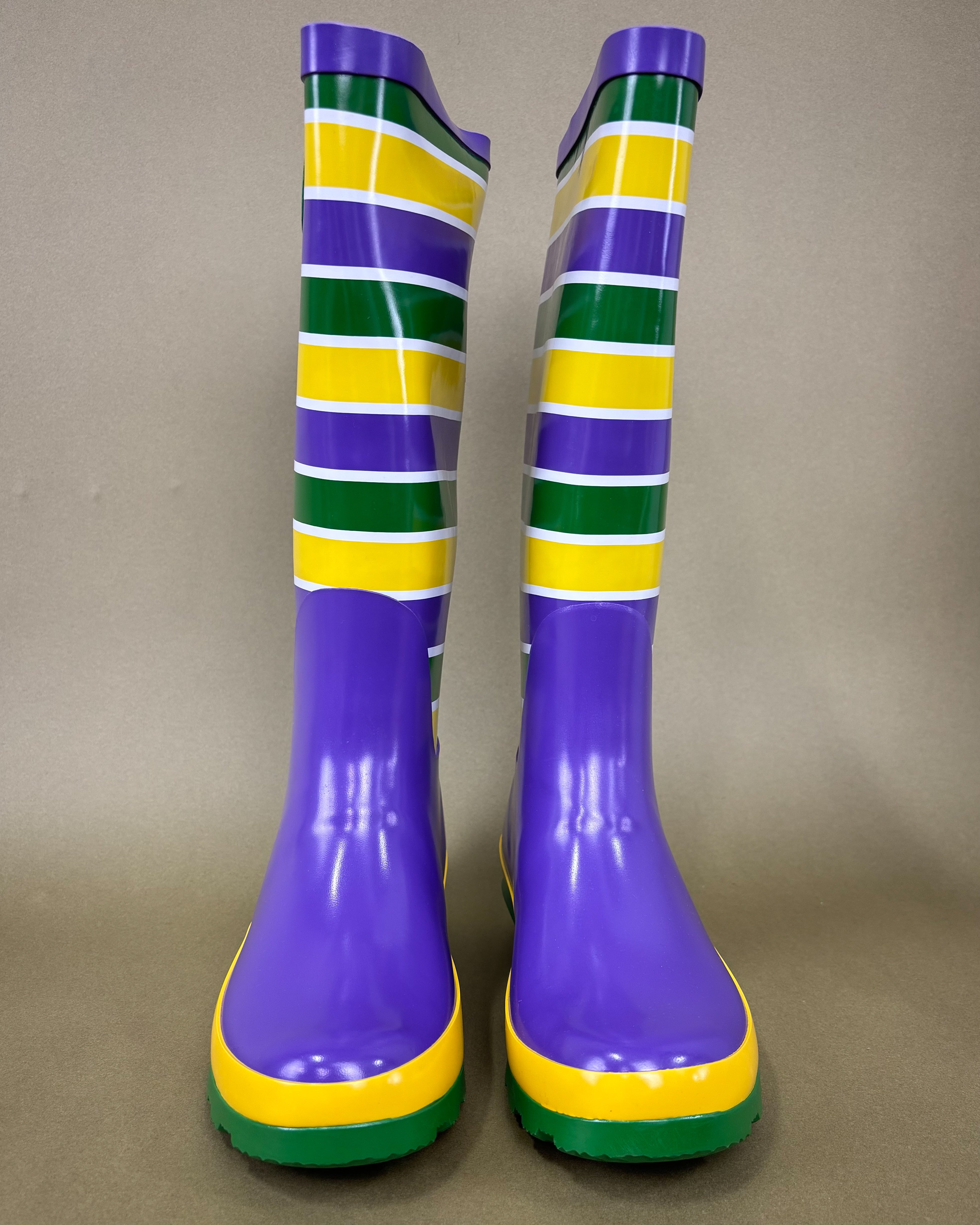 Bold, festive, and made to stand out, this eye-catching rain boot brings Mardi Gras magic to even the gloomiest days. Featuring classic purple, green, and gold stripes with a glossy waterproof finish, the Bead Queen is equal parts functional and fun. Whether youâre braving rainy parades, muddy festivals, or just adding flair to a drizzly day, these boots keep you dry while serving serious Louisiana style.đ Features Youâll Love