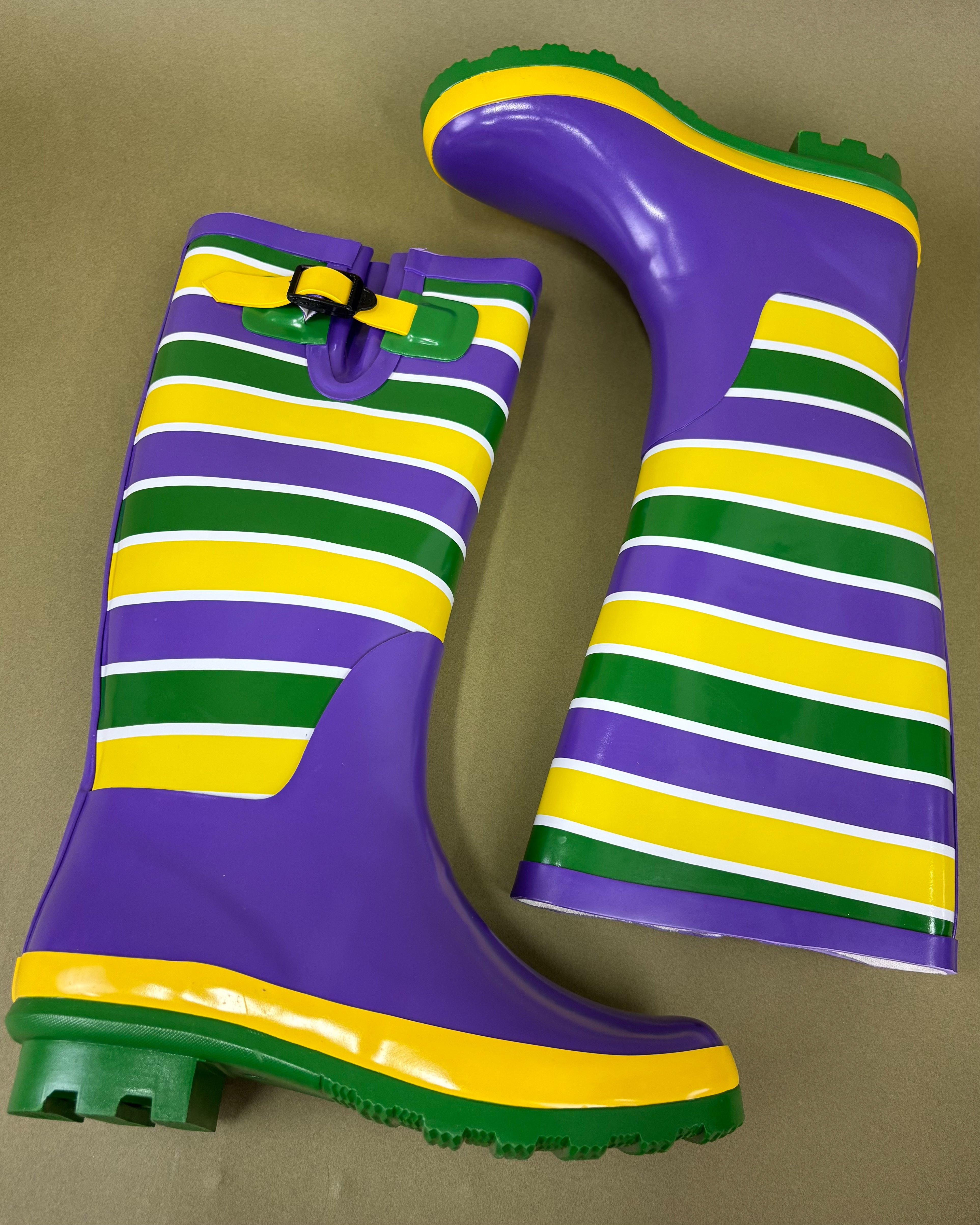 Bold, festive, and made to stand out, this eye-catching rain boot brings Mardi Gras magic to even the gloomiest days. Featuring classic purple, green, and gold stripes with a glossy waterproof finish, the Bead Queen is equal parts functional and fun. Whether youâre braving rainy parades, muddy festivals, or just adding flair to a drizzly day, these boots keep you dry while serving serious Louisiana style.