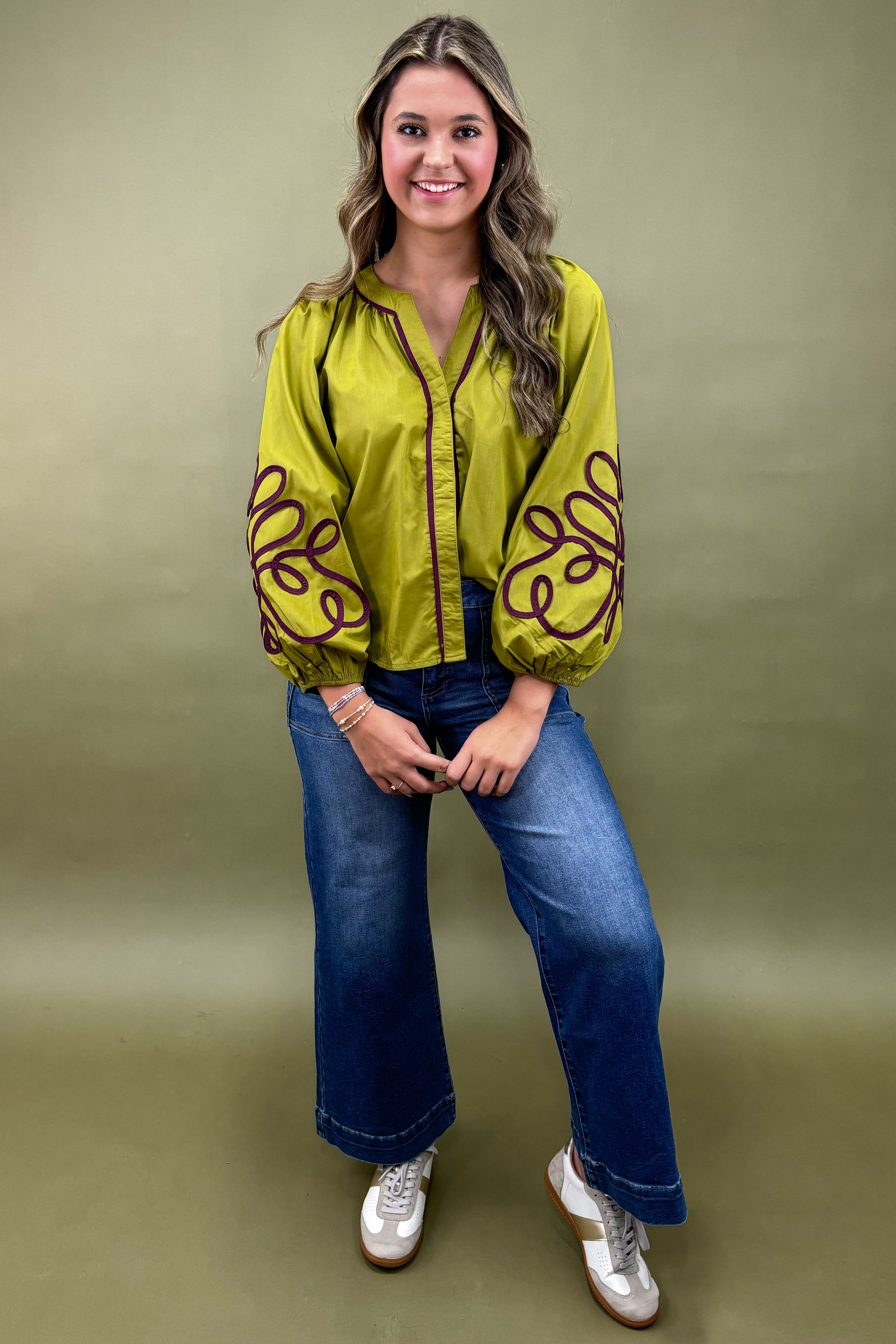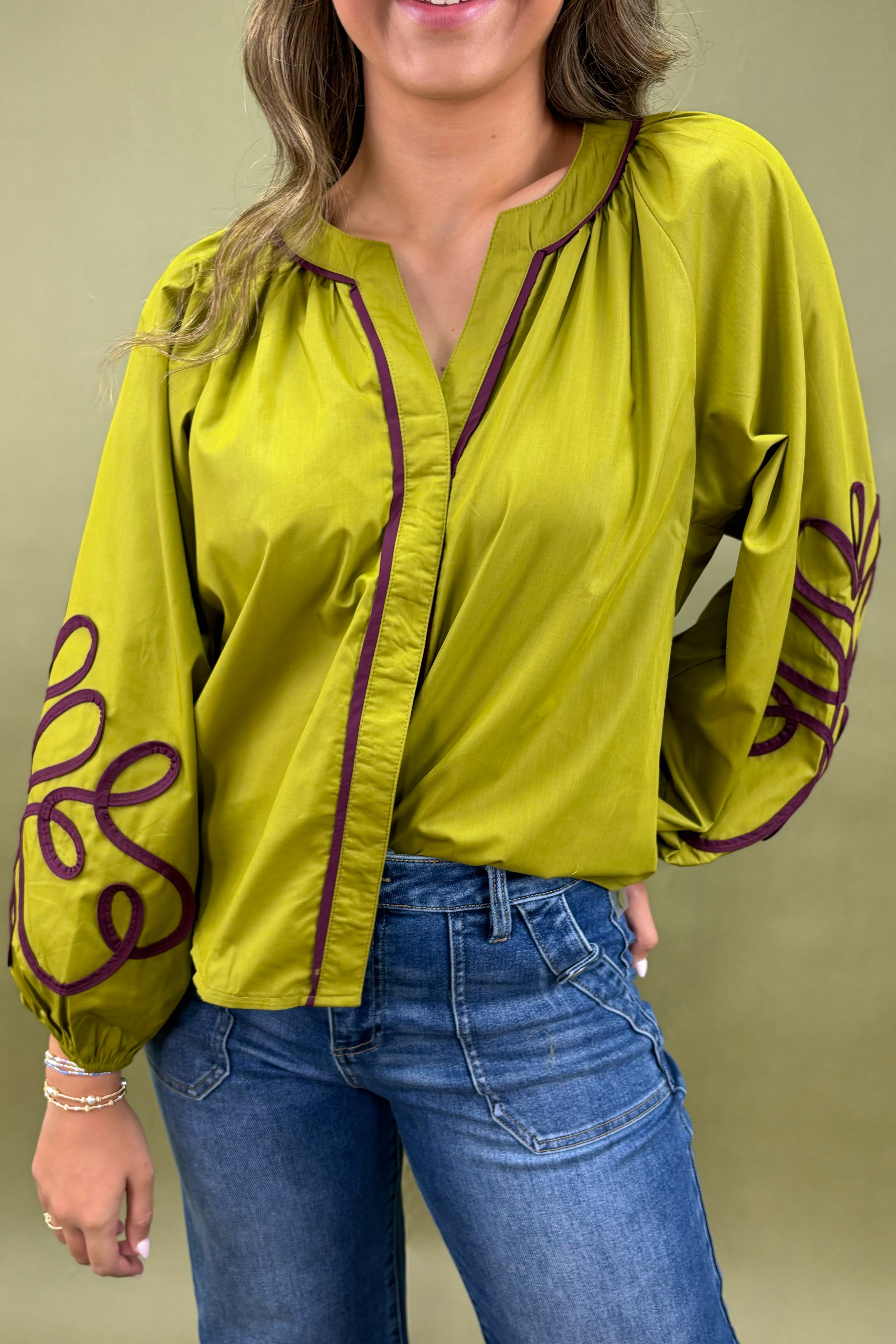 Crafted in a unique chartreuse-green fabric with a subtle sheen, this blouse radiates confidence and individuality. The tailored yet relaxed fit ensures comfort while maintaining an effortlessly put-together vibe. Deep plum piping runs along the neckline, front placket, and cuffs, creating a striking contrast that frames the look beautifully. But the real showstopper? The appliqued swirled detailing on the sleeves—bold, artistic strokes that give the piece its signature personality.
