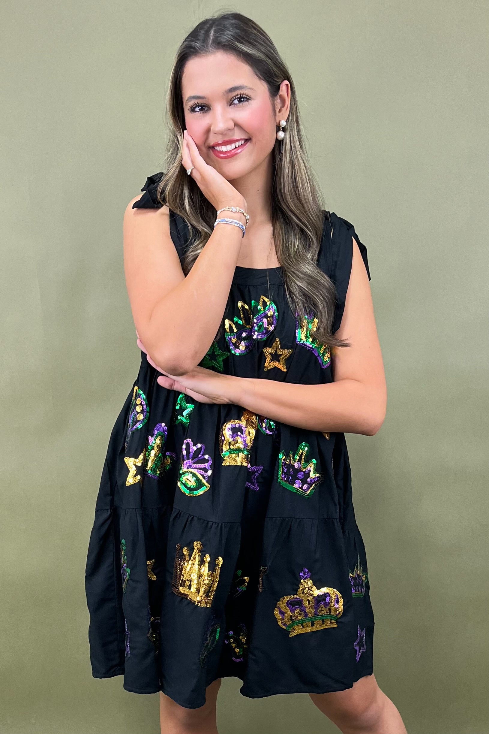 Designed with a lightweight black base that keeps you breezy and comfortable, this mini dress is all about the shimmer. Every inch is covered in vibrant, hand-applied Mardi Gras sequin appliquĂ©s â crowns, masks, stars, and all things celebratory â stitched with intention and personality. Each motif is like a little piece of festival joy, sparkling the moment light hits it. You donât just wear this dress⊠you perform in it. âš