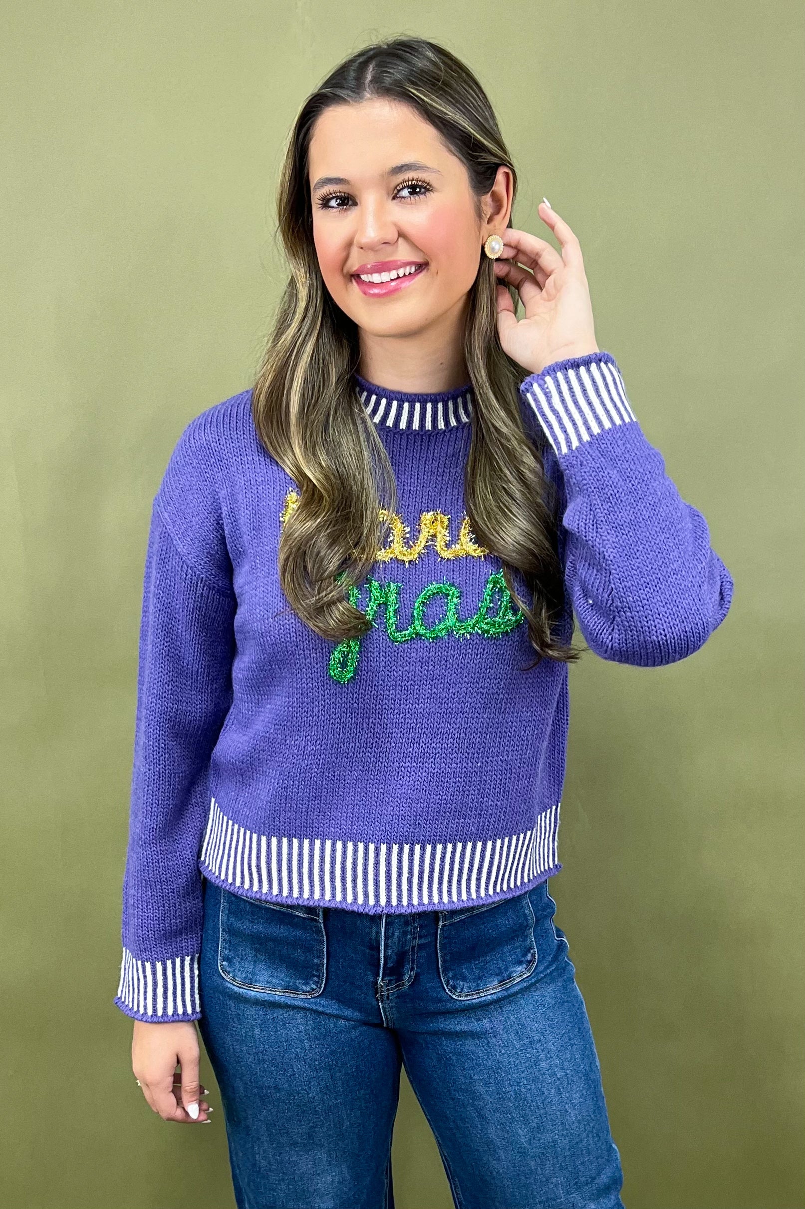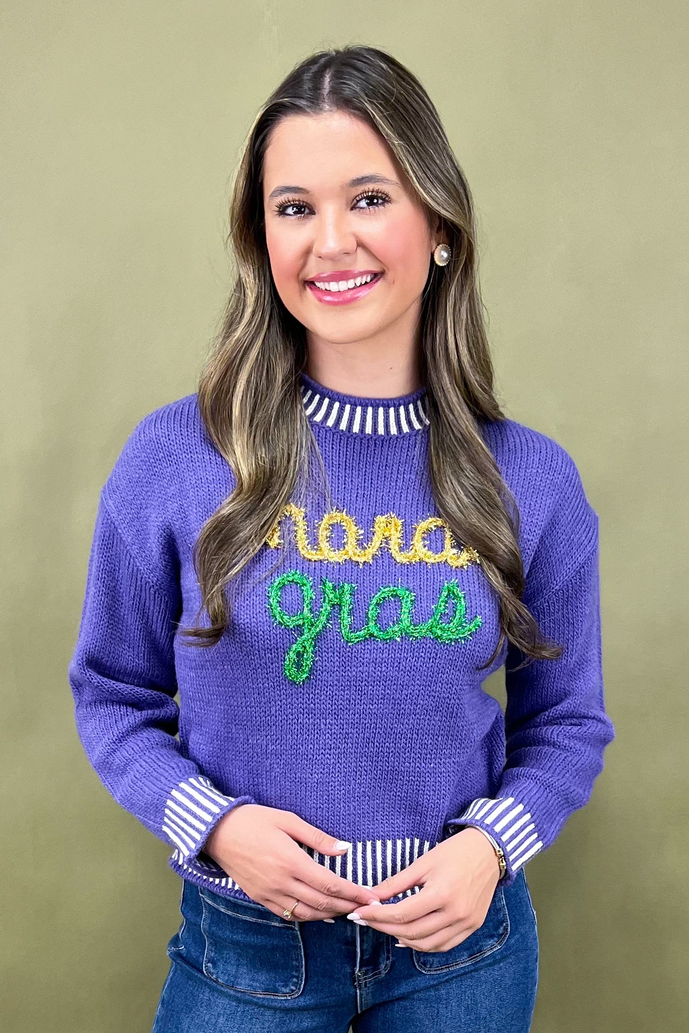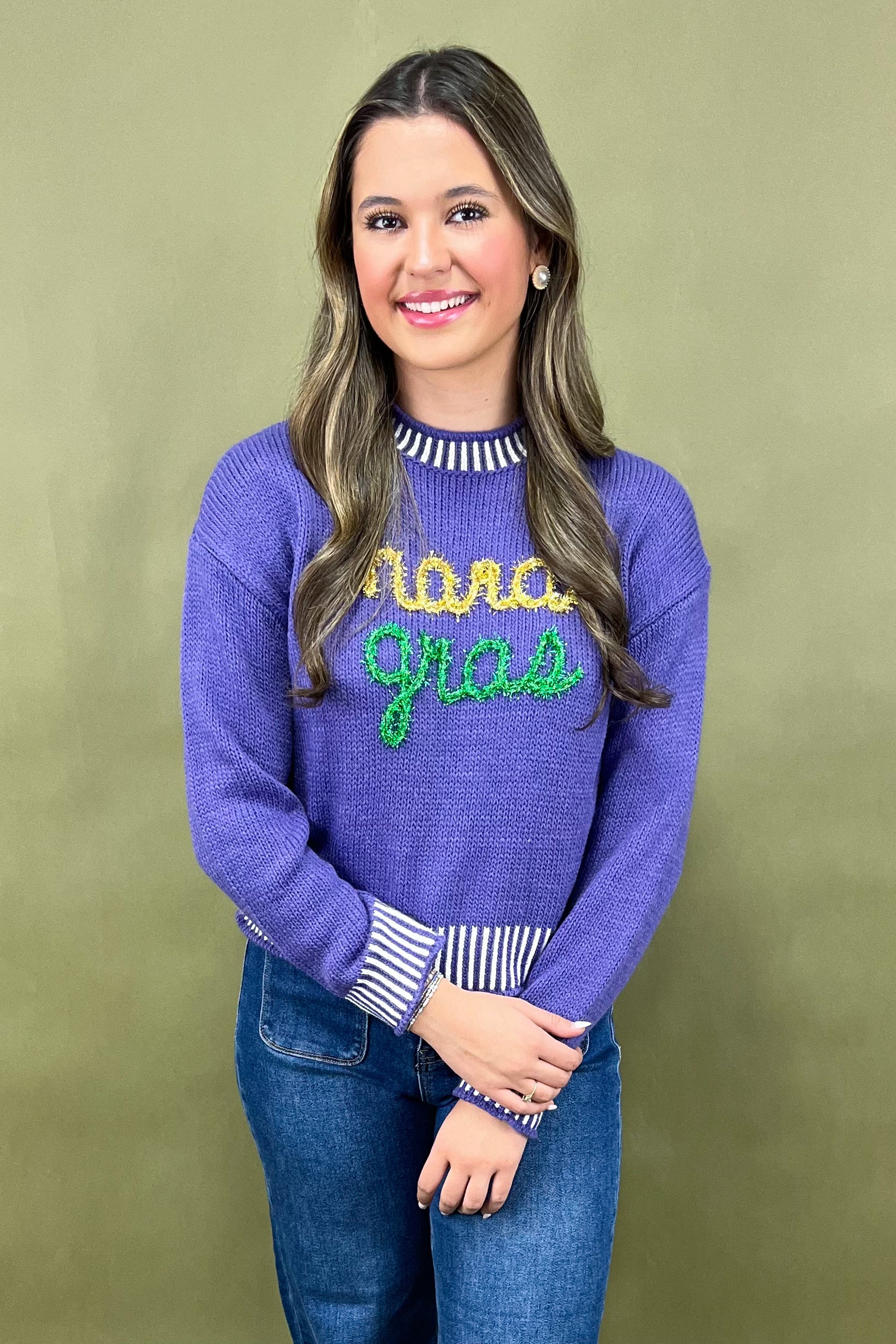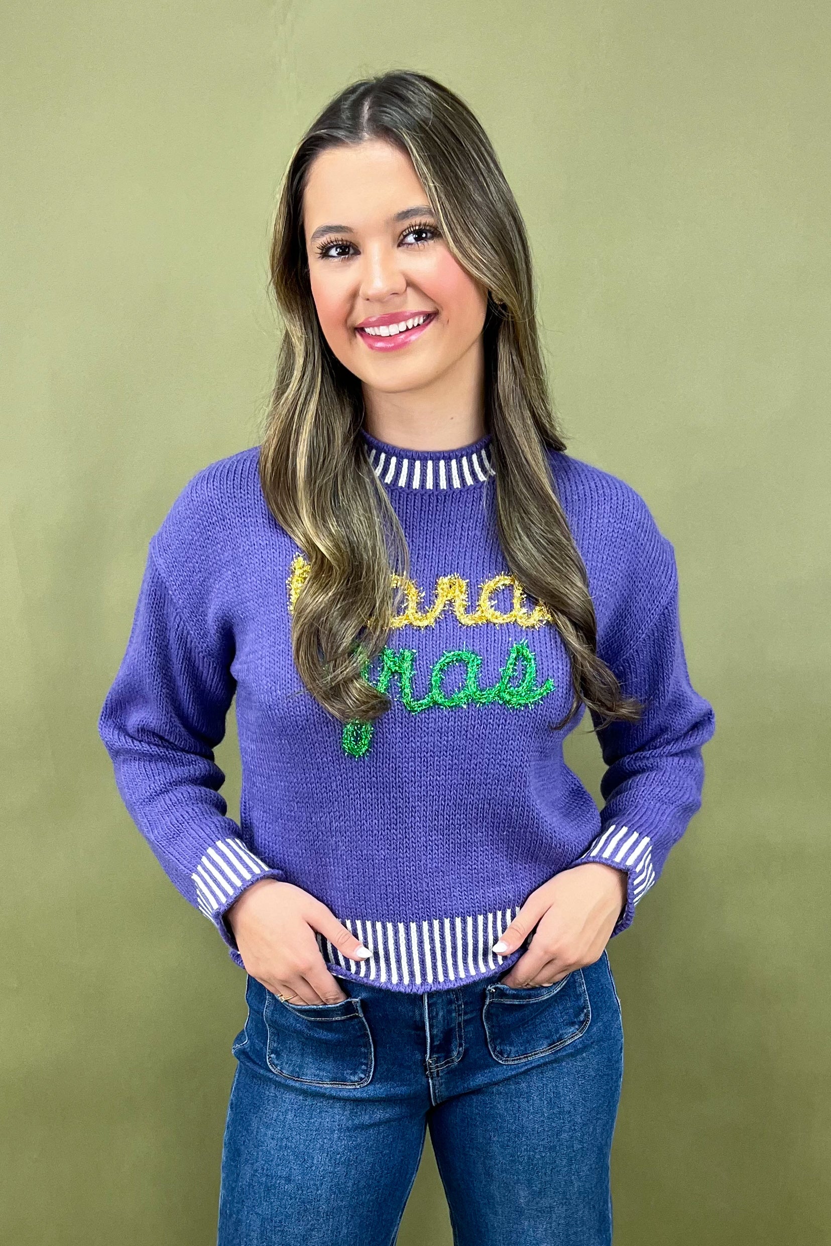 Let the good times roll in style with The Bead Babe Mardi Gras Sweater 💜💚💛 — your go-to piece for parade days, balcony hangs, and king cake brunches! With its rich purple knit and sparkly sequin lettering that spells out “mardi gras” in classic carnival colors, this sweater radiates celebration. It’s cozy enough for cool weather but bold enough to steal the spotlight.