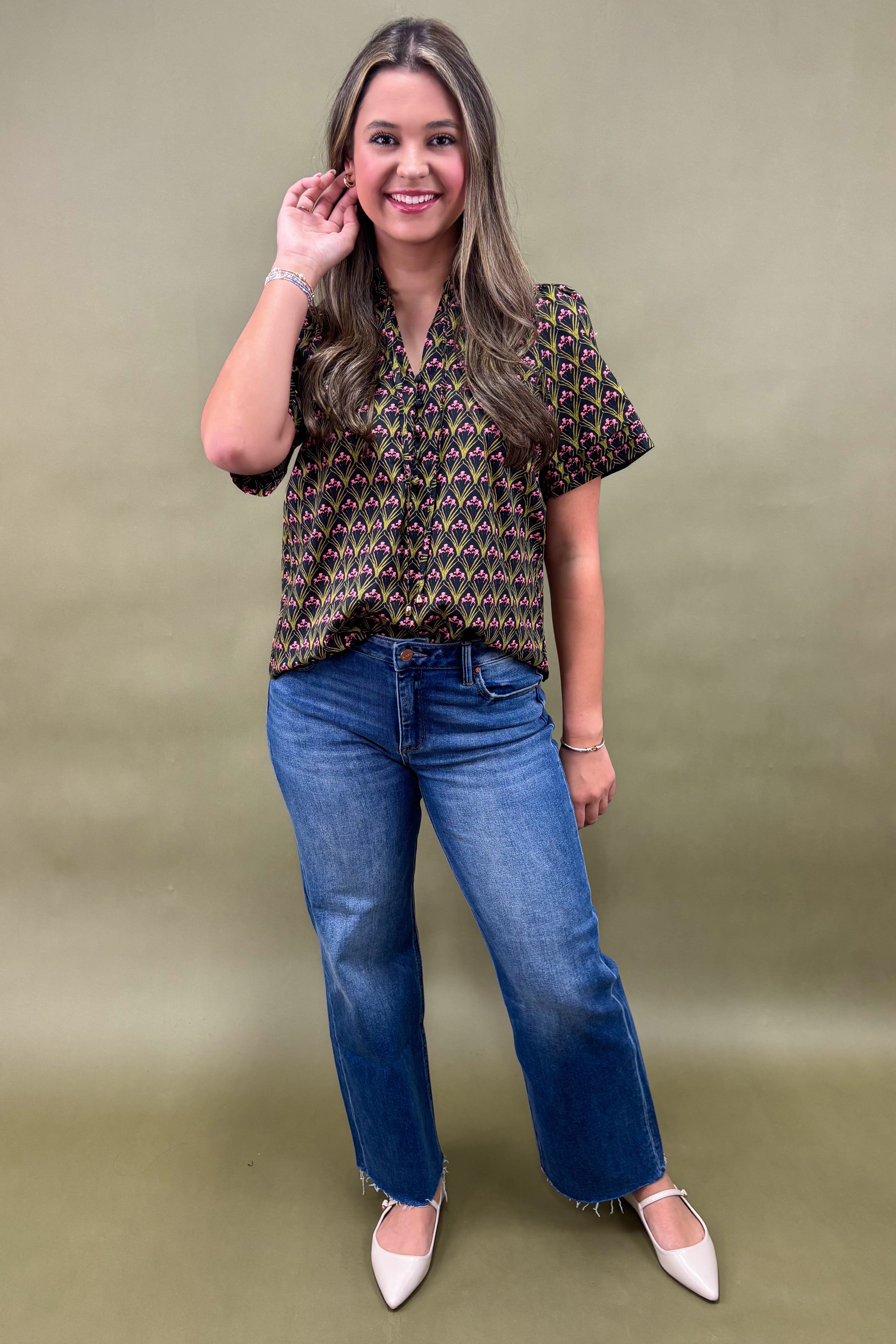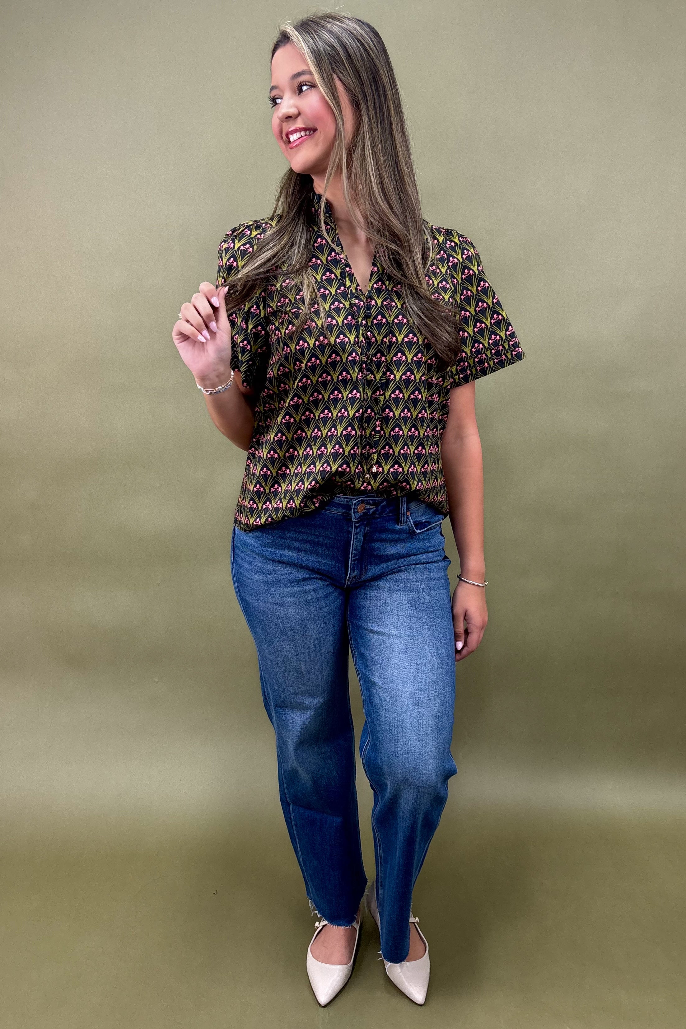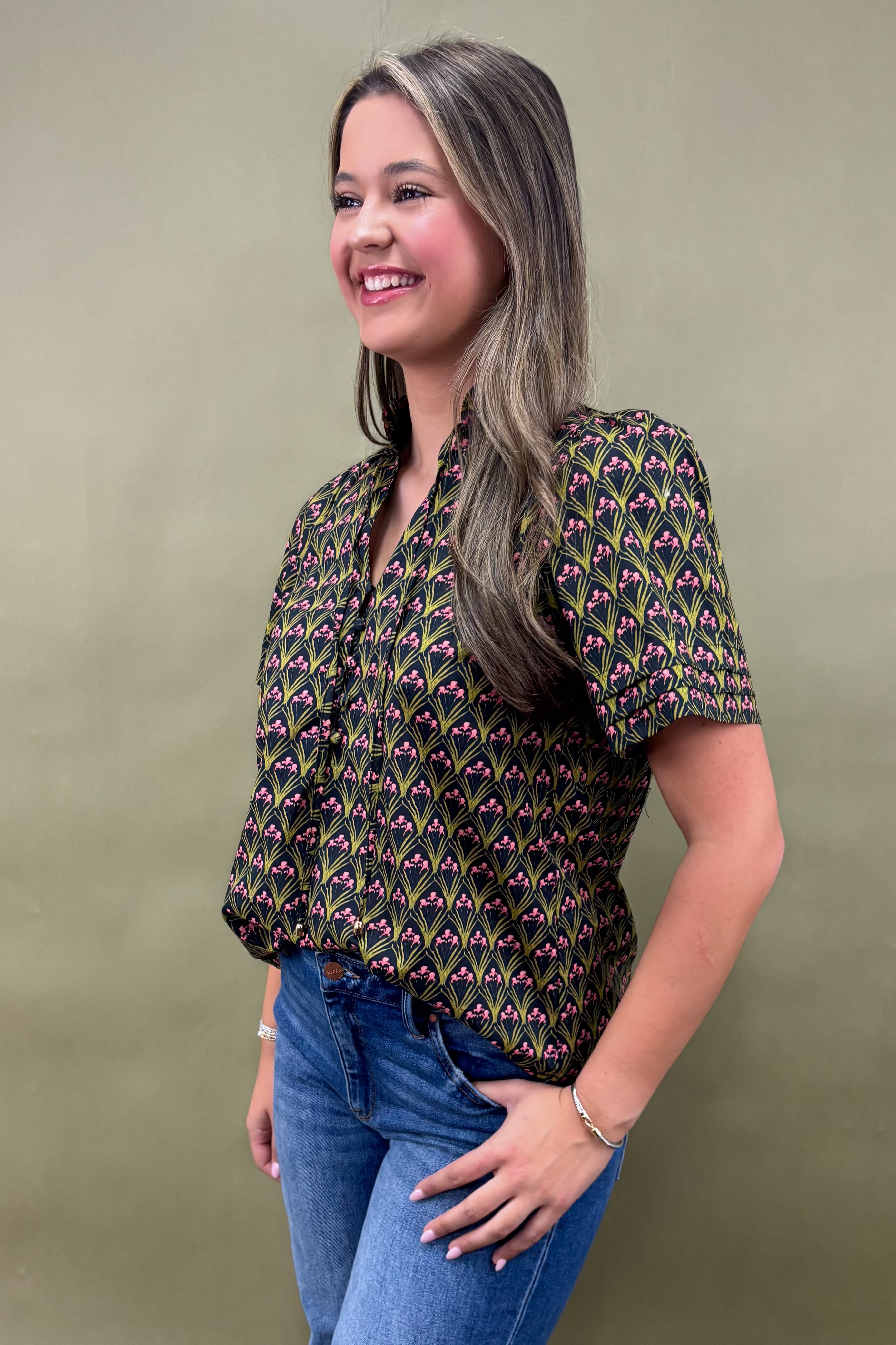 The unique print is the standout feature. Rows of stylized green arches rise upward like elegant fans, each crowned with dainty pink buds. This creates a vibrant, structured rhythm across the fabric that’s both playful and polished. Against the deep black background, the pattern pops beautifully, making the blouse easy to style while still feeling extraordinary.