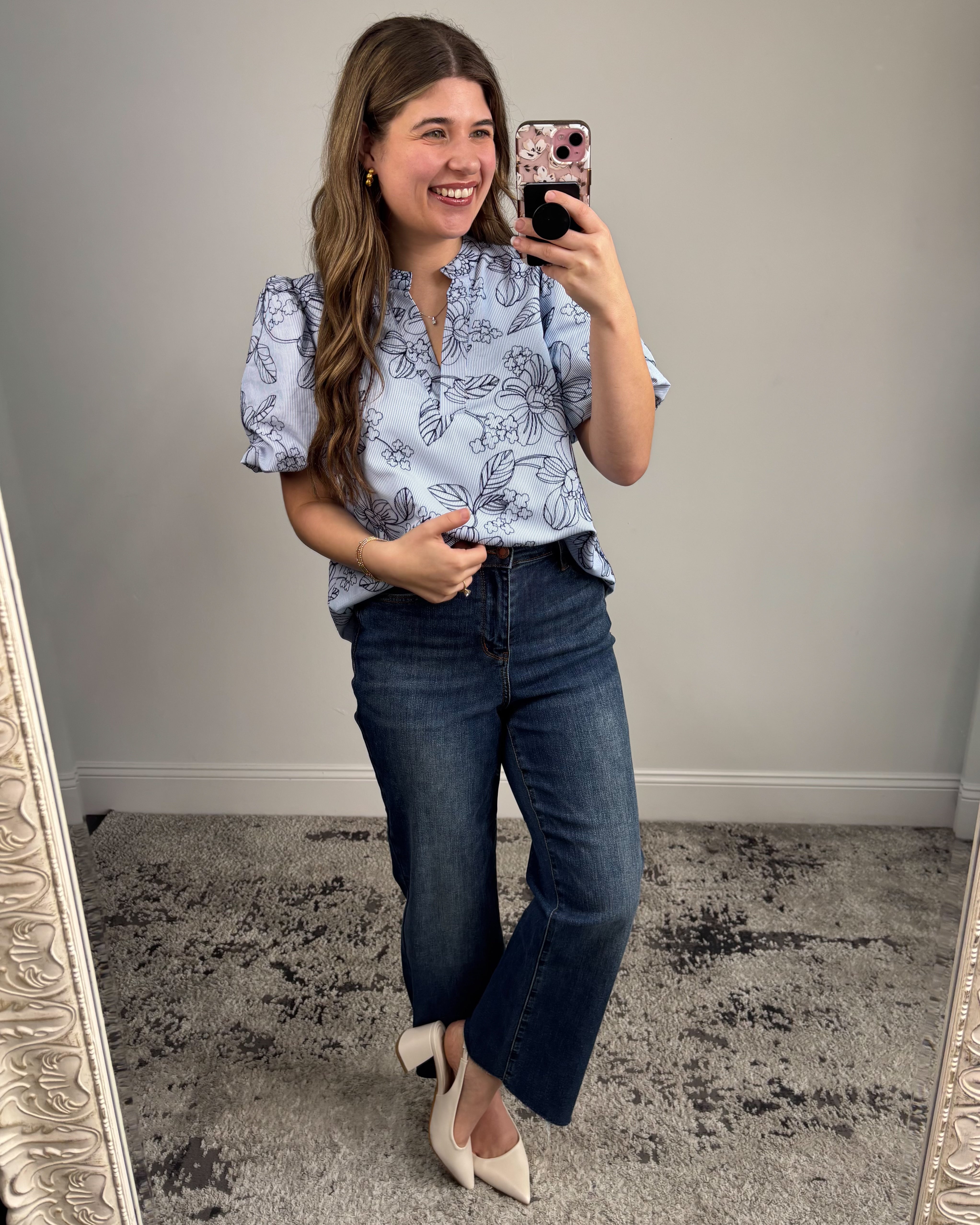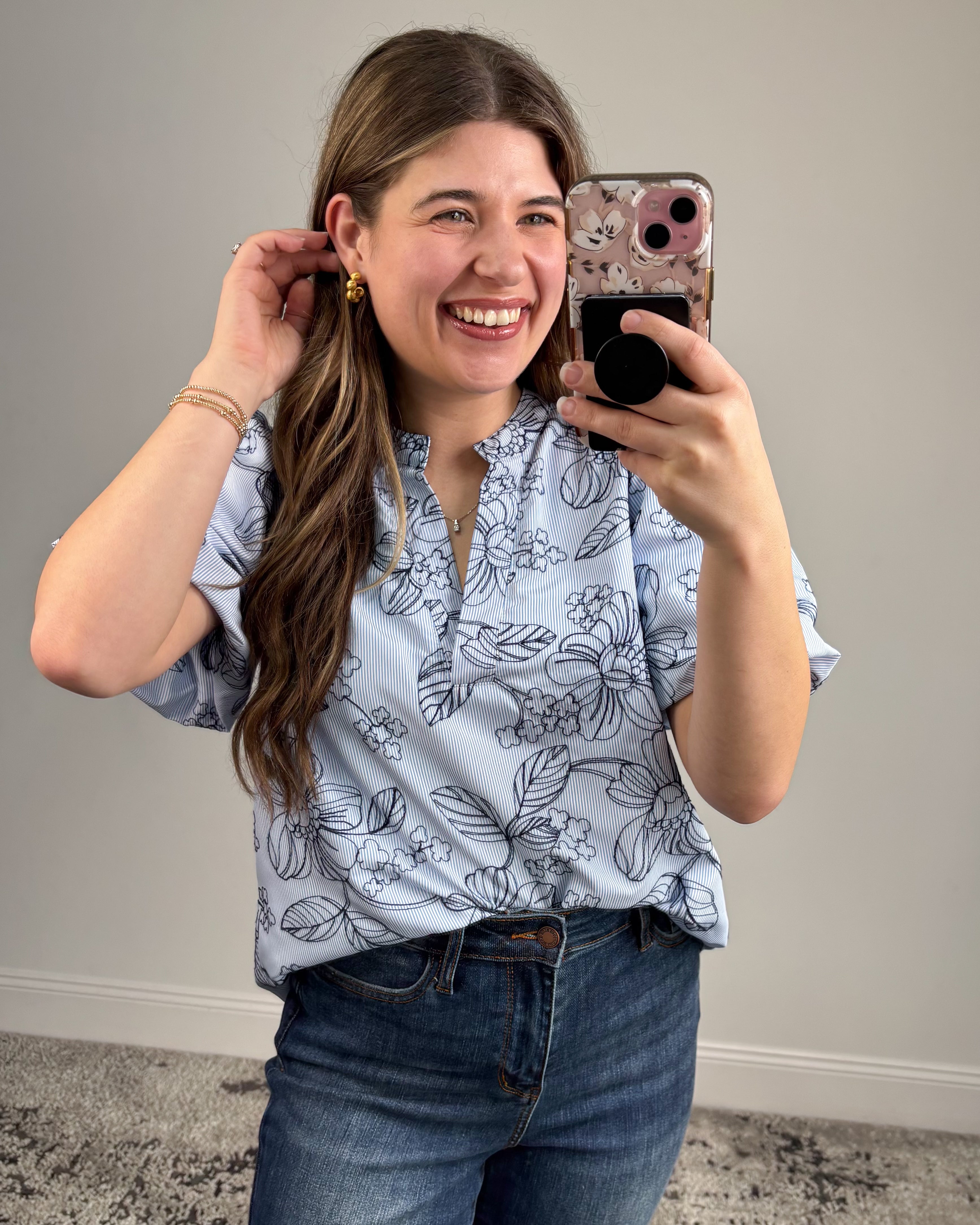 The Blue Meadow Floral Top blends timeless stripes with intricate embroidery, giving you a piece that’s both classic and delightfully unique. It’s comfortable, flattering, and beautifully detailed — the kind of top that makes every outfit feel a little more special. A must-have for your spring and summer rotation! 🌸💙