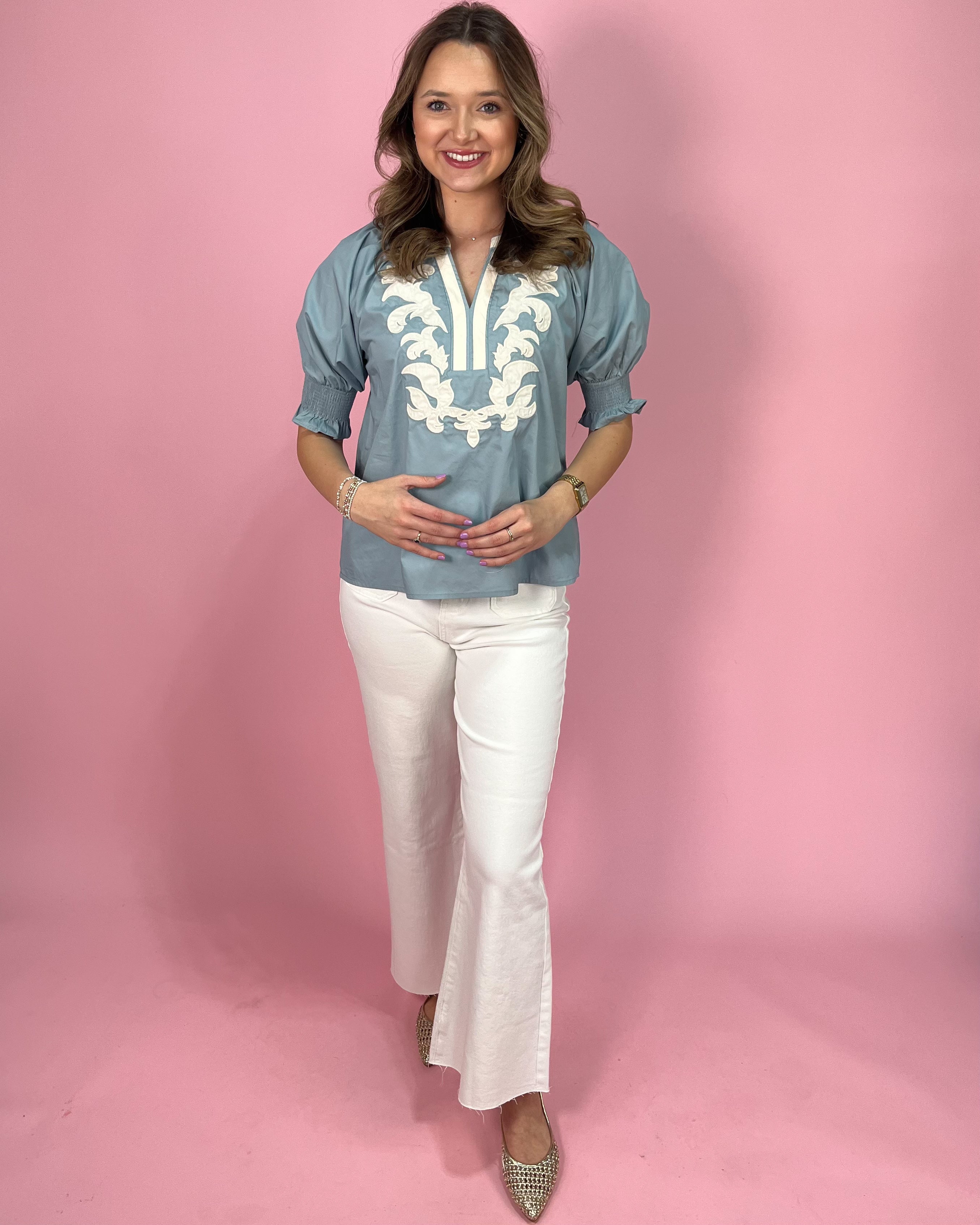 The embroidered detail is truly the star of the show. Framing the neckline in the prettiest way, it adds texture and dimension that makes this piece feel extra special. Finished with puff sleeves and comfy smocked cuffs, it’s equal parts feminine and easy to wear.
