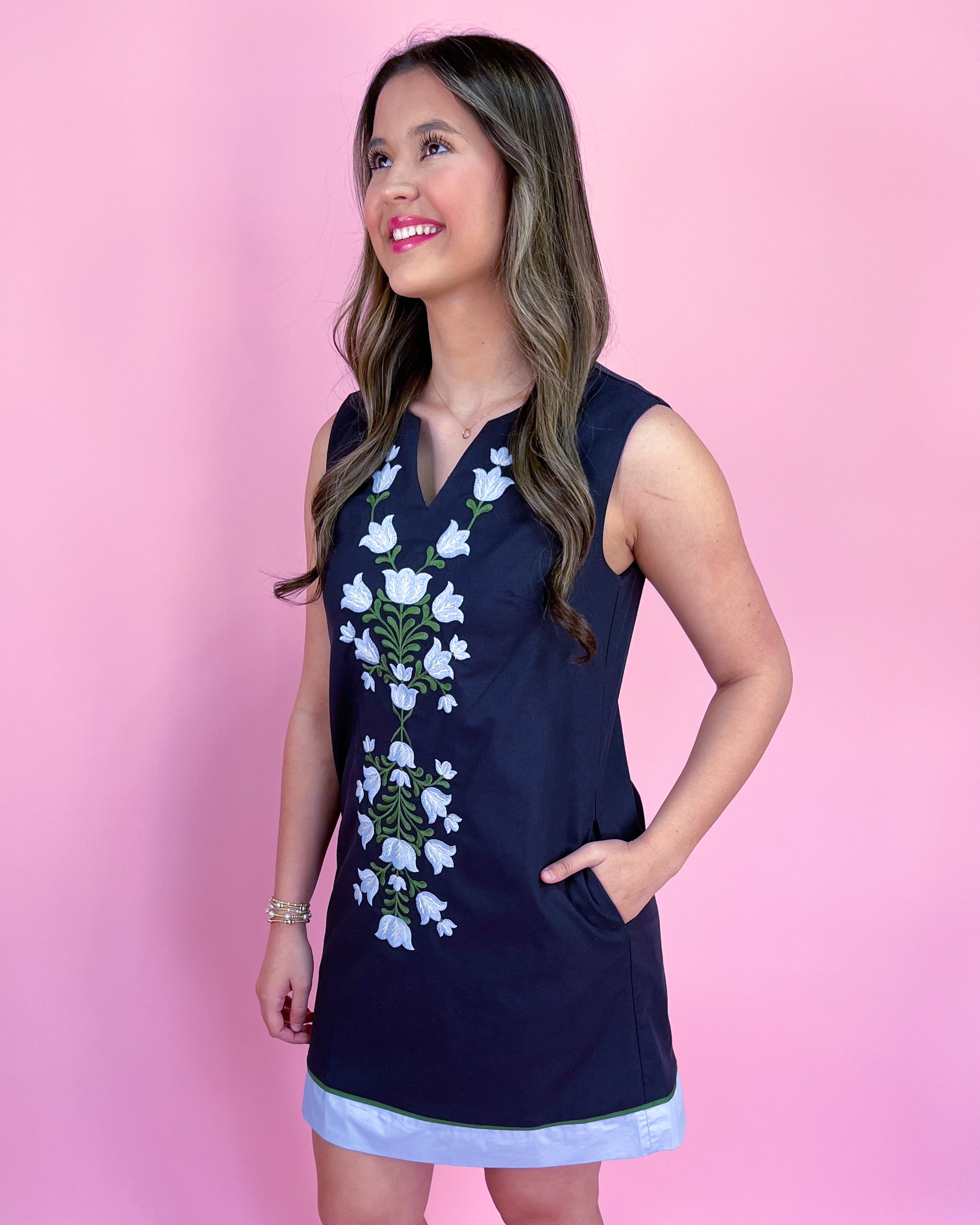 Southern charm meets boutique beauty 💙🌸 This navy mini is giving TOTAL “walk into the room and get compliments” energy 😍 The bold bluebonnet-inspired embroidery down the front is such a showstopper, and it feels so classic + feminine all at once ✨