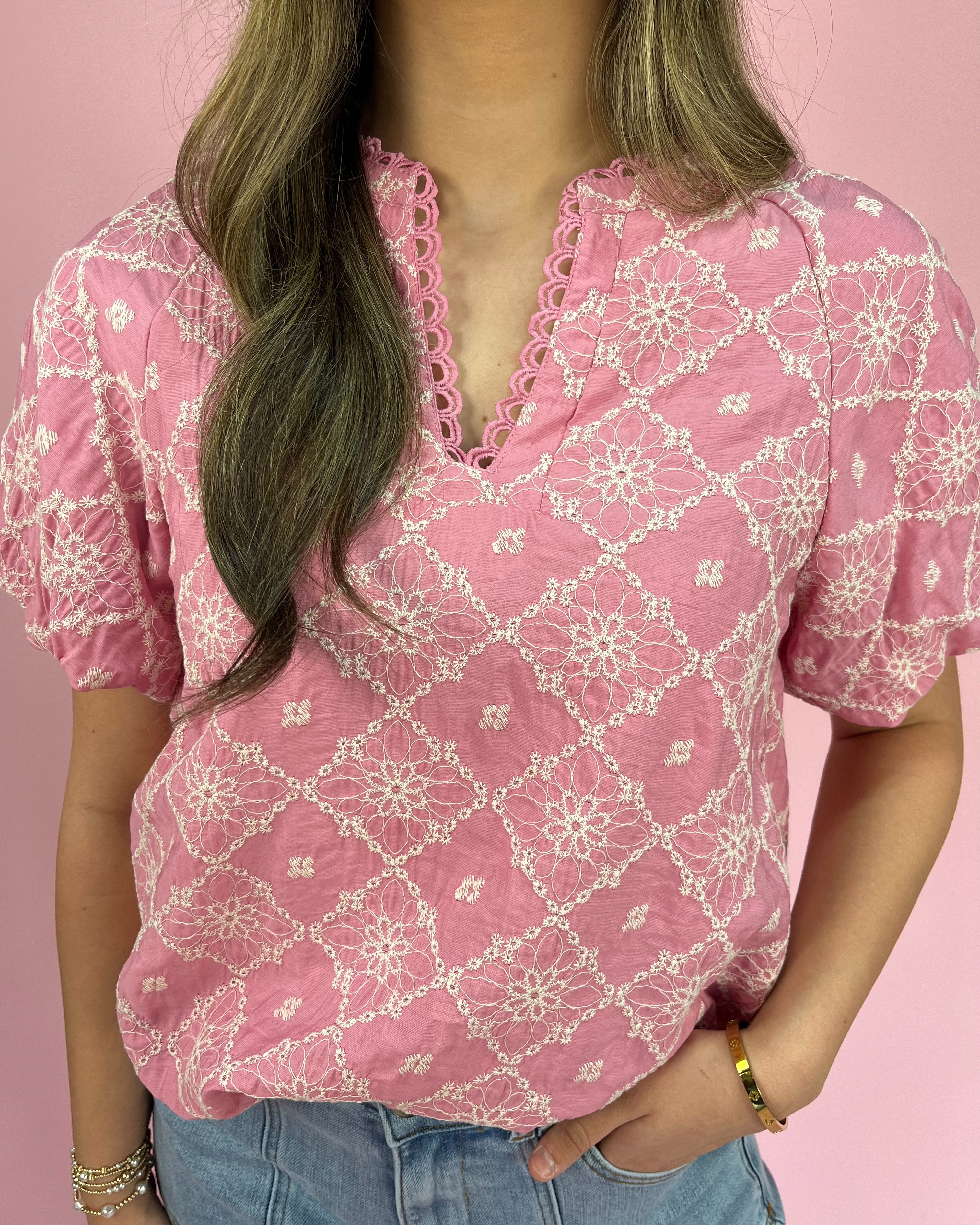 Sweet, feminine, and full of charming detail, the Bubblegum Pink Floral Stitch Short Puff Sleeve Top is the perfect piece for adding a romantic touch to your everyday wardrobe. The vibrant pink hue paired with delicate floral stitching makes this one feel extra special.