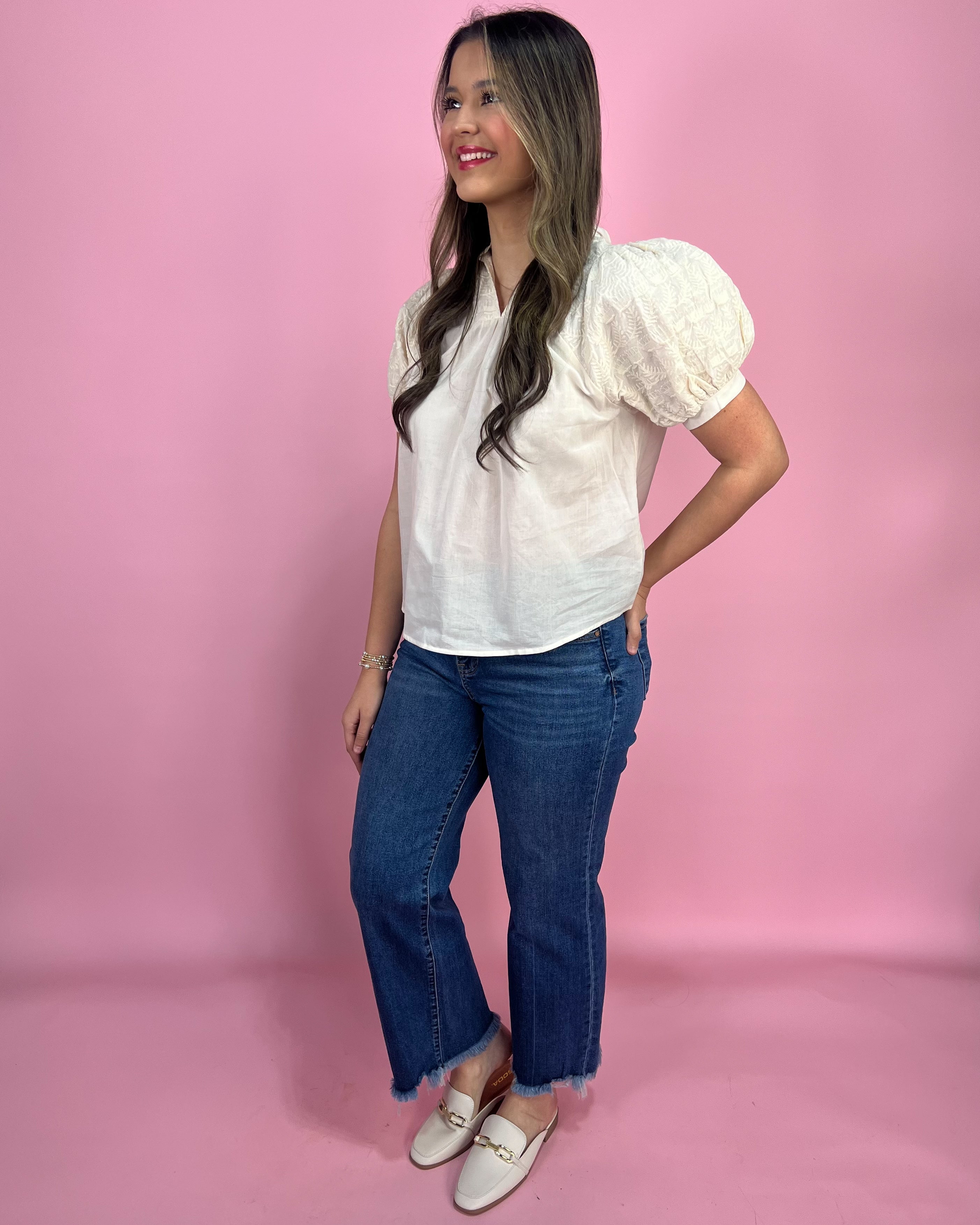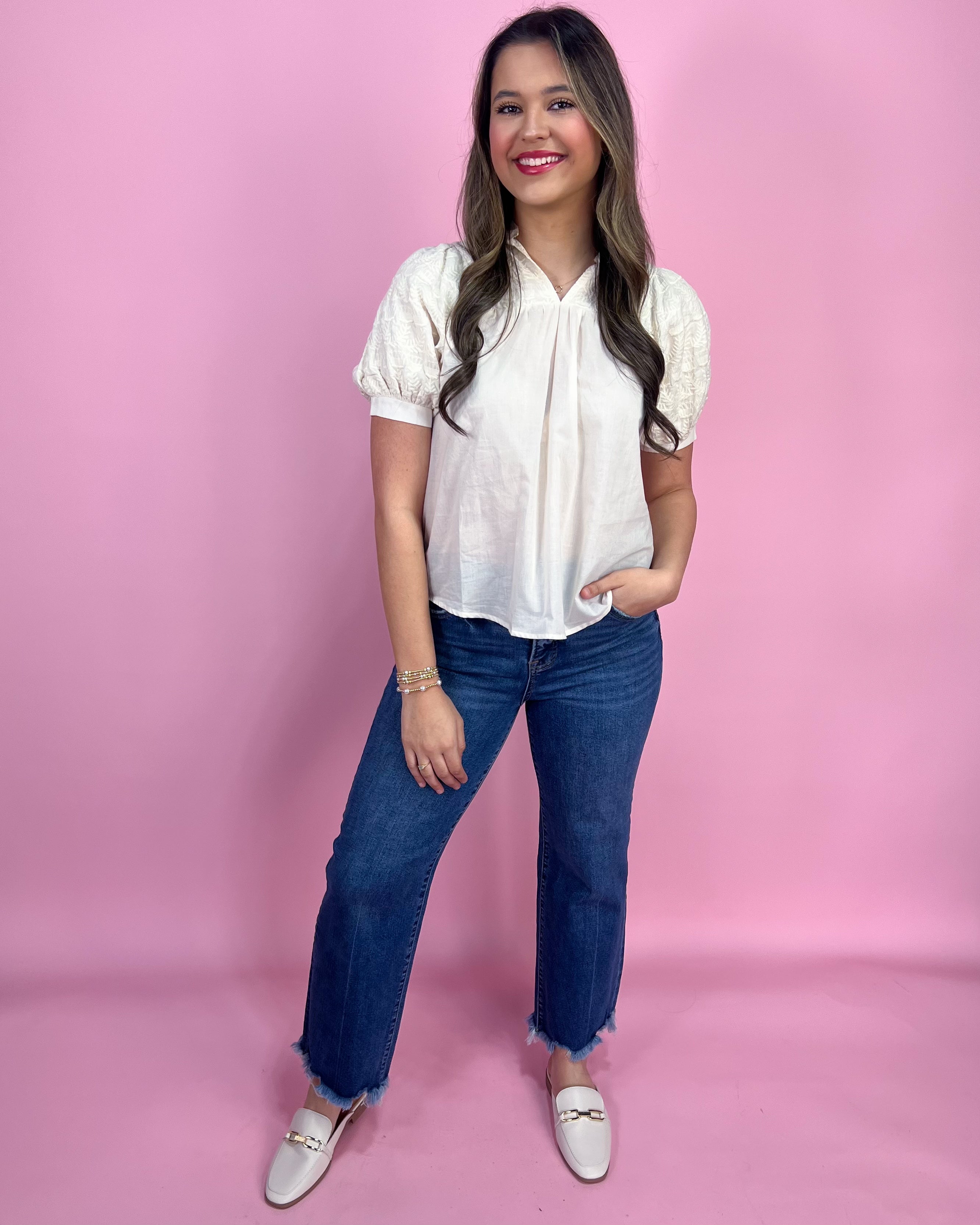 The embroidered puff sleeves are the STAR of the show 🫶🌼 They add the prettiest texture and make the whole top feel extra special (without being too much). Pair it with light wash denim, white shorts, or a flowy midi skirt and you’ve got an easy outfit that looks instantly put-together 💕