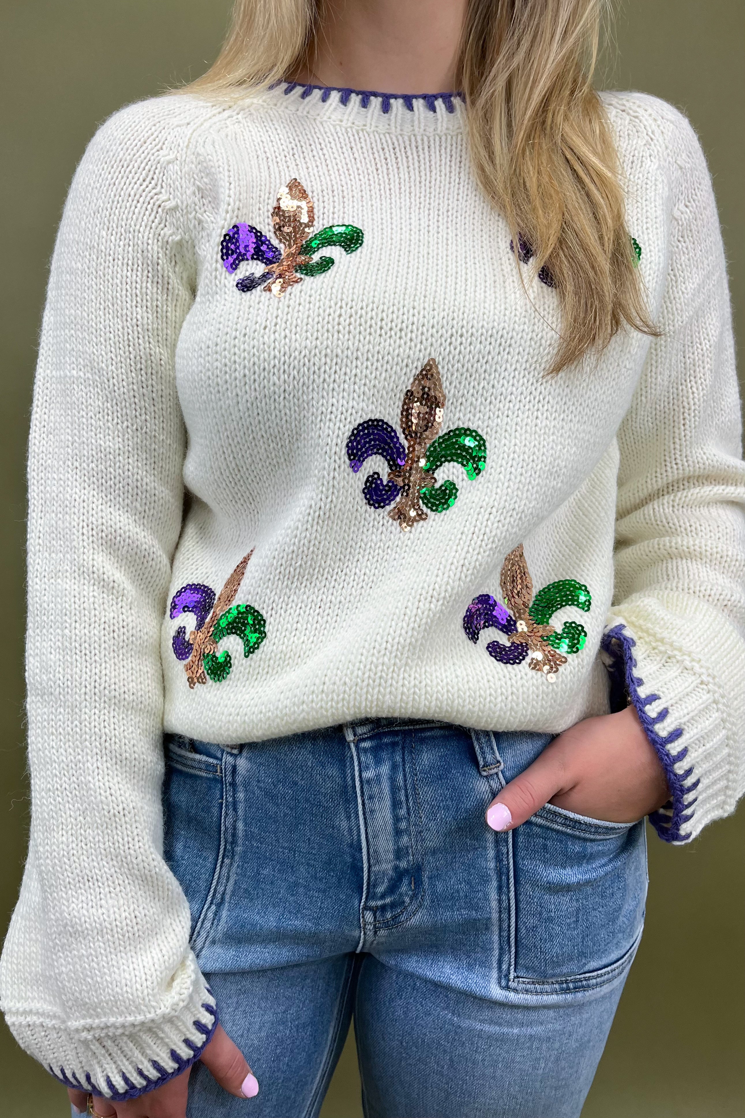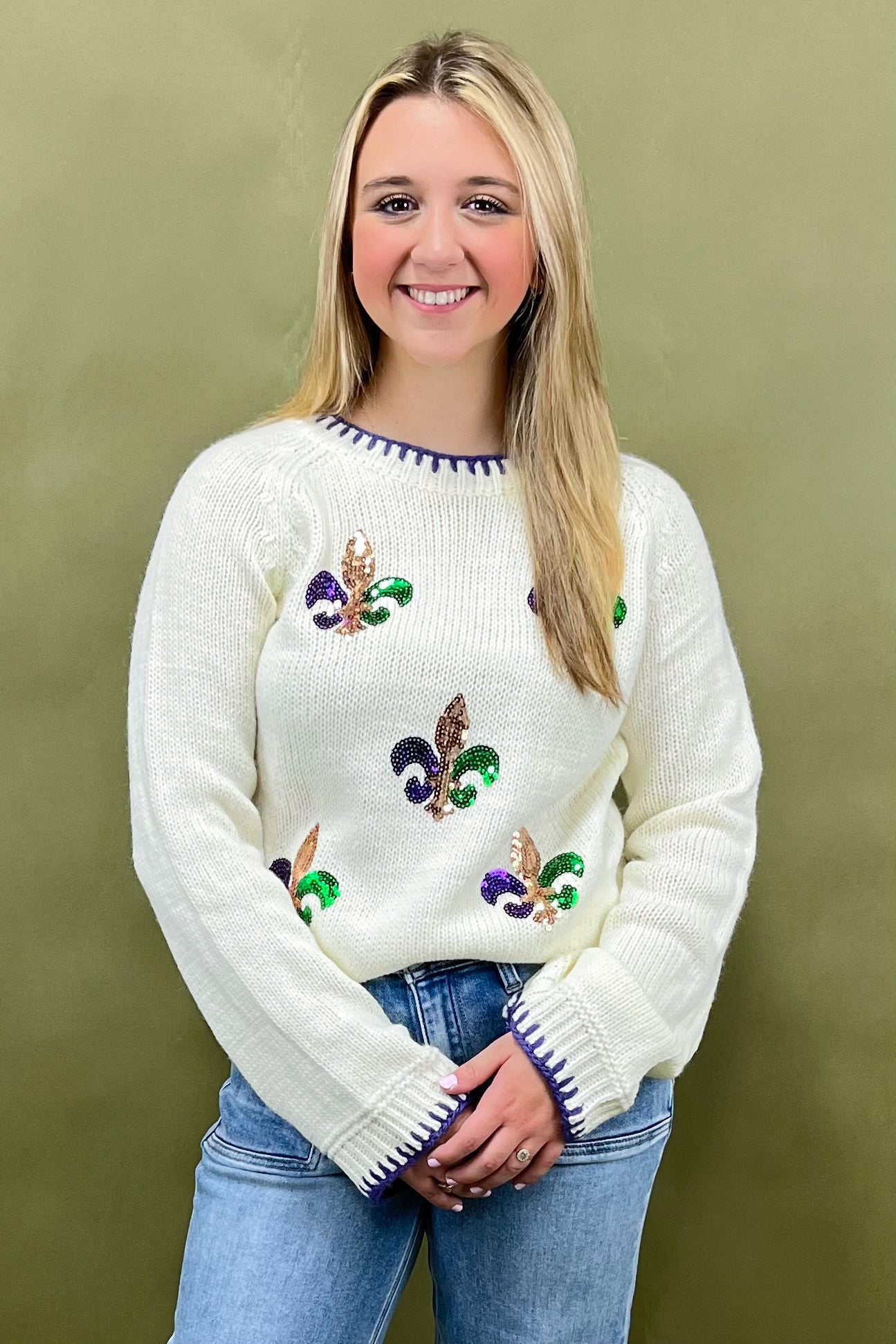 Crafted in a soft ivory knit that feels plush without being heavy, this sweater features five bold, sparkling fleur-de-lis motifs front and center. Each fleur de lis is decked out in vibrant Mardi Gras sequins — purple, gold, and green, of course — adding just the right amount of shimmer to make you glow in any light. Whether you’re standing under parade spotlights or sipping hot cocoa waiting for the floats to roll, this sweater catches every sparkle and every compliment. 💫💁♀️