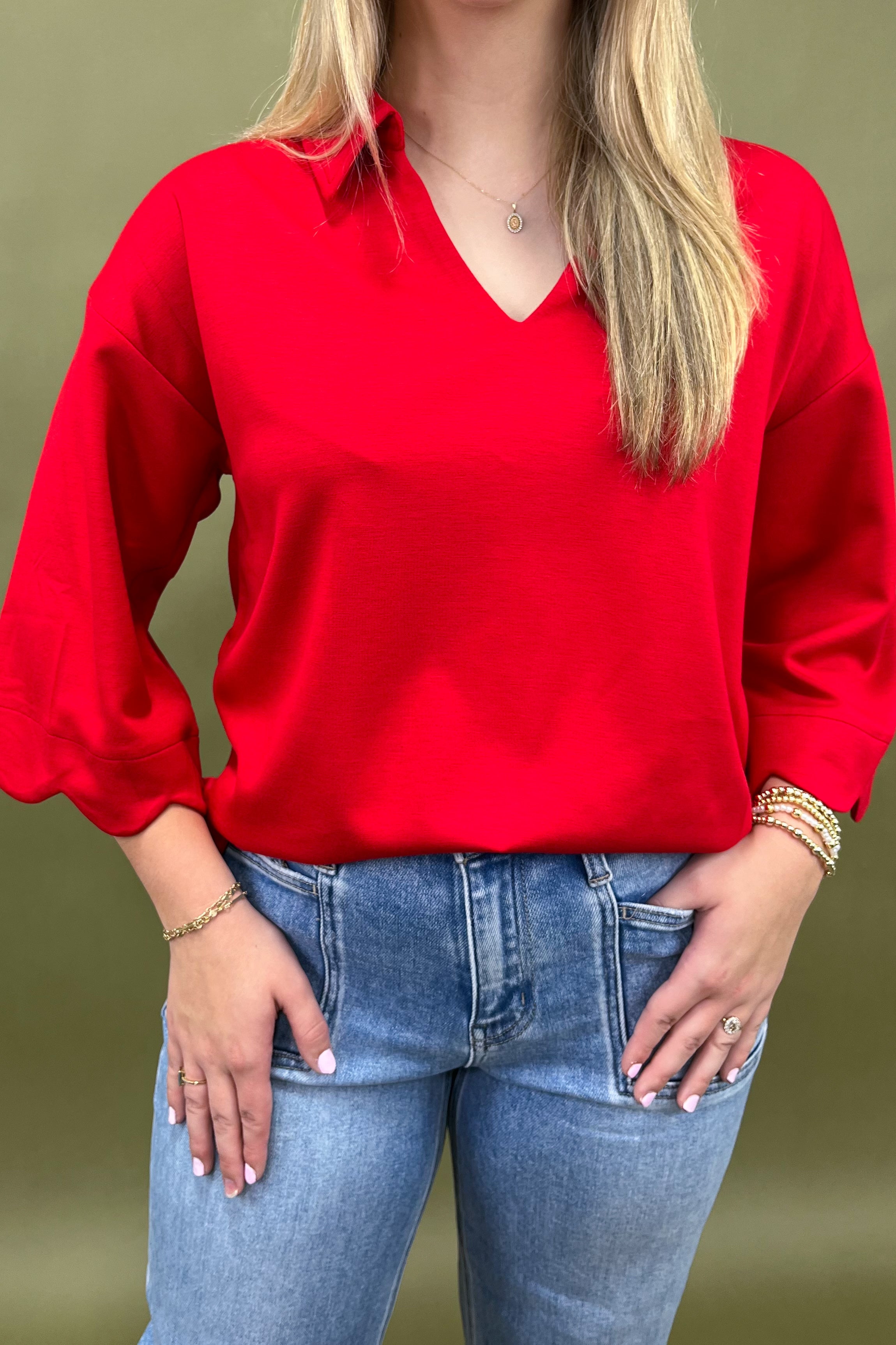 Made from a super-soft blend of rayon, polyester, and spandex, this top delivers a silky-smooth feel with just the right amount of stretch. It drapes beautifully and moves with you, making it a go-to for comfort that never sacrifices style. The collared neckline with a subtle V-cut gives off chic, polished vibes, while the scalloped hem and sleeves add that perfect touch of boutique charm. It’s giving "classic, but make it cute." 💃