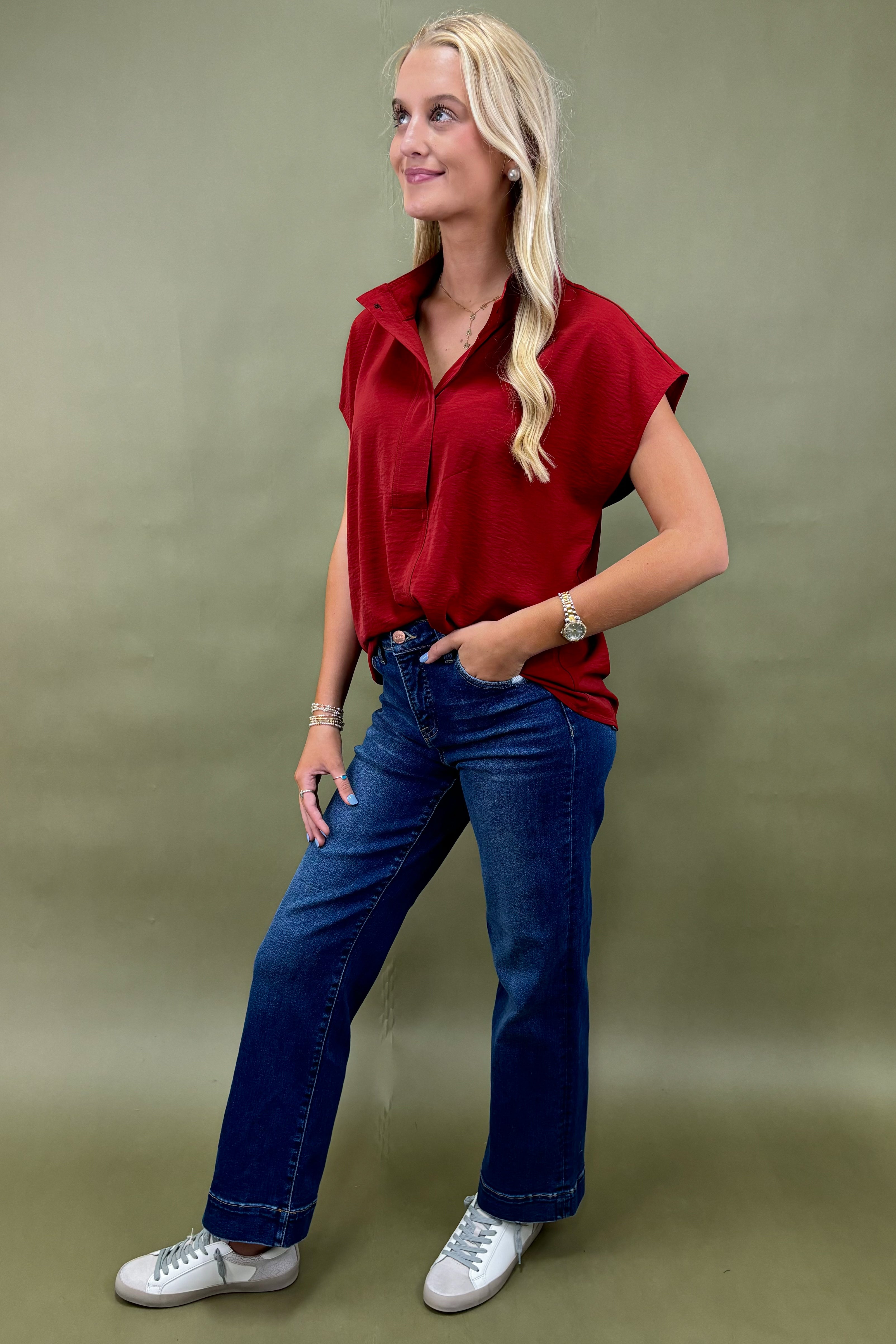 The snap-front design is what makes this top so practical and chic. Whether you prefer it fully fastened for a sleek look, or left slightly open at the neckline for a more relaxed vibe, you can style it to fit any mood. The hidden snaps keep the front looking seamless, ensuring a smooth, tailored finish without the fuss of buttons.