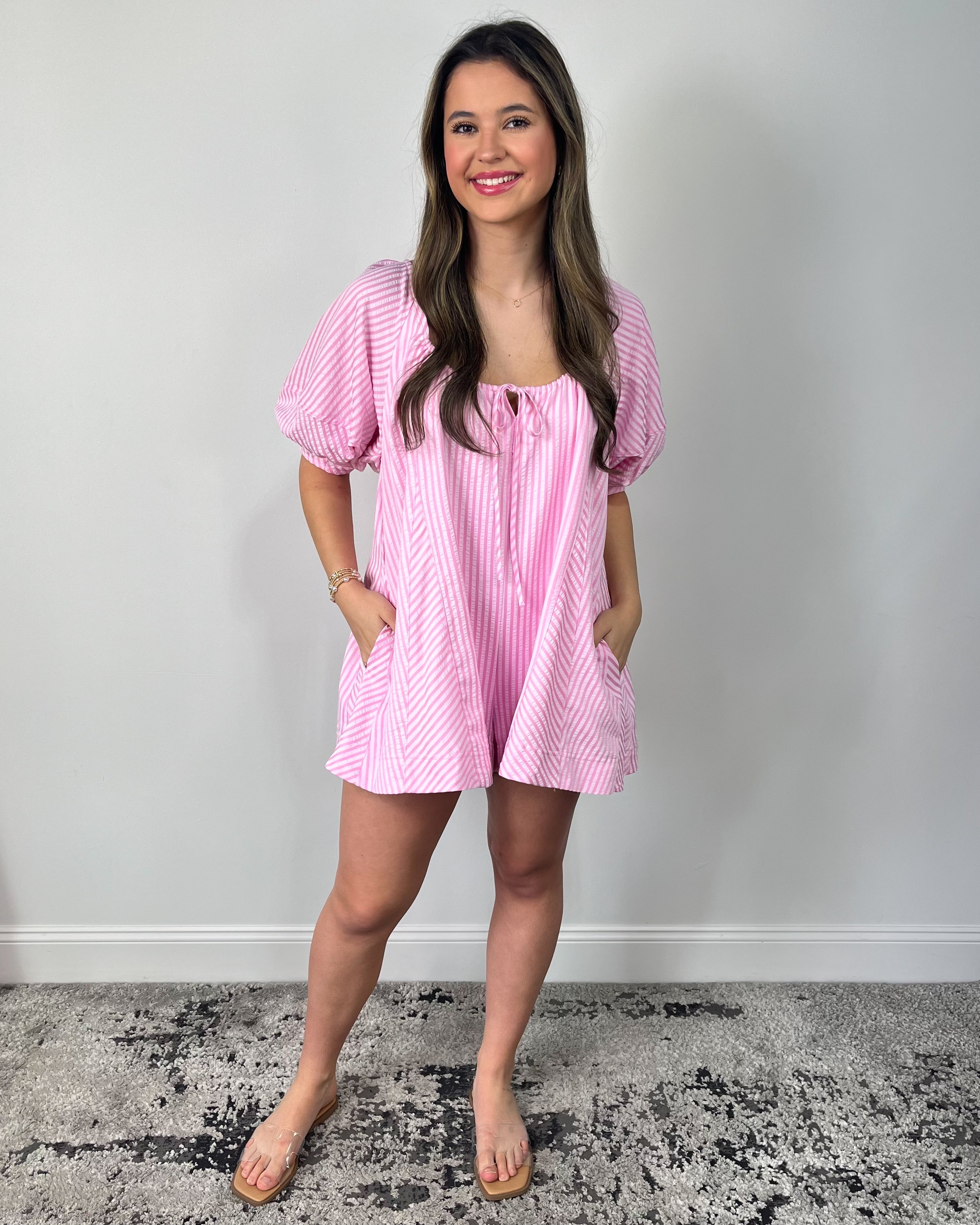 Meet the Cotton Candy Cutie Striped Romper, the sweetest little one-and-done outfit to float right into your spring lineup. This darling romper features a candy-pink and white textured stripe that instantly gives “fairytale picnic,” “pastel daydream,” and “Southern sweetheart” all at once. The fabric has a subtle sheen and a raised stripe that feels luxe and playful at the same time.