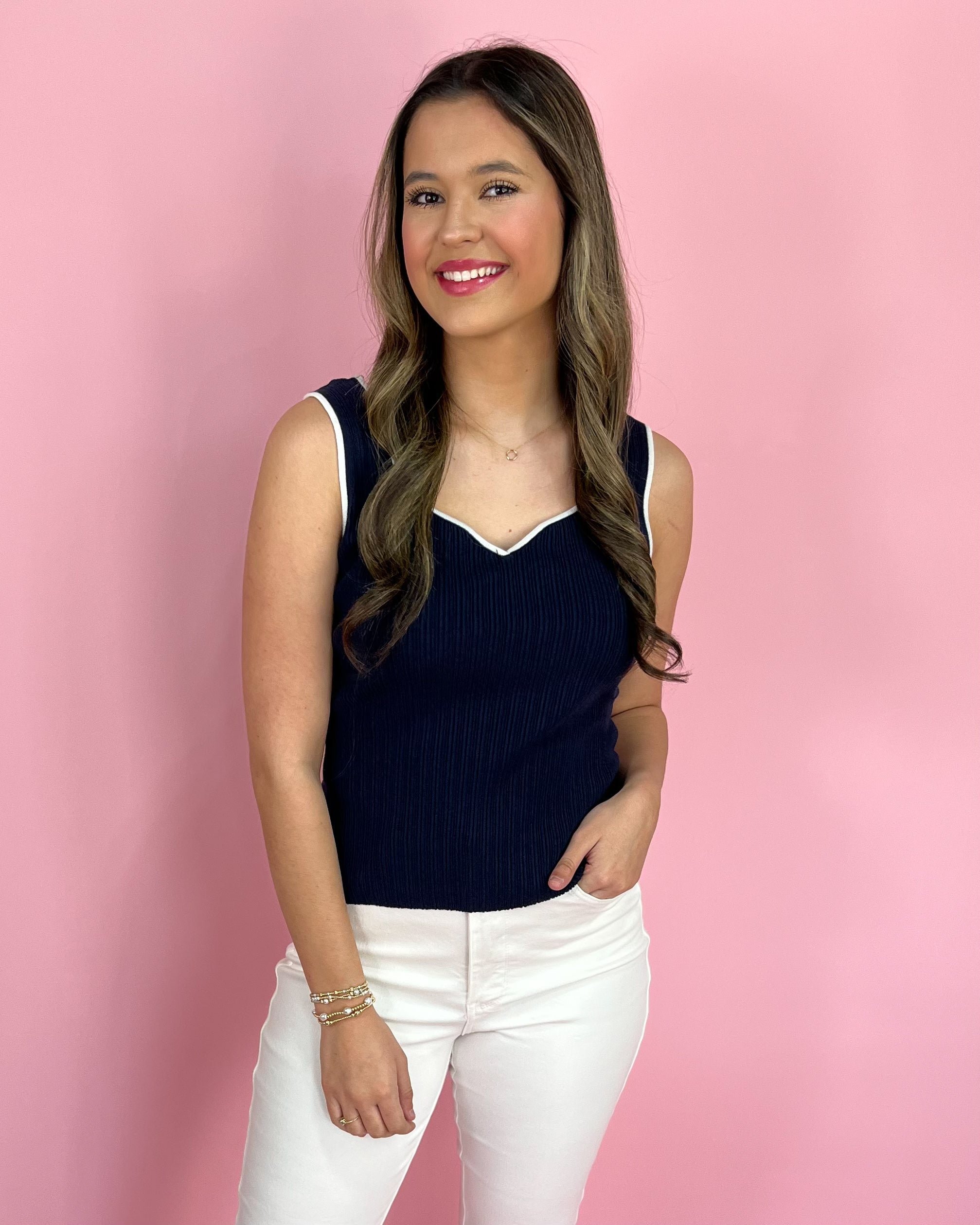 Preppy, polished, and the definition of a staple ⚓💙 This ribbed tank gives that clean “country club cute” vibe with the crisp white trim and the most flattering neckline 😍 It’s one of those pieces you can wear a million different ways and always look put together