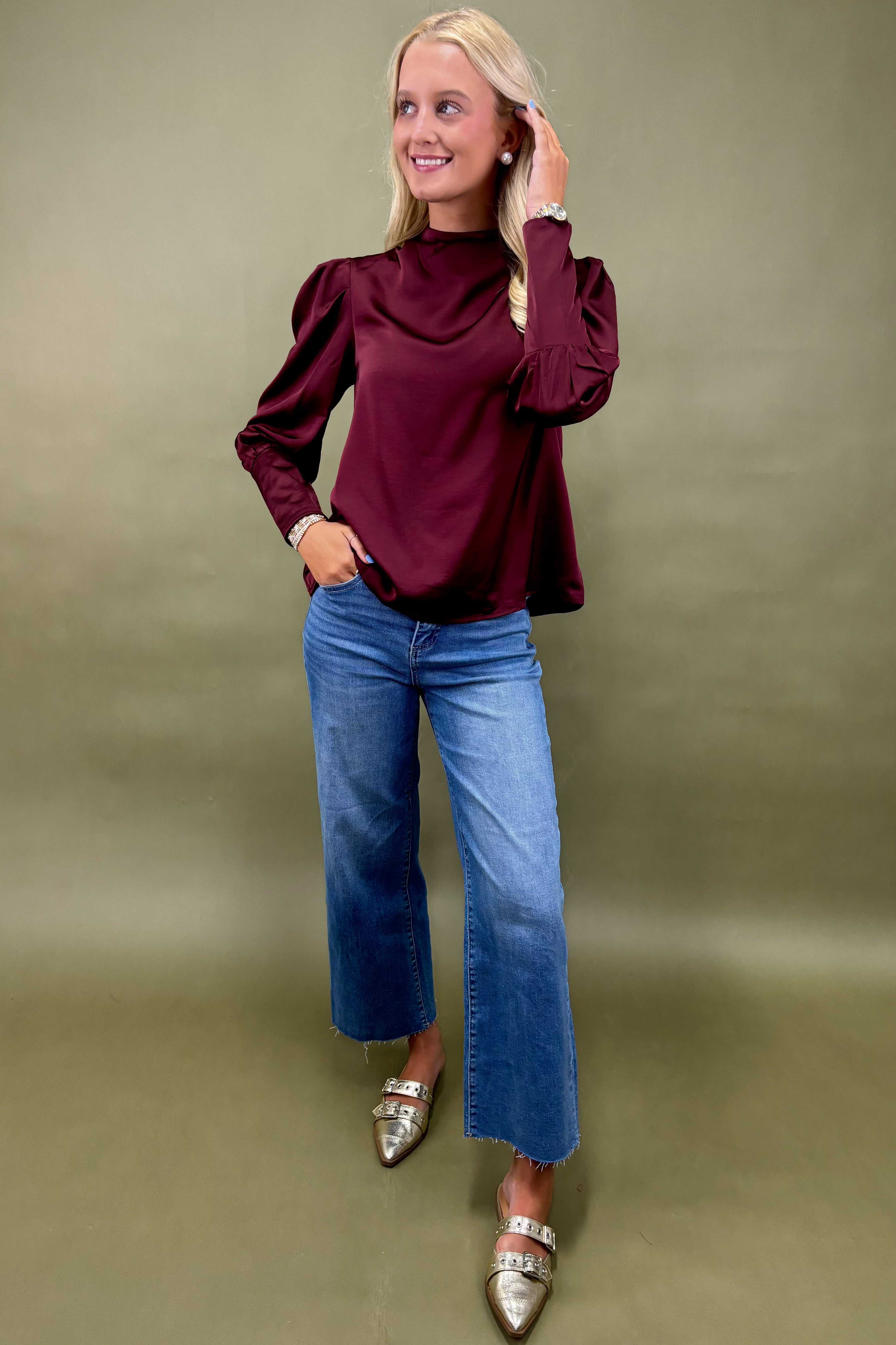 This top is designed with a beautiful, draped neckline that softly falls for an effortlessly elegant look. Unlike your standard burgundy blouse, this one carries subtle detailing that elevates it from everyday wear to something truly special. The drape frames the face beautifully and adds an air of sophistication, making it ideal for both day and night occasions. Whether you’re pairing it with sleek trousers for work, a leather skirt for date night, or distressed denim for a high-low fashion moment, this top brings balance, class, and versatility to your outfit.