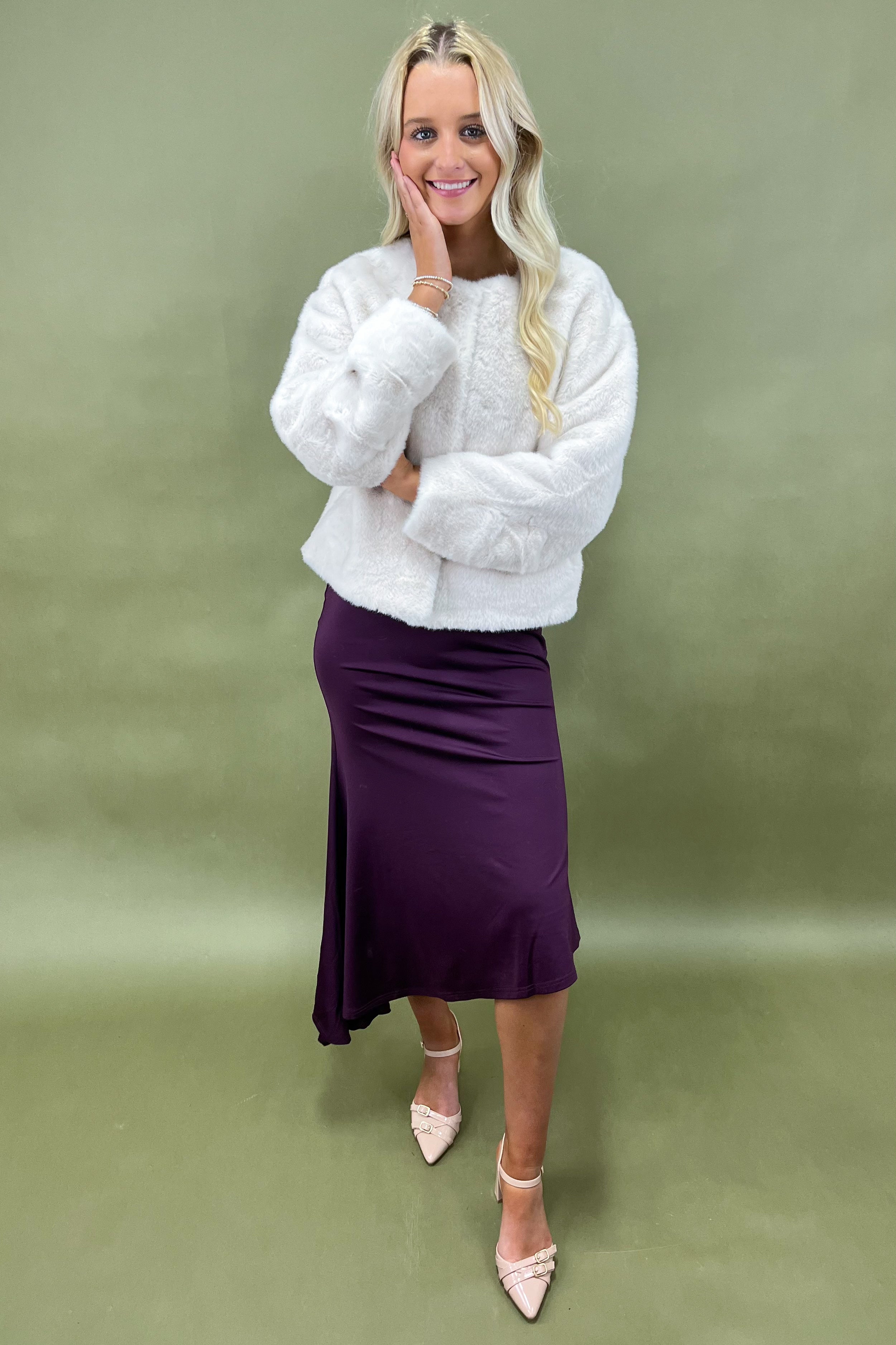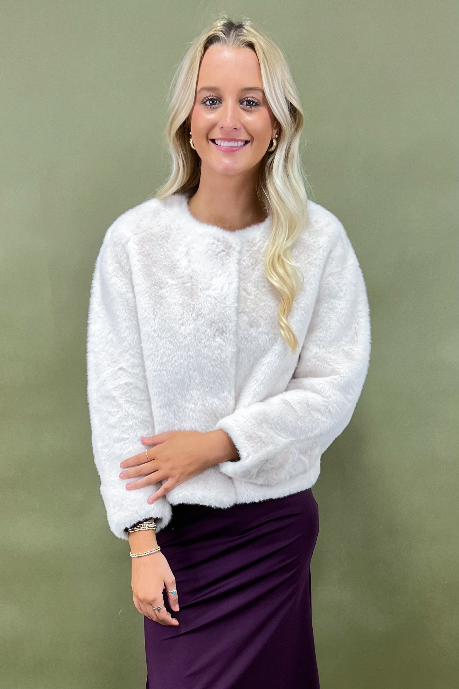 The creamy ivory shade gives pure winter wonderland vibes — light, airy, and endlessly elegant. Unlike darker coats, she brightens up every outfit and instantly elevates your look. The open-front, collarless design keeps things sleek and modern, while the plush faux fur texture feels luxe without being fussy.