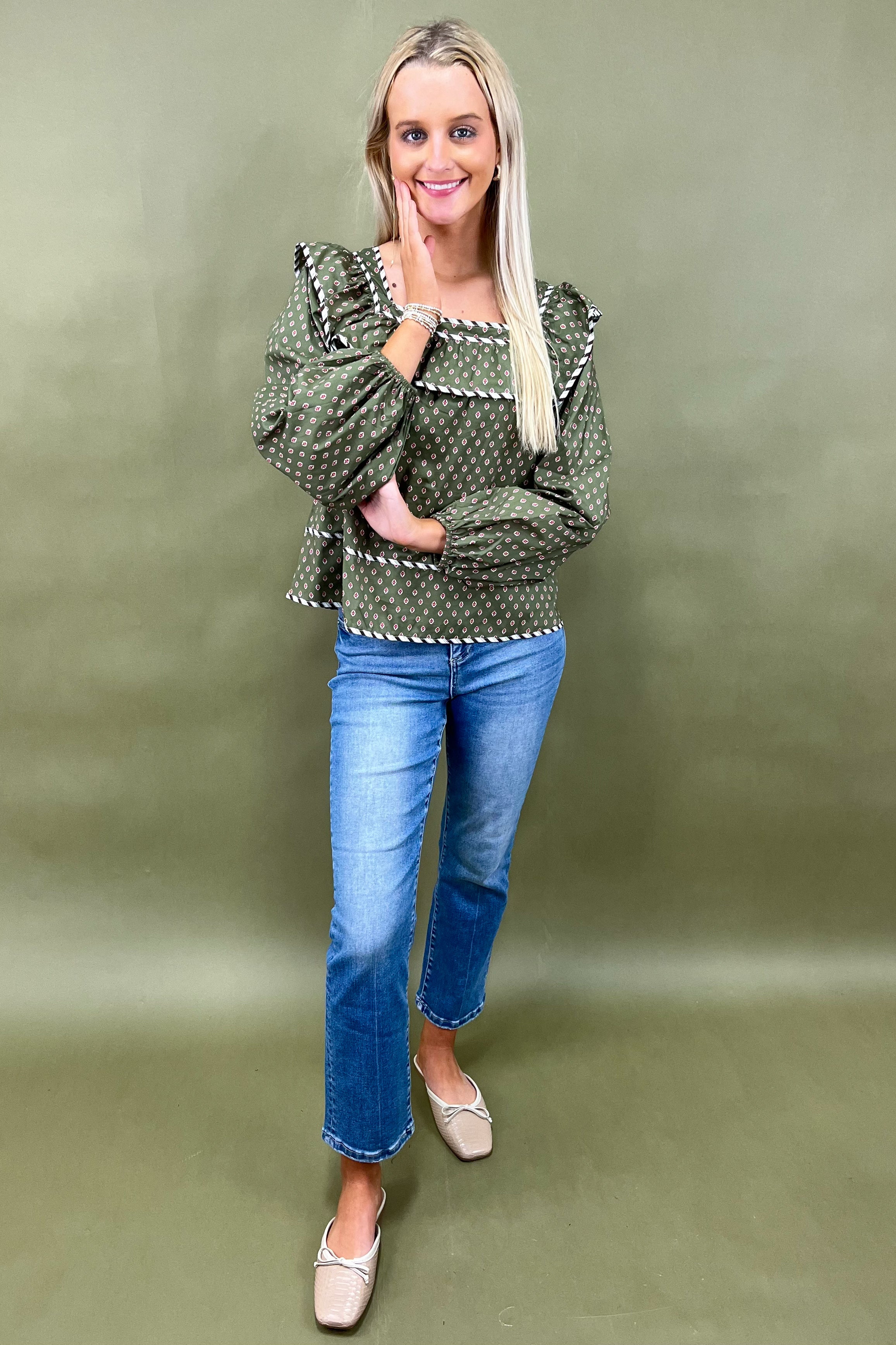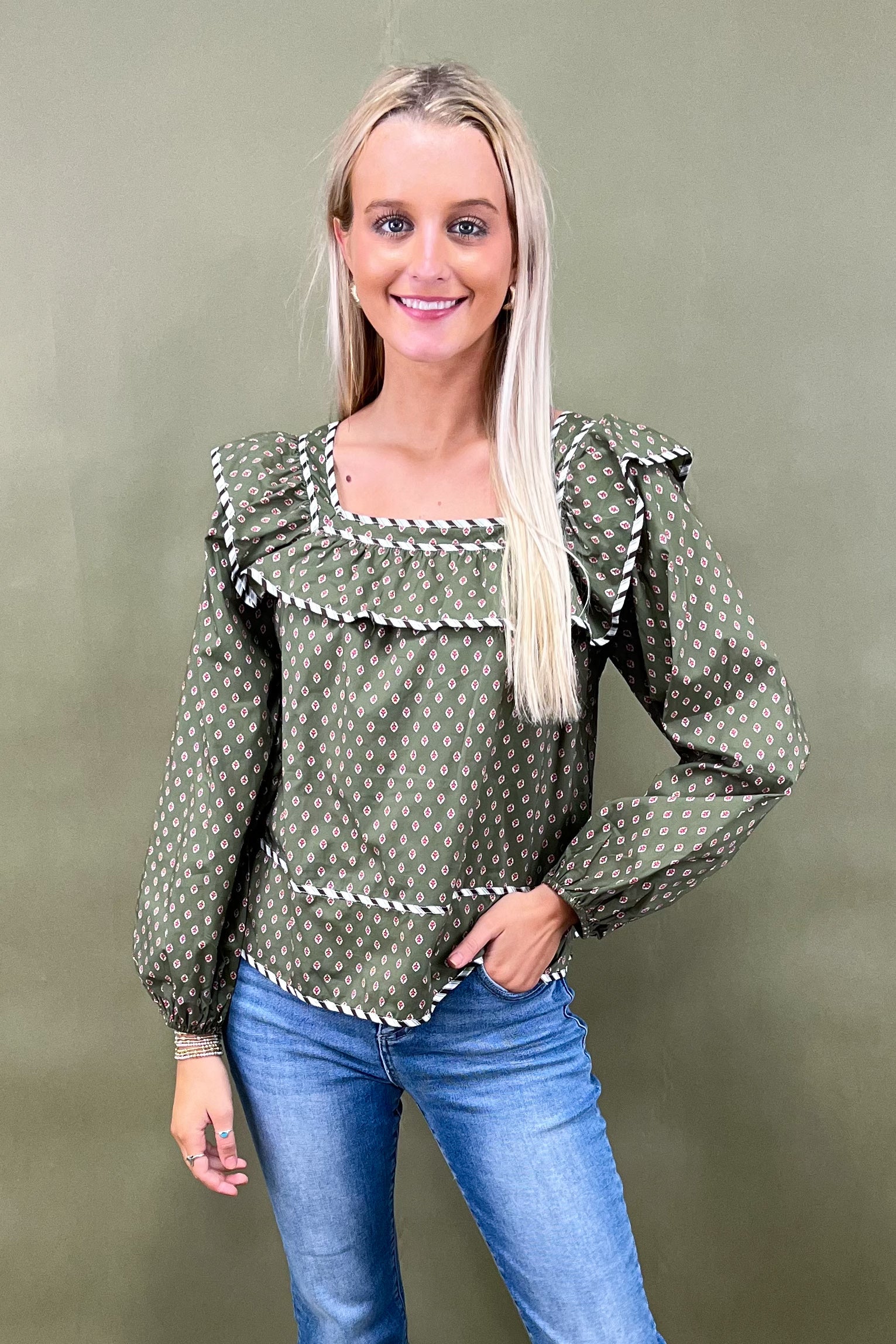 It’s soft, flirty, and just the right amount of fancy — ideal for twirling through fall markets, sipping coffee at your favorite café, or stealing the show on date night. With its dainty olive print and flowy silhouette, it’s a top that makes every day feel just a little more special. 🌸