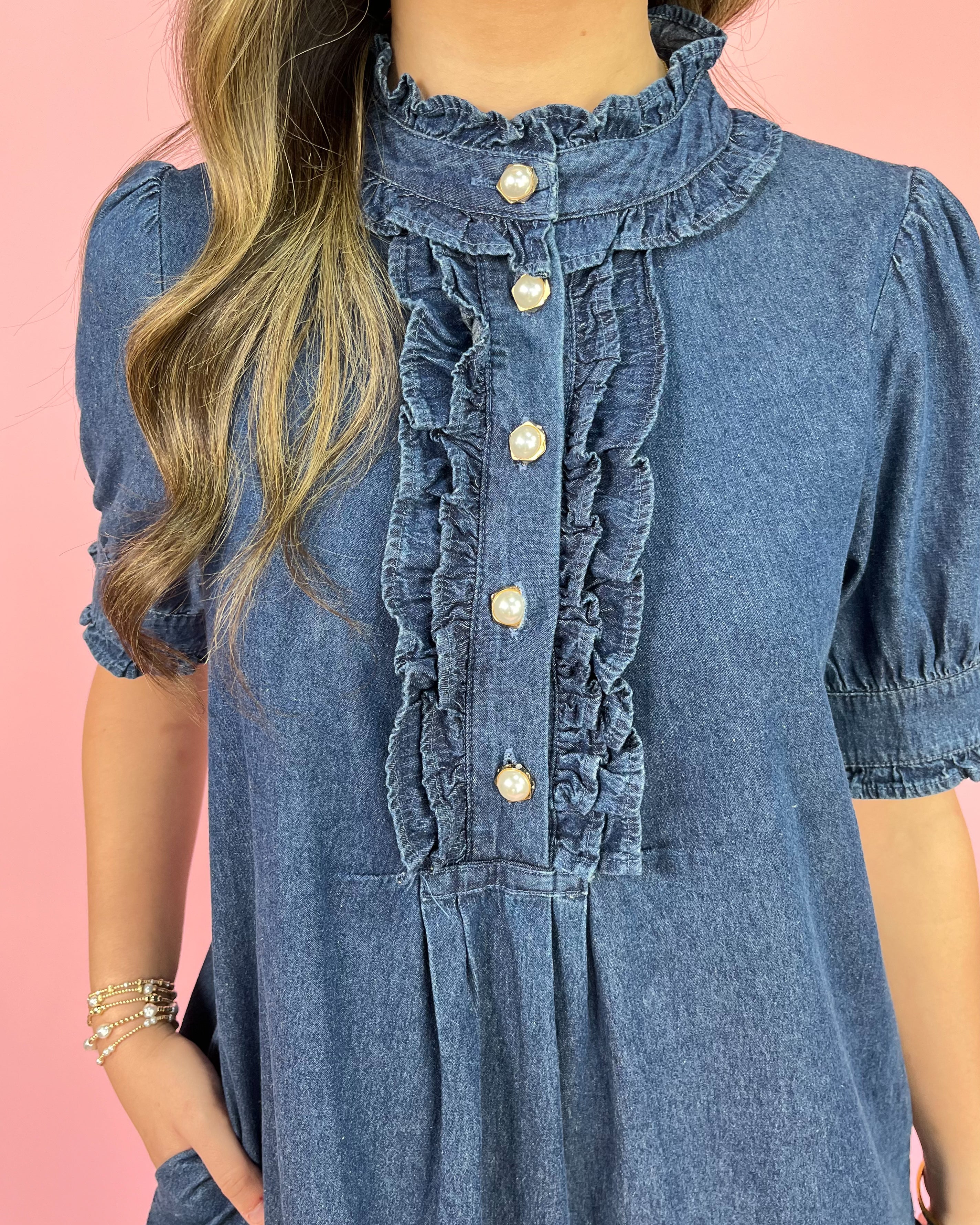 💙 The Demure in Denim Mini Dress is a timeless take on casual charm — sweet, structured, and oh-so-flattering. This feminine denim mini features a high ruffled neckline and pearl button accents that give it a polished, vintage-inspired appeal. The tiered hem and puff sleeves add just the right amount of volume, making it an effortless statement piece that transitions beautifully from brunch to date night.