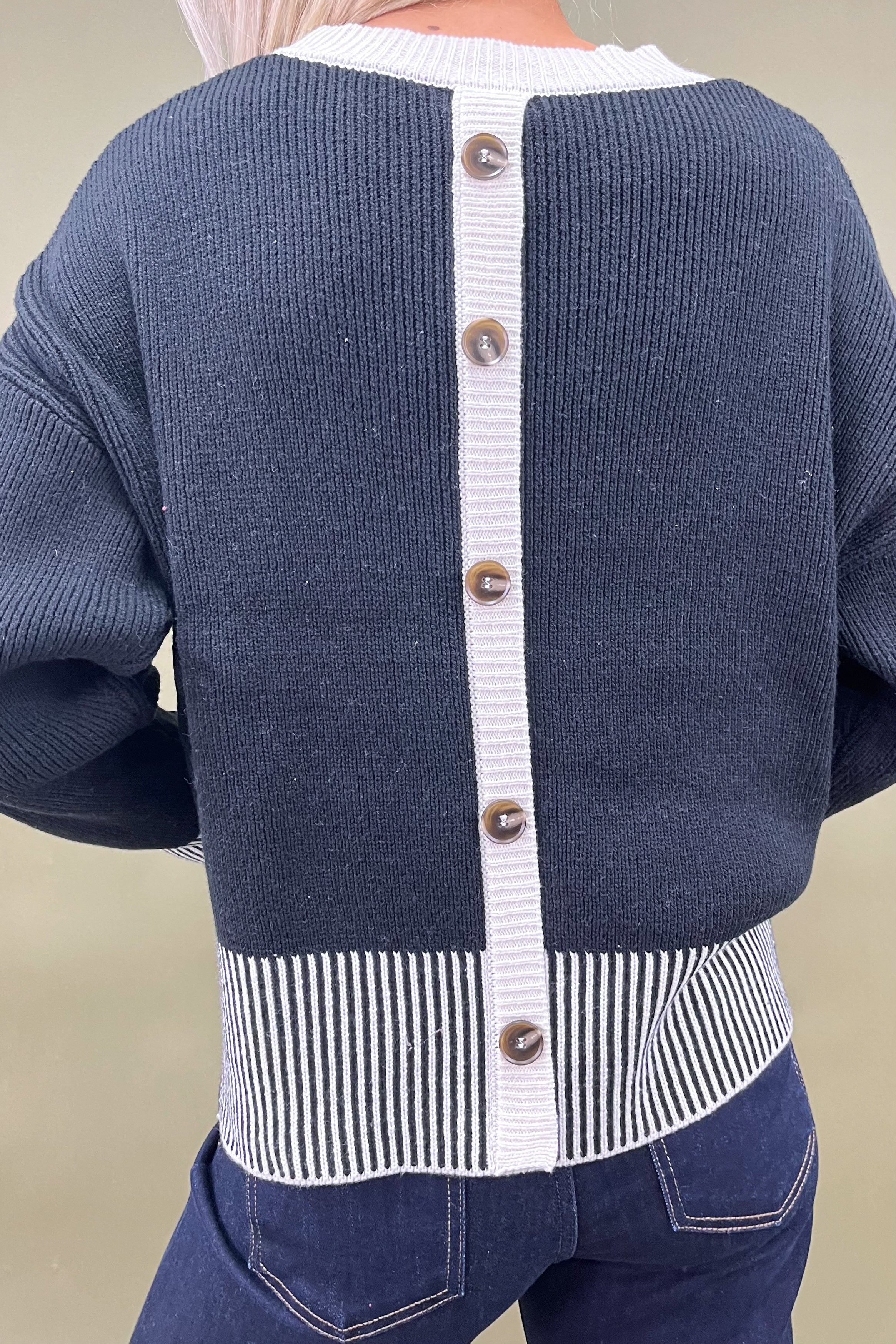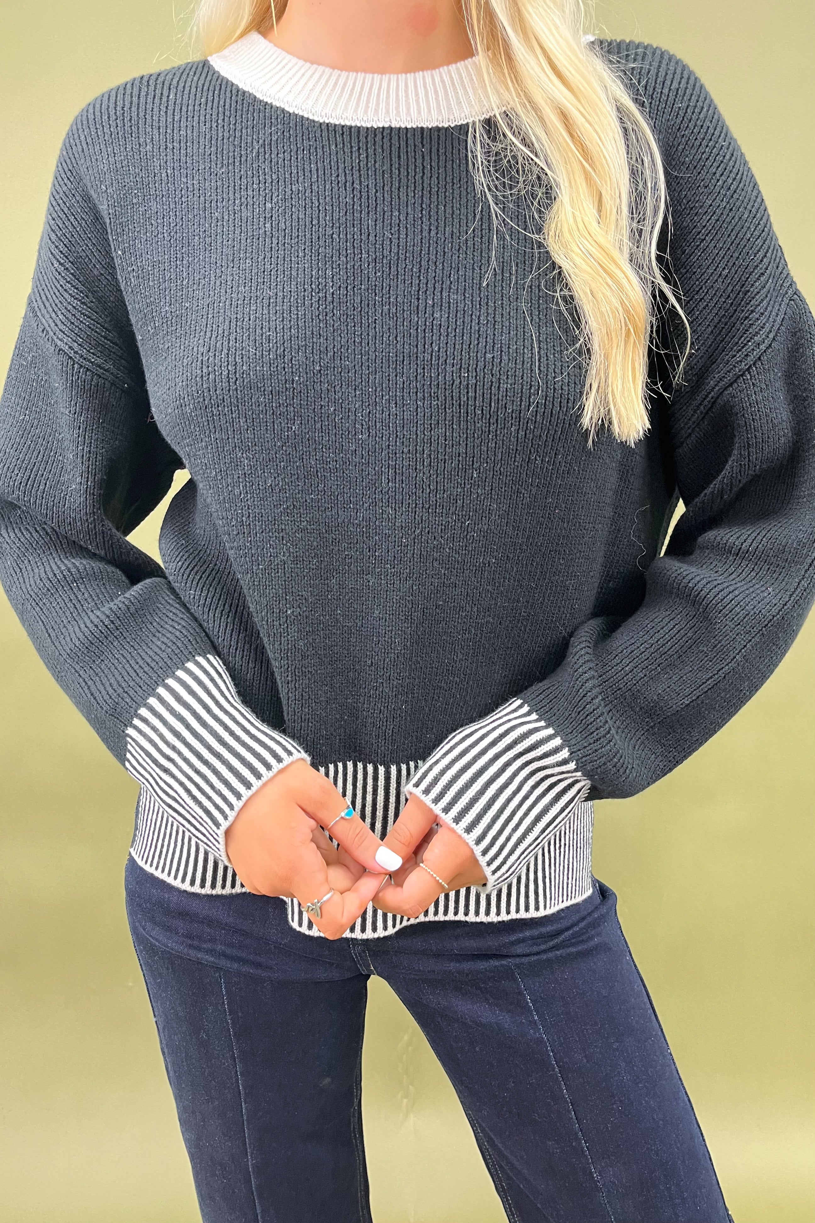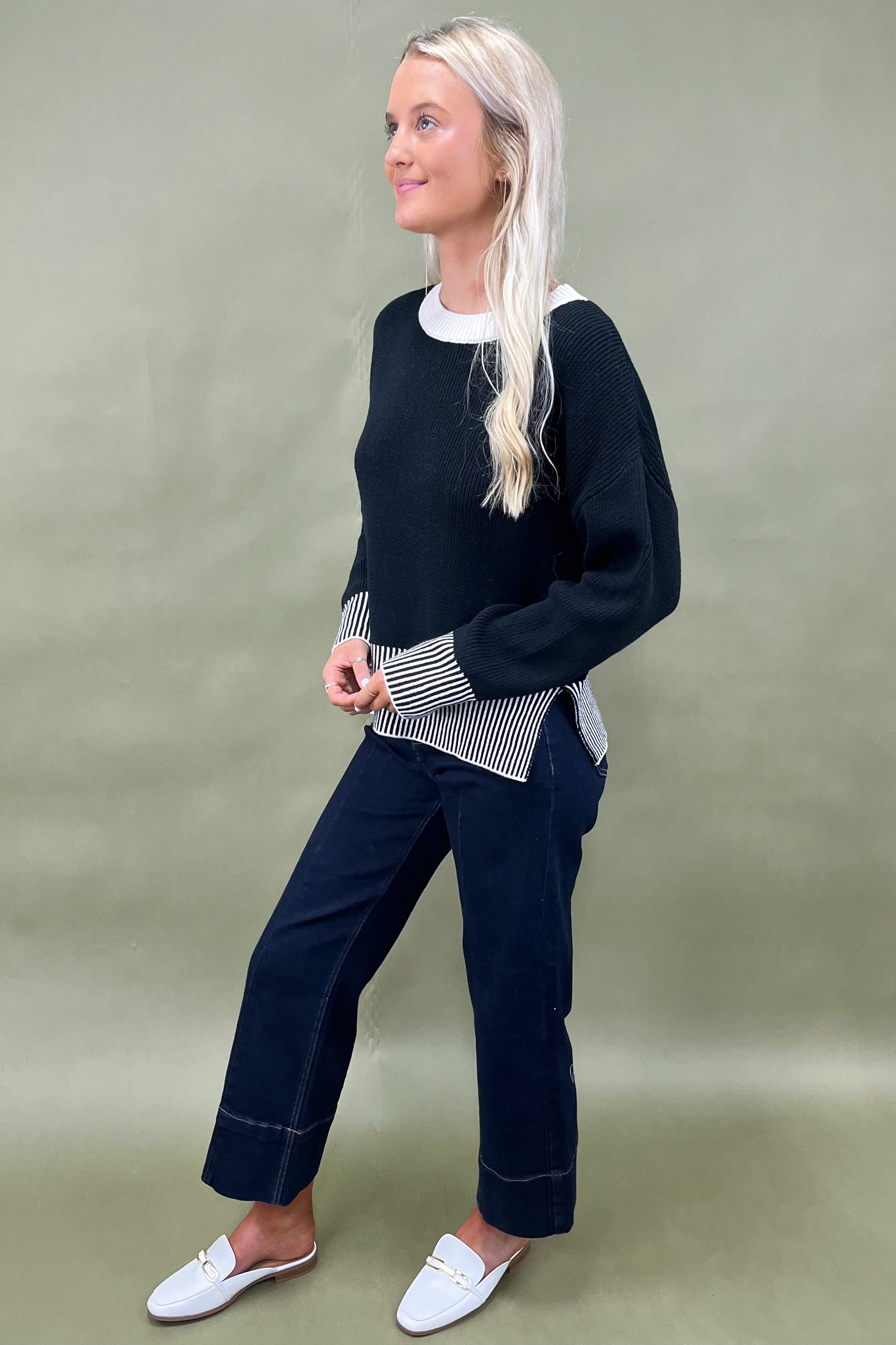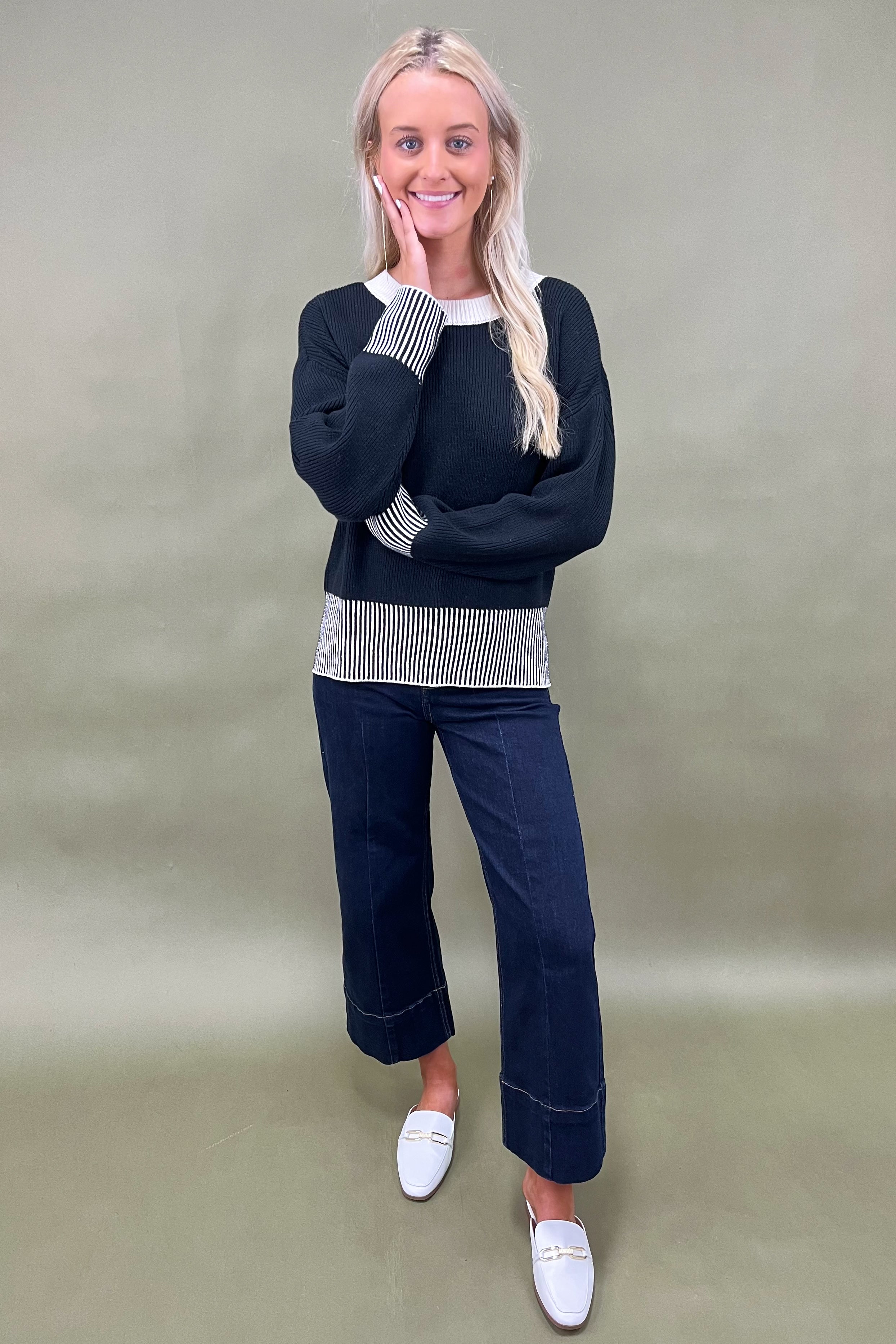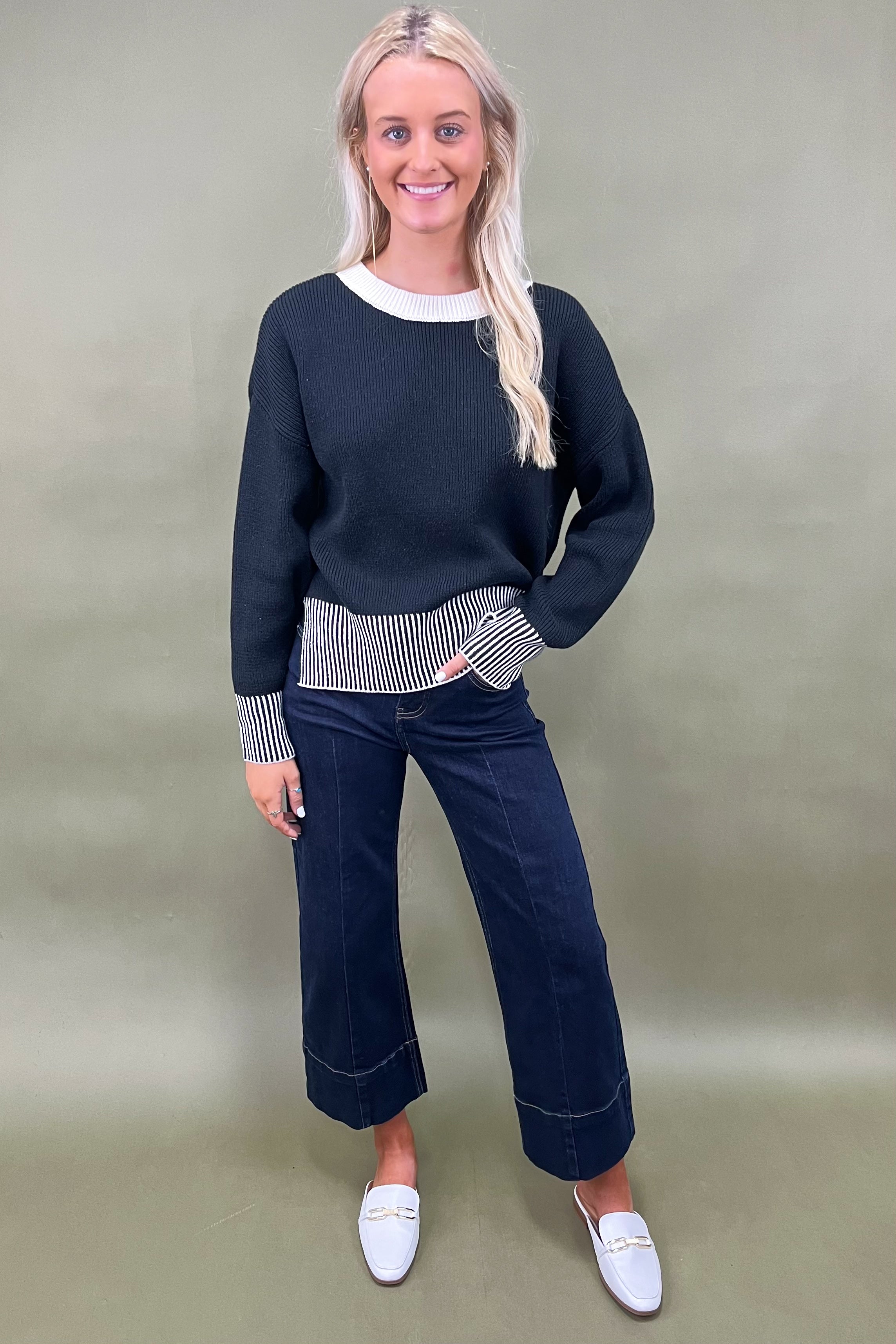 Designed in a timeless black knit with crisp cream contrast, the Dockside Darling gives classic nautical feels but with a modern boutique twist. The neckline is trimmed in a creamy ribbed knit that pops against the darker base, while the hemline finishes with a playful striped contrast panel that feels fresh, chic, and just a little bit unexpected. It’s the kind of detail that makes people go, “Omg, where did you get that?” (and you can just smile and say, “oh, this old thing?” 😉).