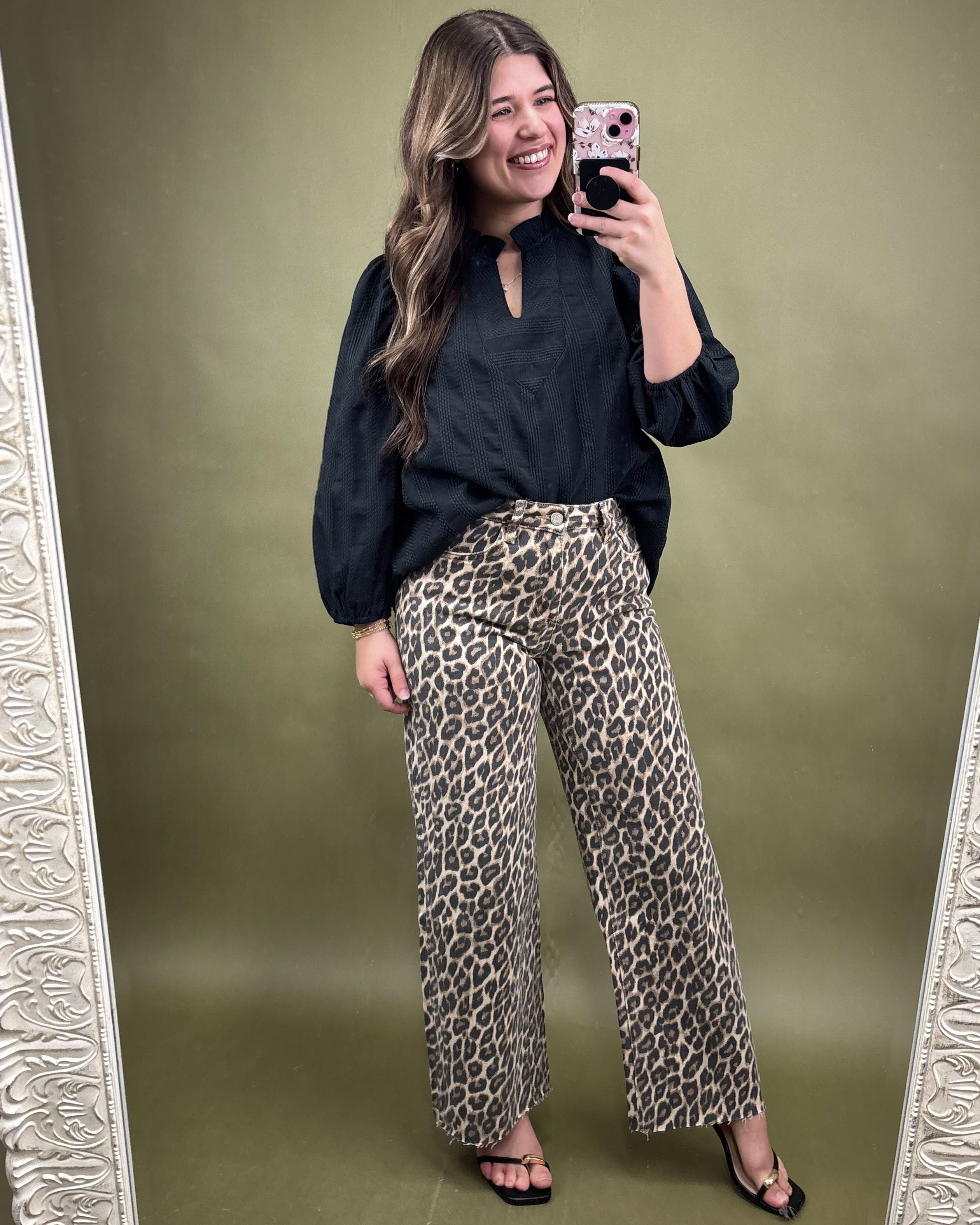 đ« Ruffle mock neck + notch detail for a feminine, polished touch