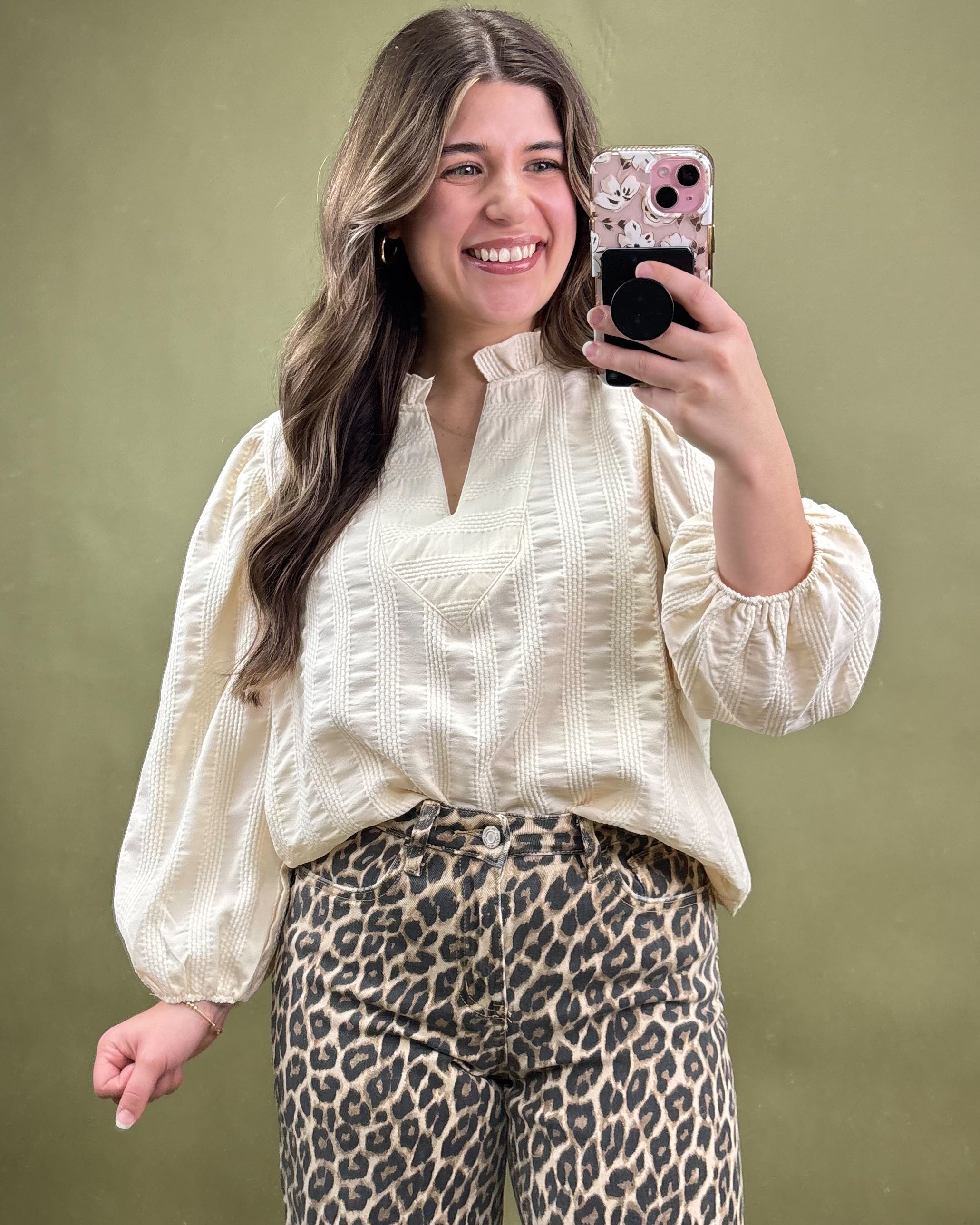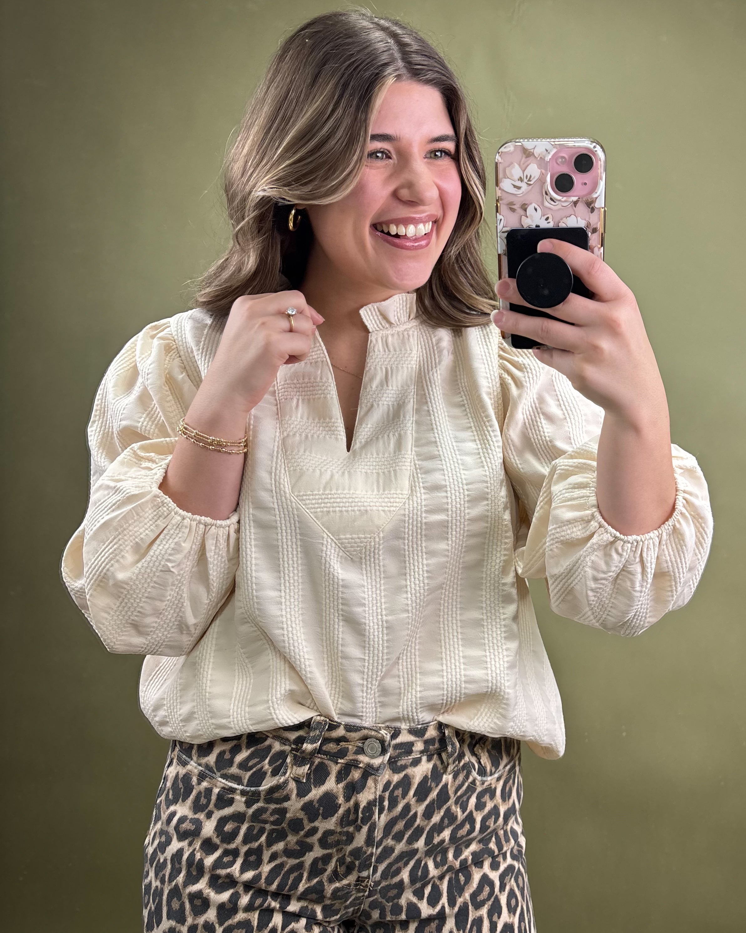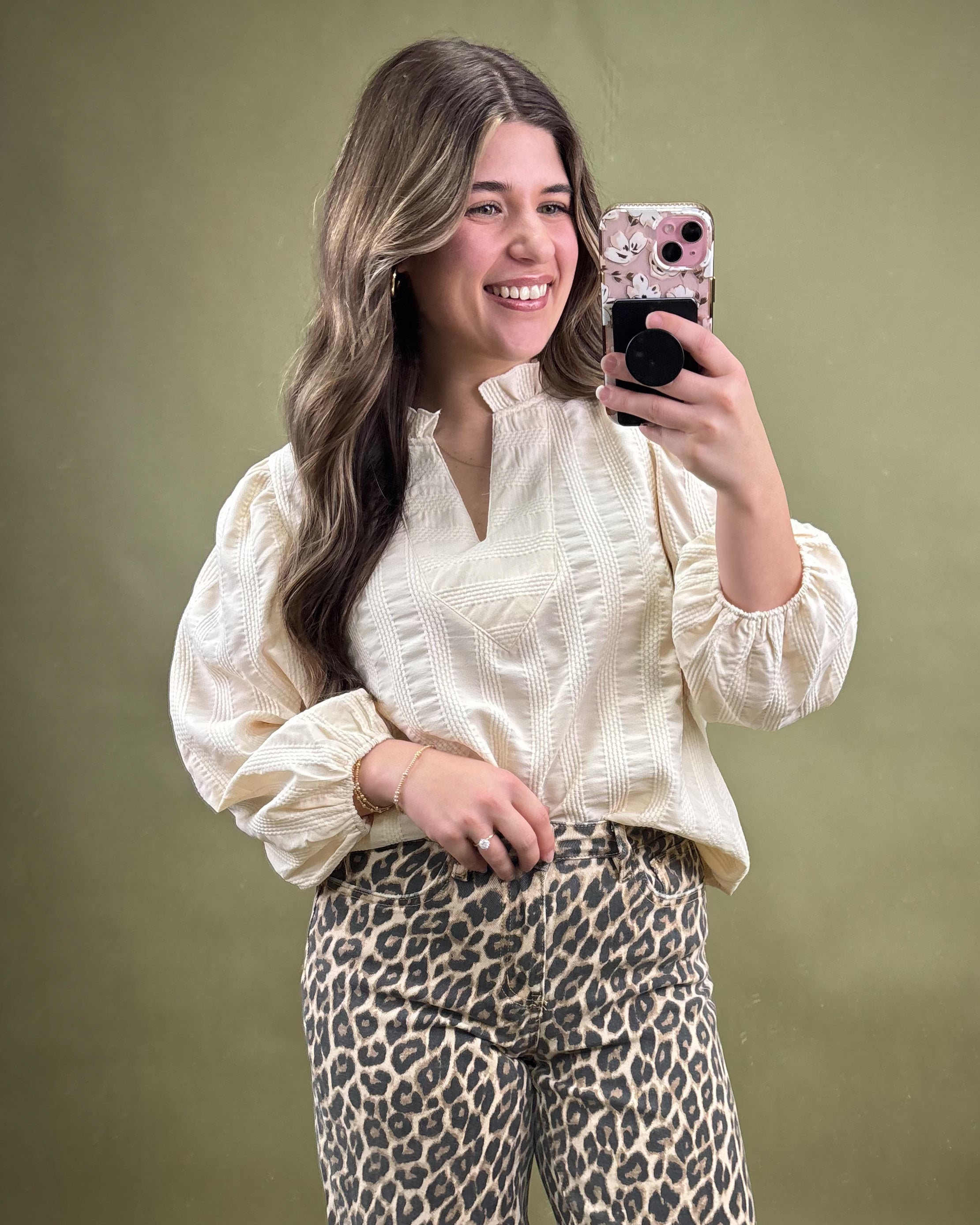 Soft ivory, heirloom textures, romantic details… this top is your new go-to for looking effortlessly polished. Whether you’re meeting the girls, taking family photos, or heading to church, this piece brings comfort, charm, and confidence every single time.