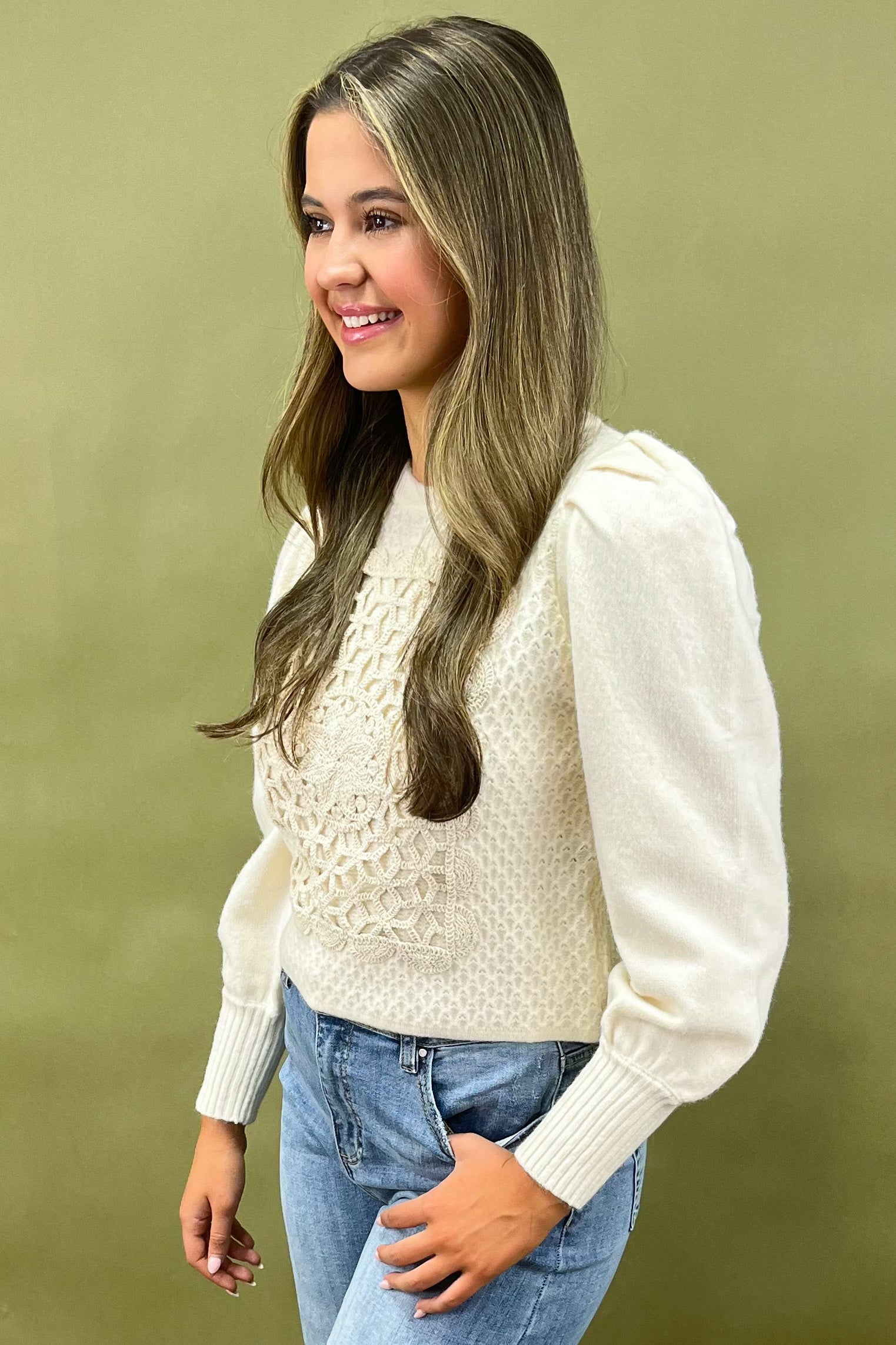 Crafted from a premium blend of polyester, polyamide, and acrylic, this sweater is designed to give you that perfect combination of warmth, stretch, and durability. But what truly sets it apart is the design: the ornate crochet panel across the chest feels like a vintage heirloom, while the puffed sleeves and textured knit add just the right amount of drama. It’s not just a sweater — it’s wearable art that tells a story with every stitch.