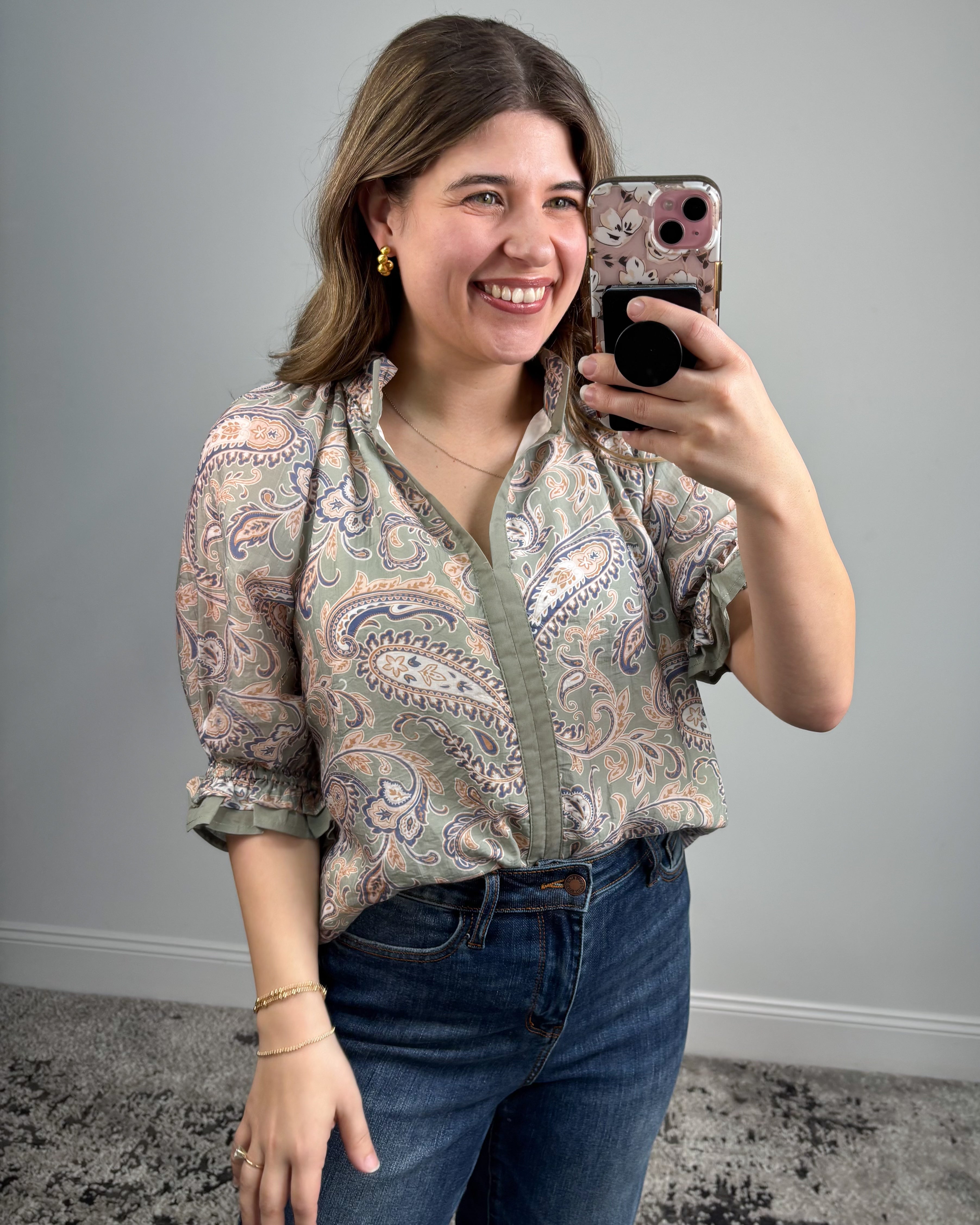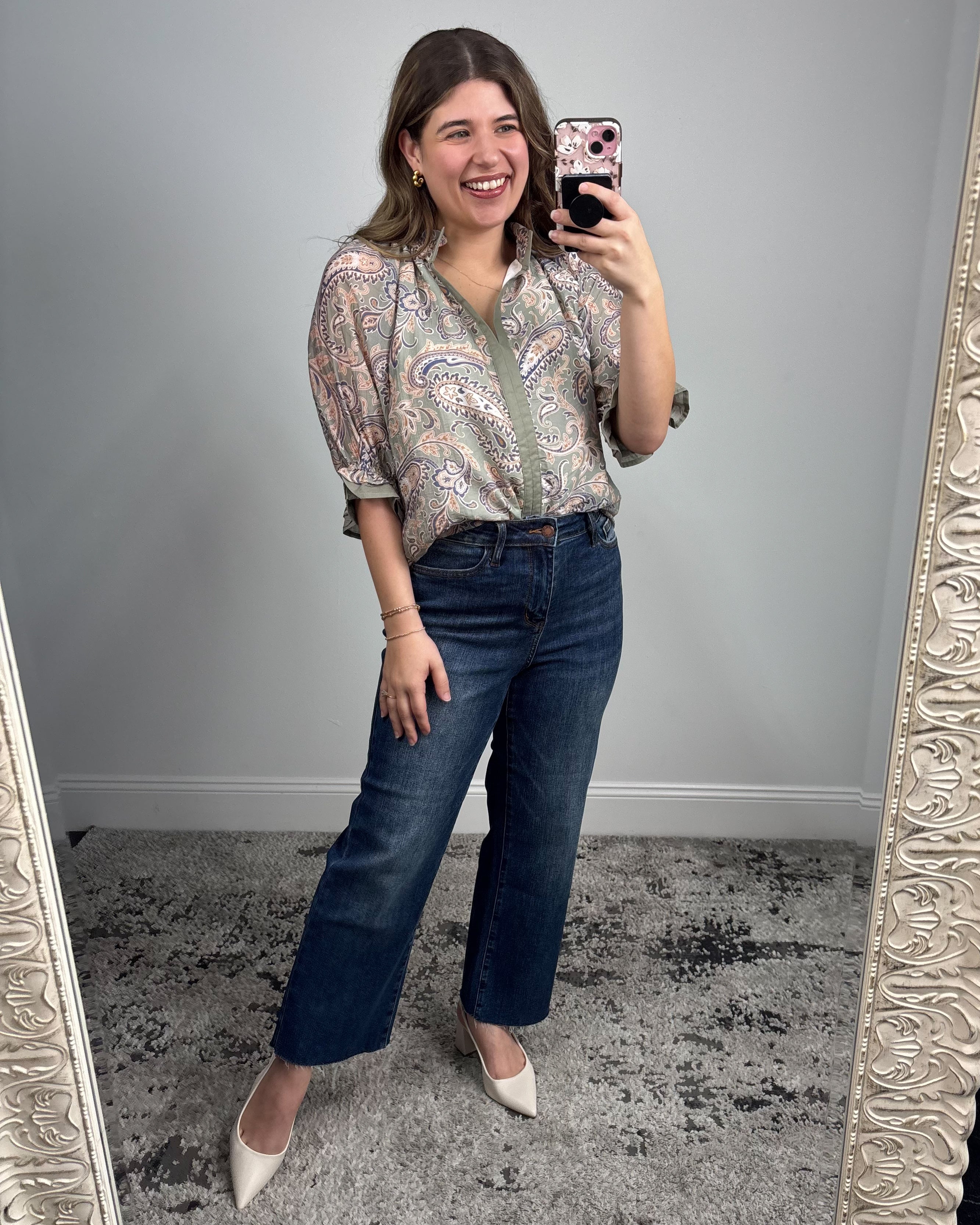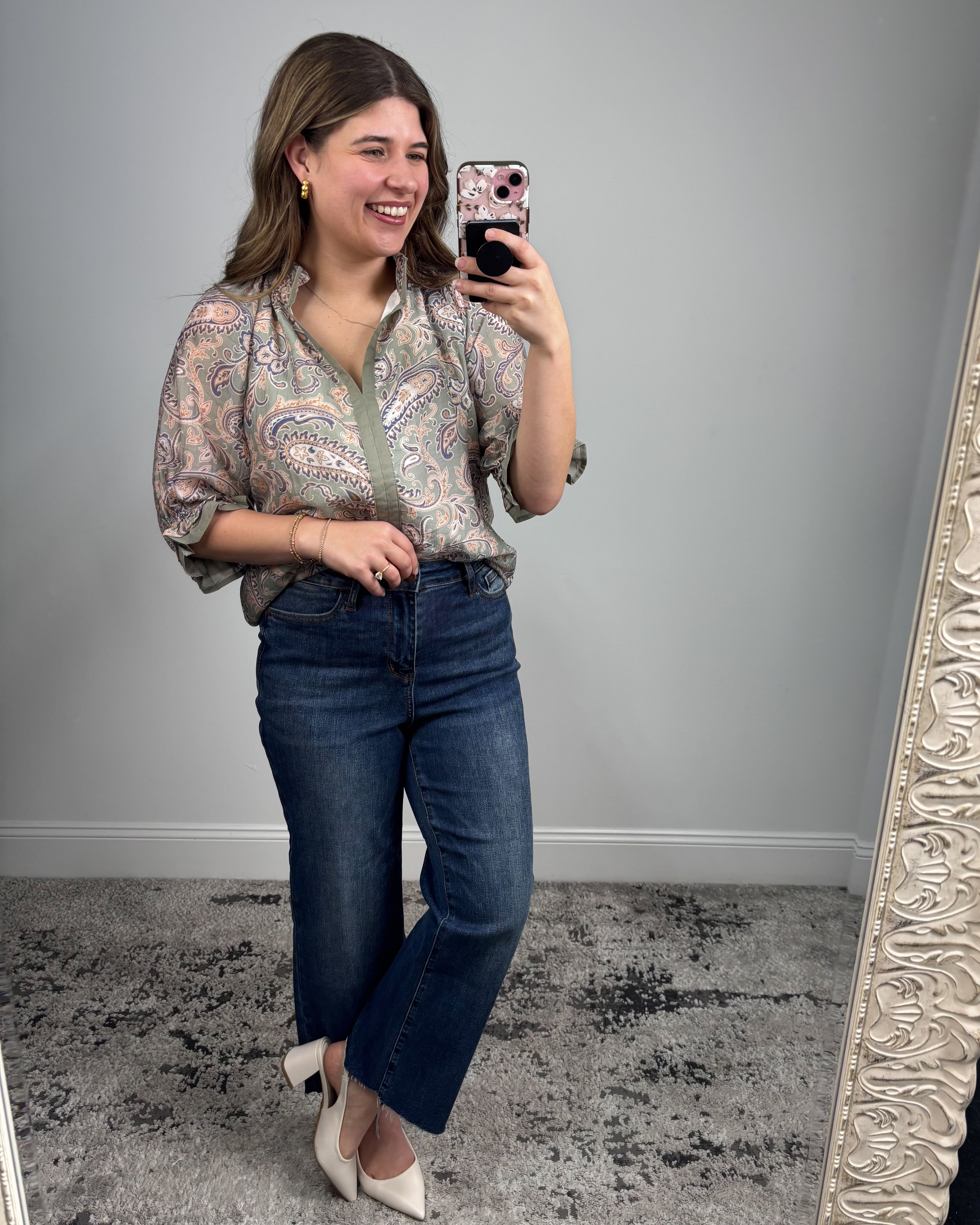 With the Evergreen Grove Paisley Top, soft, earthy tones meet timeless paisley in this effortlessly chic blouse you’ll reach for again and again. The muted green base paired with intricate ivory and taupe paisley detailing gives this top a classic, elevated feel that works beautifully from season to season.