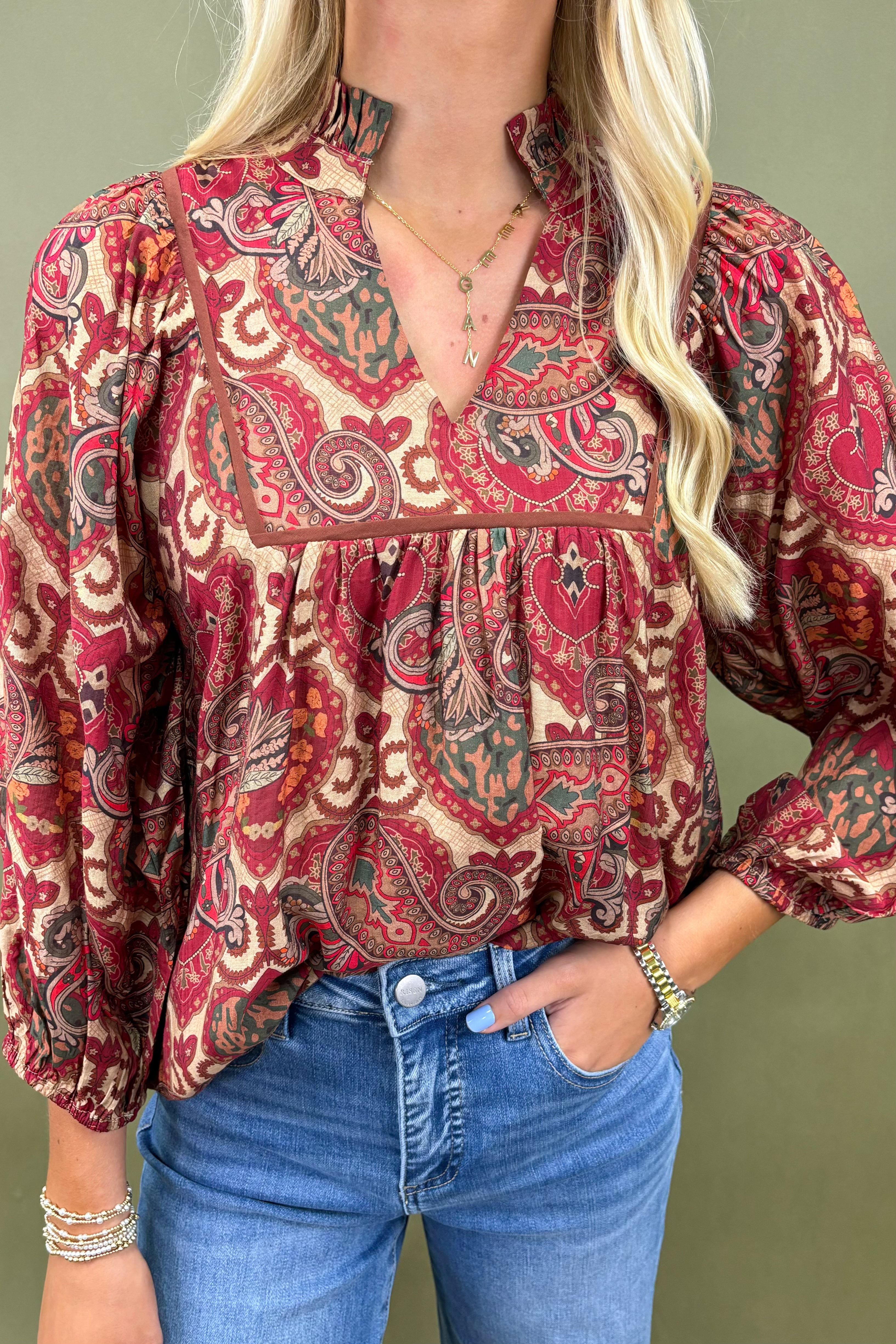 The rich tapestry of reds, golds, and earthy greens creates a stunning visual that feels like wearable art. The paisley-inspired print is beautifully layered, giving the blouse a dimensional look that’s as striking up close as it is from afar. It’s the kind of top that instantly draws the eye and makes you feel put together with minimal effort.