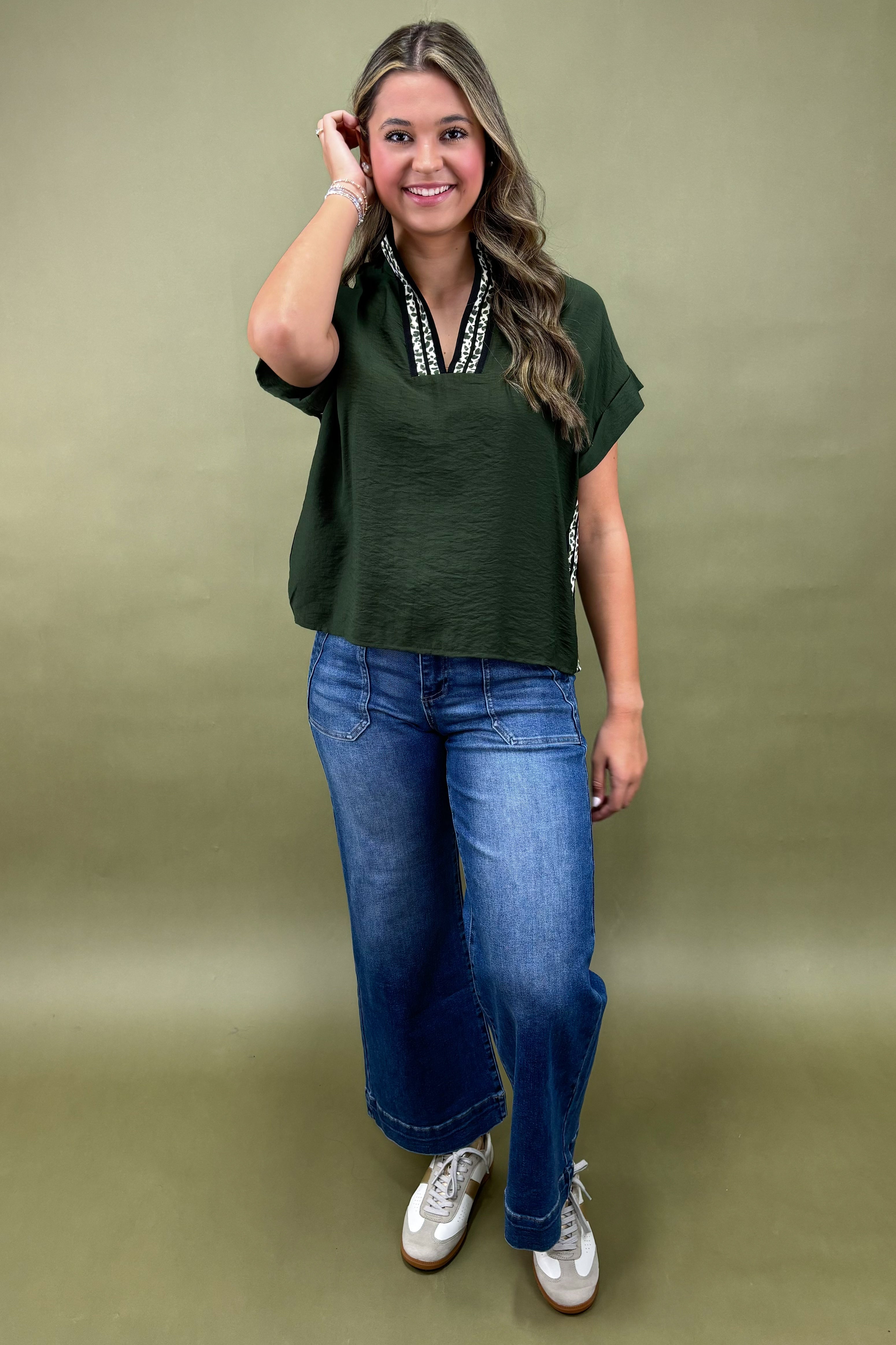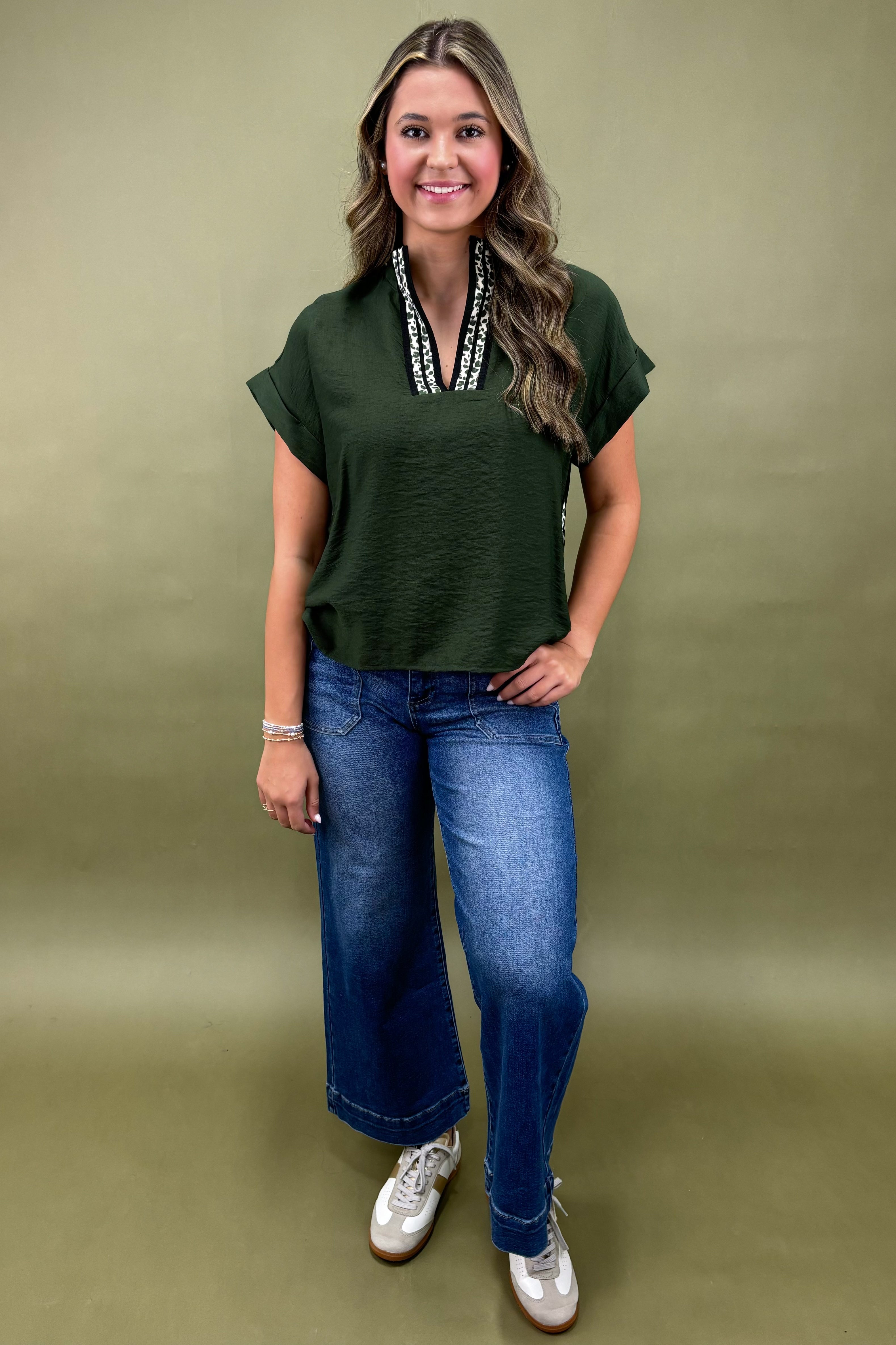 Add a playful twist to your everyday wardrobe with this dark green popover top, featuring just the right touch of fierce leopard print trim. This easygoing yet stylish piece blends comfort with personality, making it the kind of top you’ll reach for on repeat—whether you’re heading out for errands, meeting a friend for coffee, or styling it up for casual Fridays at work.