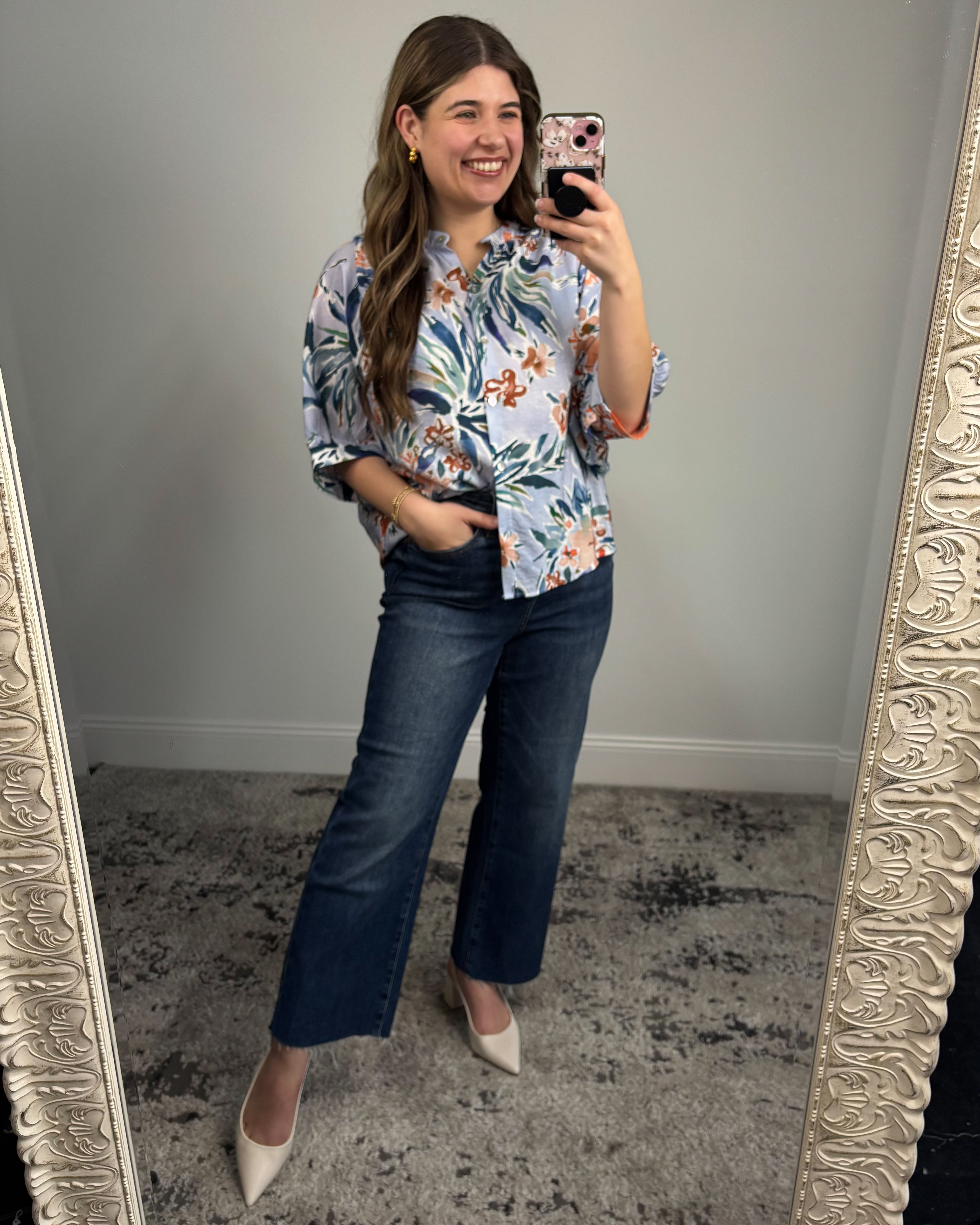 Meet the Floral Canvas Button Down Blouse — a breezy, painterly piece that feels like wearing a watercolor garden 🌿✨. This blouse blends soft structure with effortless movement, creating a look that’s polished, artistic, and perfect for spring days, workwear chic, or weekend outings.
