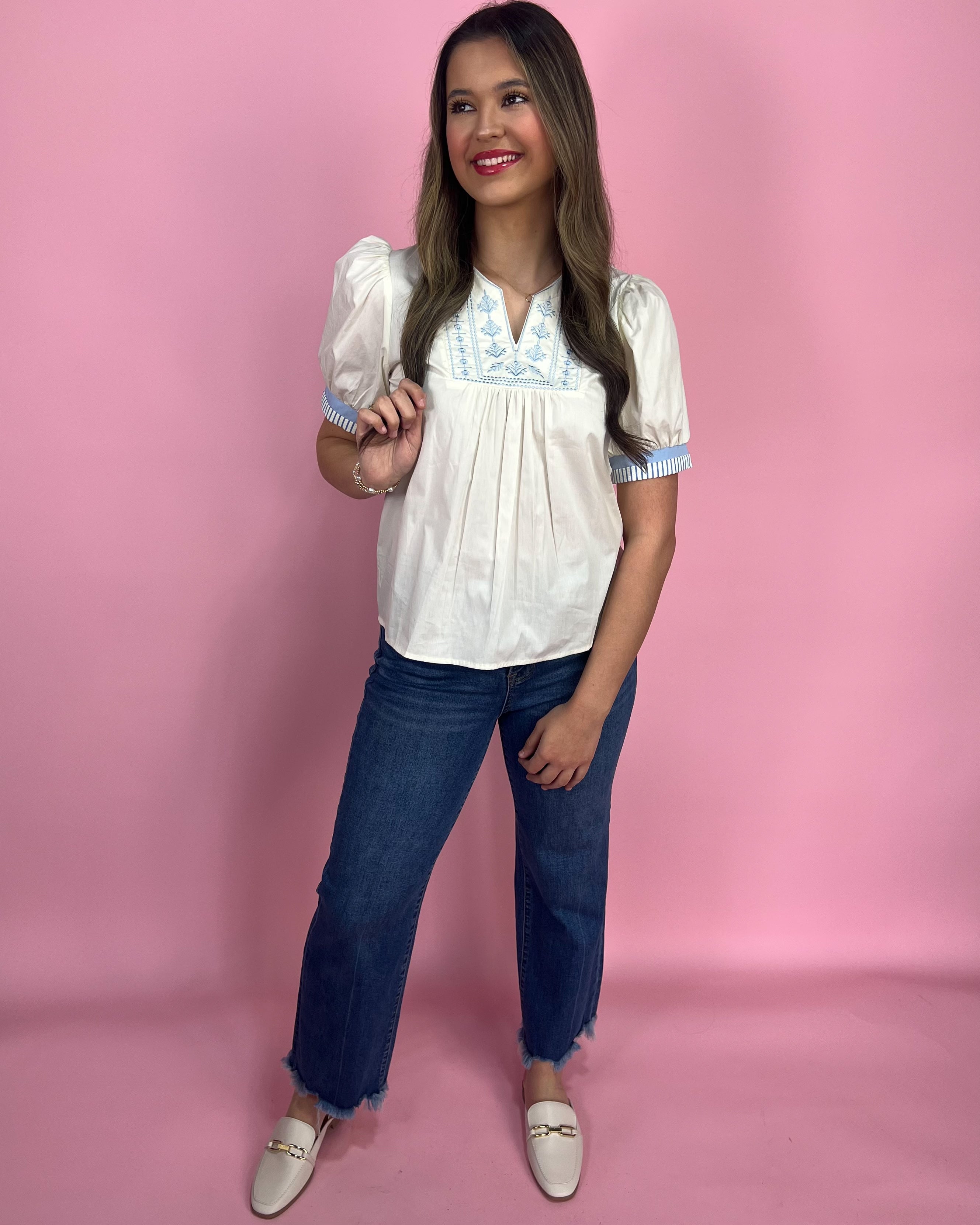 Sweet, crisp, and giving major “coastal classic” energy 💙☁️ This top is all about the details — the prettiest icy blue embroidery, the puff sleeves, and that clean contrast trim that instantly elevates the whole look 😍 It’s the kind of piece that makes your outfit feel done with zero effort ✨
