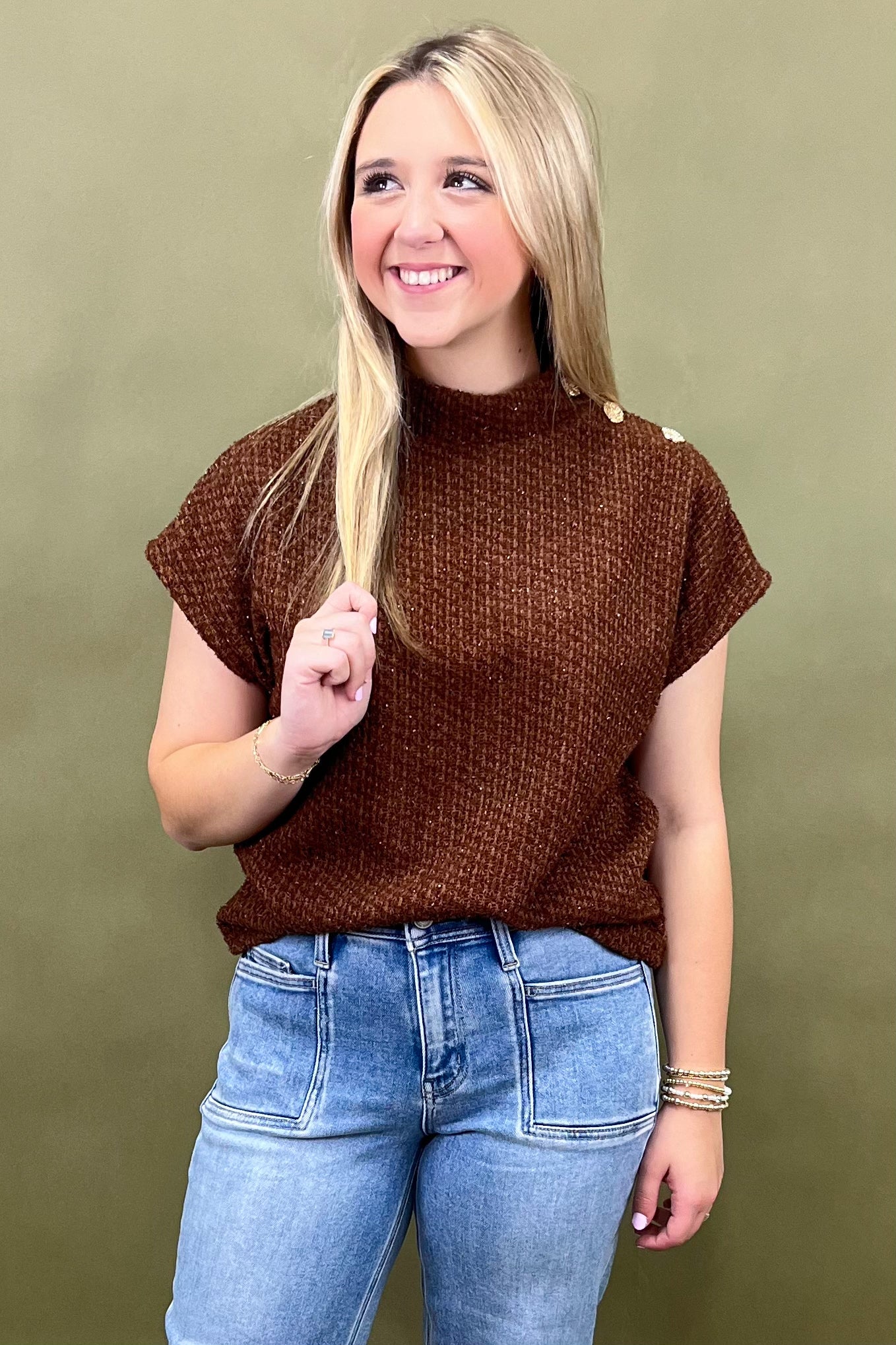 The mock neckline gives that chic, structured feel, but itâs softened with a slouchy-comfy body that drapes just right. The three gold tweed buttons along the shoulder? So darling. So unexpected. So boutique. They instantly elevate the top from âcute sweaterâ to âstop and tell me where you got that.â đAnd those sleevesâthose sweet little cap sleeves! They give just enough coverage while keeping things breathable and flattering. The silhouette is relaxed without being boxy, skimming your shape just enough to keep it stylish, comfortable, and endlessly wearable.