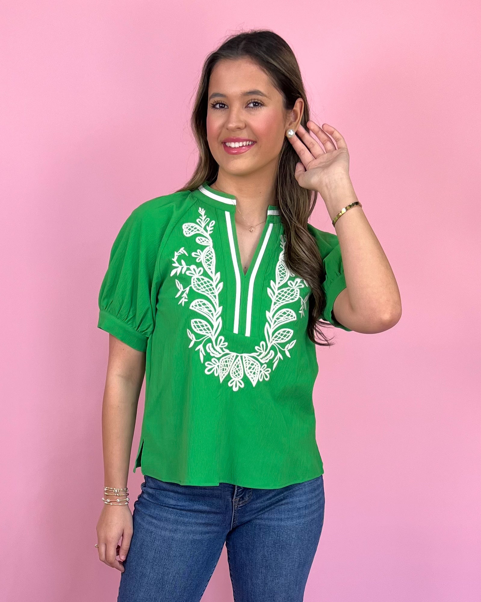 💚✨ Say hello to the Green With Envy Embroidered Top — a bold, beautiful piece that’s as vibrant as your personality! This eye-catching green blouse is all about easy elegance with a playful twist. The intricate white embroidery along the neckline and chest brings a touch of boho charm, while the puff sleeves and split-neck detail keep things fun and feminine.