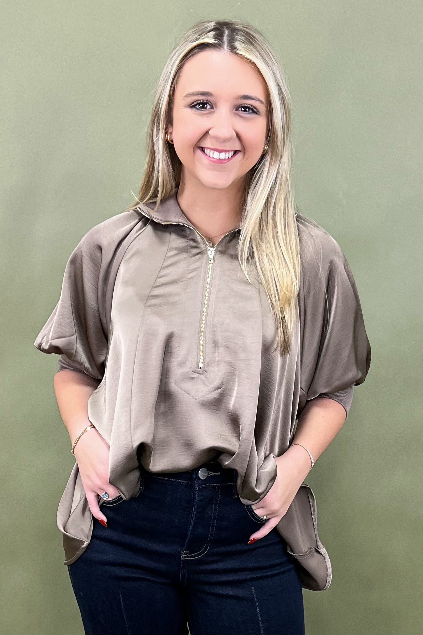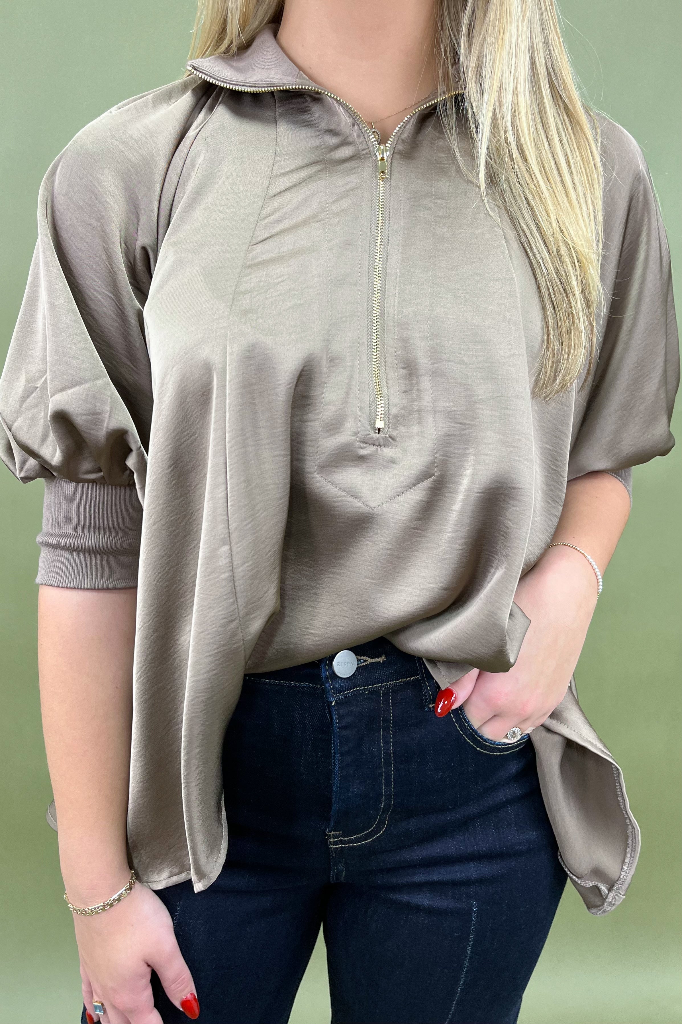Let’s talk details (because that’s where this top really shines): a half-zip front with a gleaming gold zipper brings a modern edge, while the mock neckline keeps things clean, elevated, and ready for layering. The contrast ribbed cuffs and collar balance out the silky fabric with a touch of cozy texture — a subtle nod to sporty chic while staying sleek and feminine. The relaxed fit gives it just enough flow without being oversized, so it drapes beautifully whether you wear it tucked or loose.