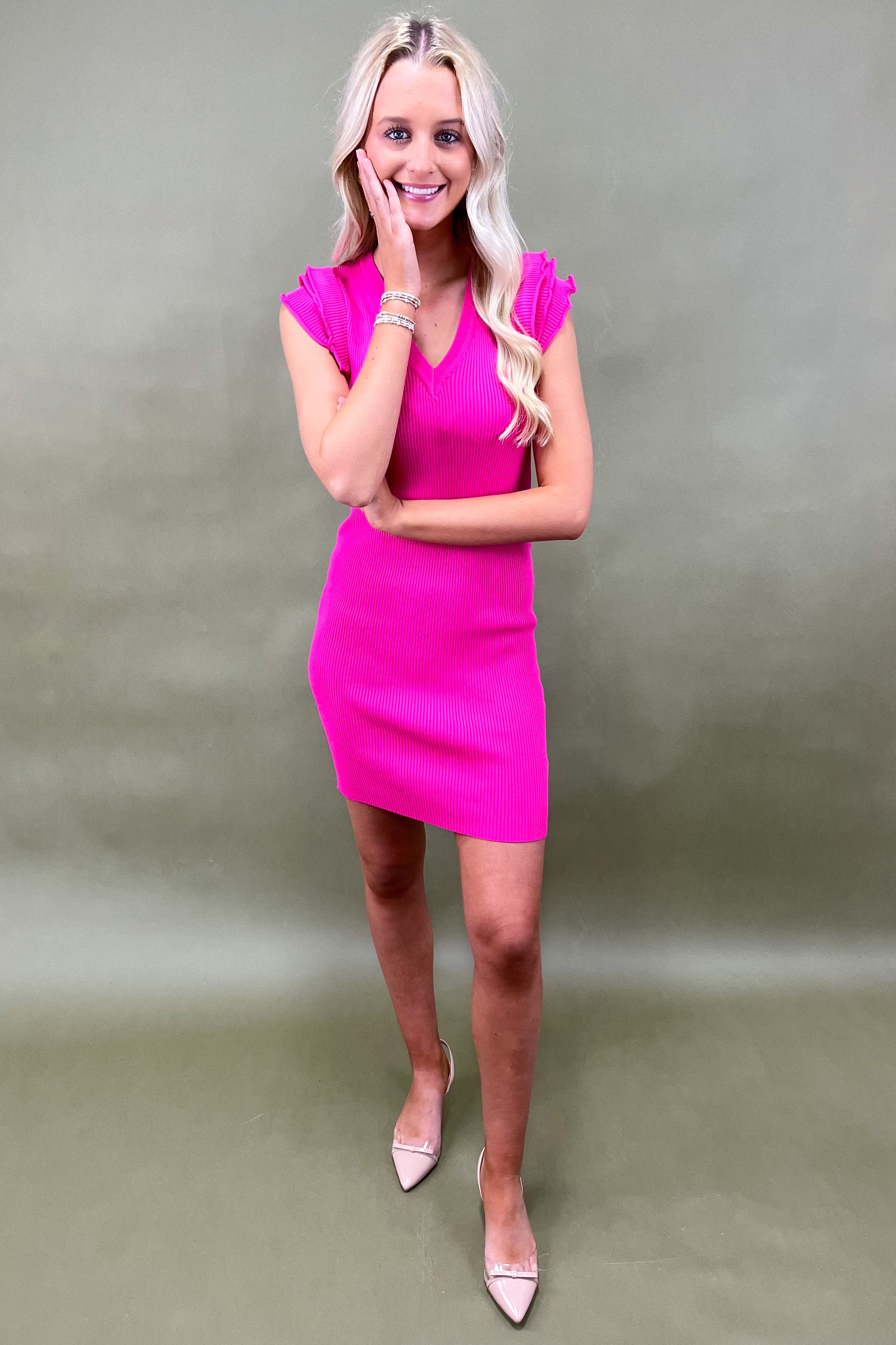 Turn up the heat and step into the spotlight with the Hibiscus Glow Dress—the bold, beautiful bodycon that was made for main character moments 💃✨. She’s hot pink, confident, and unapologetically fun—just like you. With her ribbed knit texture and curve-loving fit, she knows how to flatter every inch, while her playful ruffle sleeves keep things lighthearted and fresh.