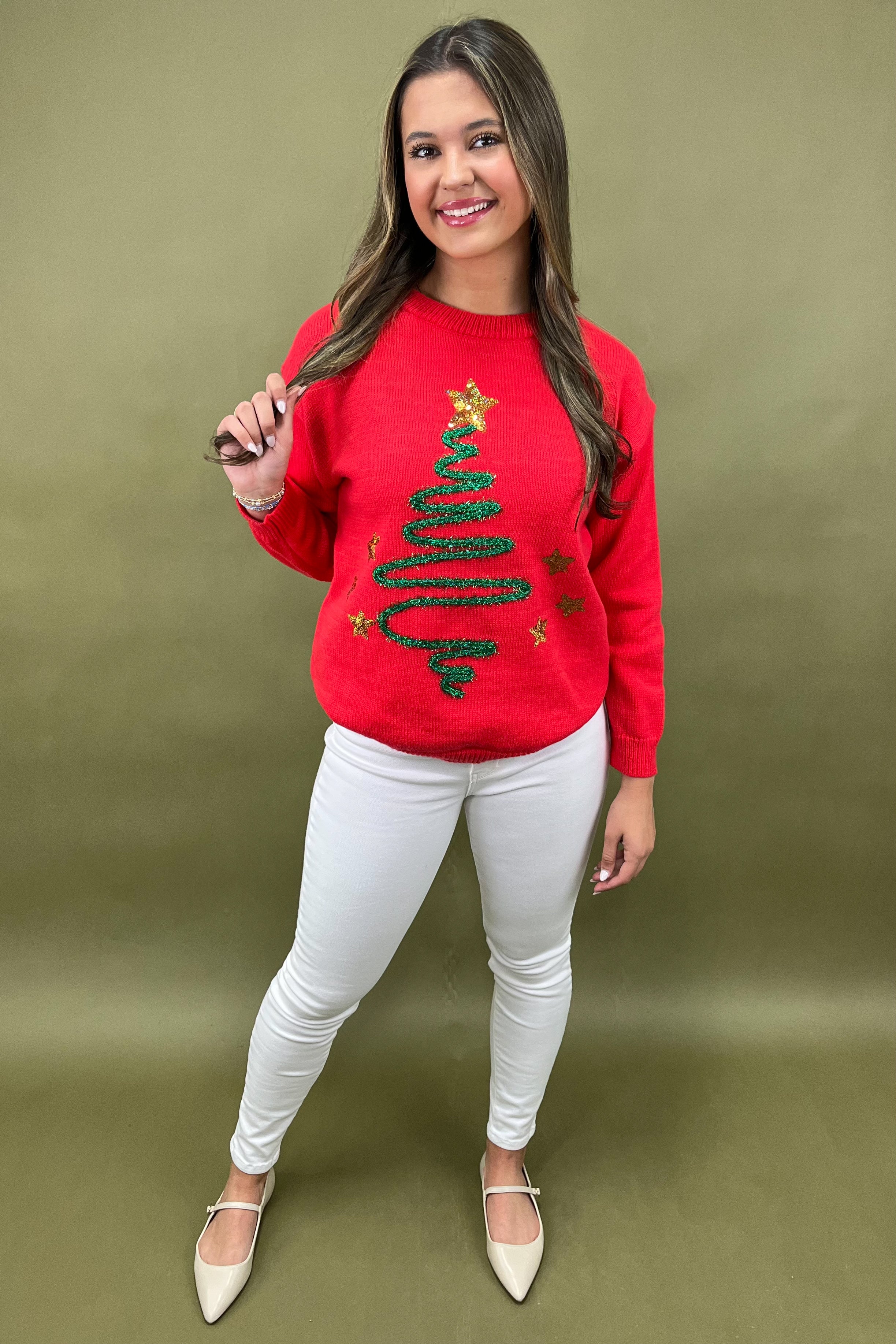 Bring the holiday cheer wherever you go in our Holiday Spark Sweater đâ. This cozy red knit is sprinkled with festive magic, featuring a glimmering green tinsel tree design that twirls across the front, topped with a golden star and sparkling accents. Itâs the perfect mix of comfort and whimsy, making it a must-have for your seasonal lineup!