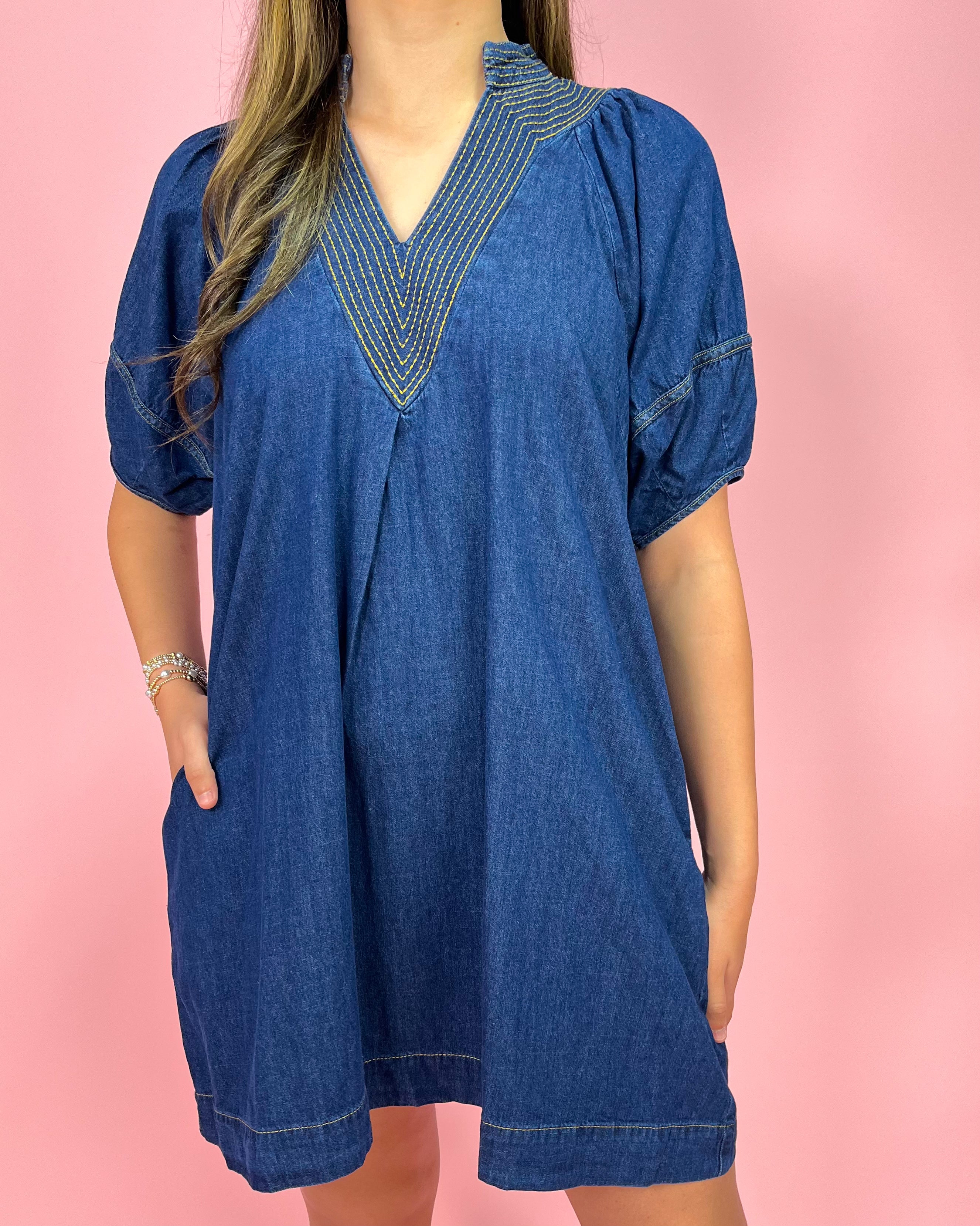 Elevate your everyday denim with the stunning Indigo Glow Gold Stitch Denim Dress. This piece blends effortless comfort with eye-catching detail, creating a look that feels both casual and elevated at the same time. The rich indigo denim gives the dress a timeless feel while the bold gold stitching around the neckline adds a beautiful pop of contrast that instantly draws attention.