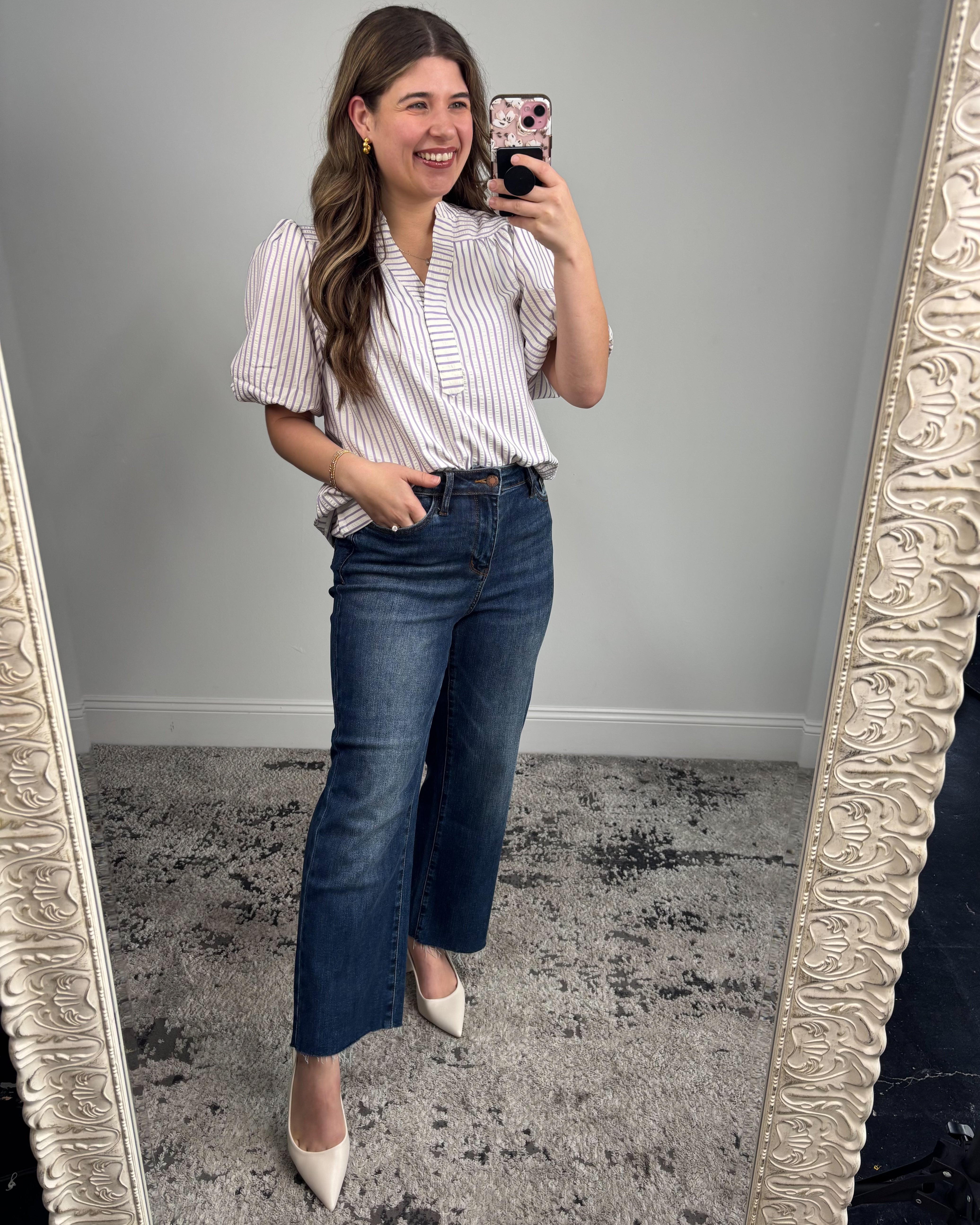 What truly sets this top apart is how versatile and wearable it is. The vertical stripes elongate the silhouette, the subtle puff sleeve adds a chic little lift, and the lilac color brings the prettiest pop of soft color to your spring wardrobe. This is one of those pieces that looks stunning dressed up or down — a true instant favorite.