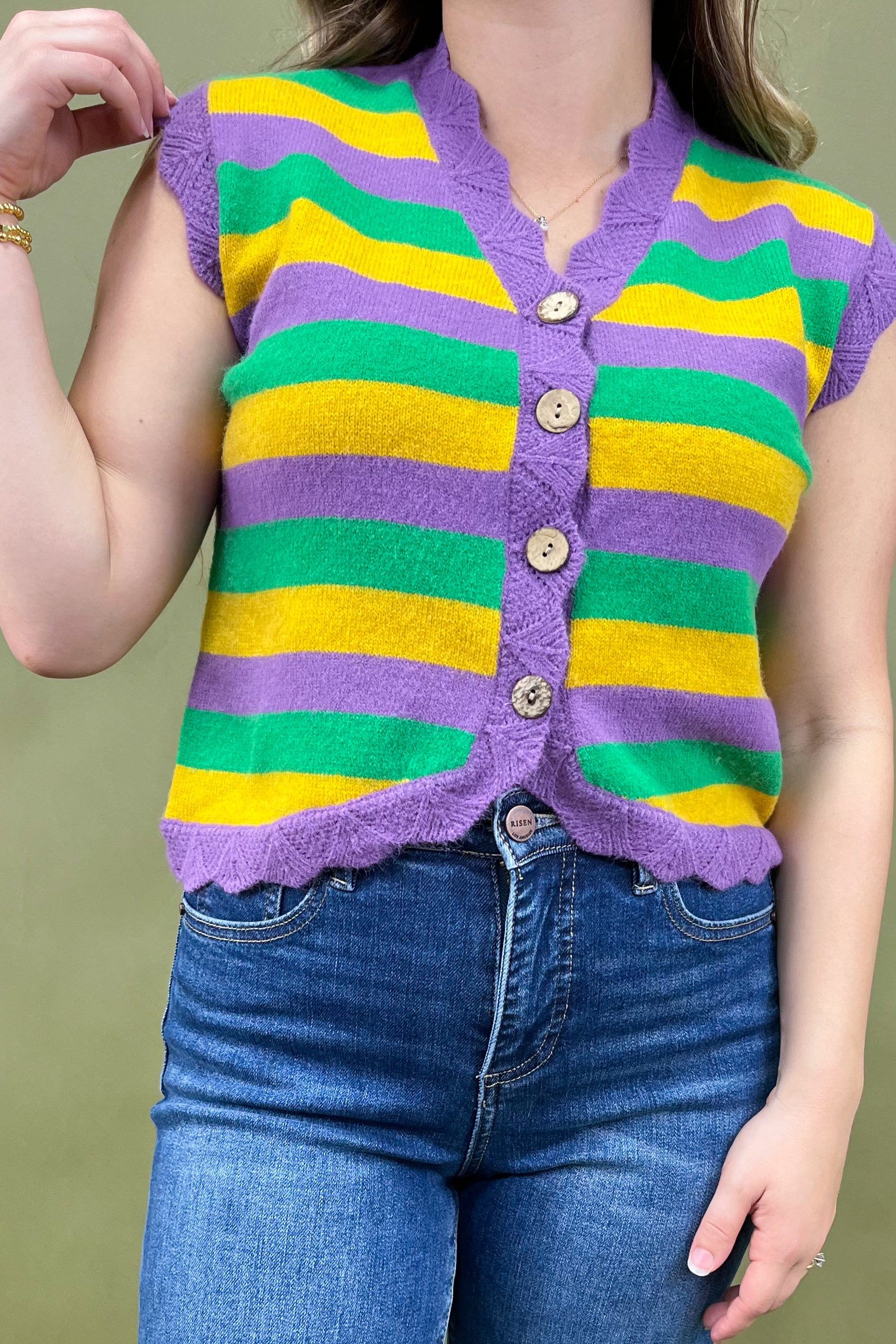 What makes the Mardi Magic Striped Sweater Vest such a standout is how incredibly versatile it is. Sure, it’s perfect for Mardi Gras festivities — from parades to office spirit days to king cake tasting with friends — but it’s also a piece you’ll reach for anytime you want something fun. Layer it with neutrals to let the colors shine, or go full Mardi Gras mode with bold jewelry and statement bottoms. It’s the ultimate outfit enhancer!