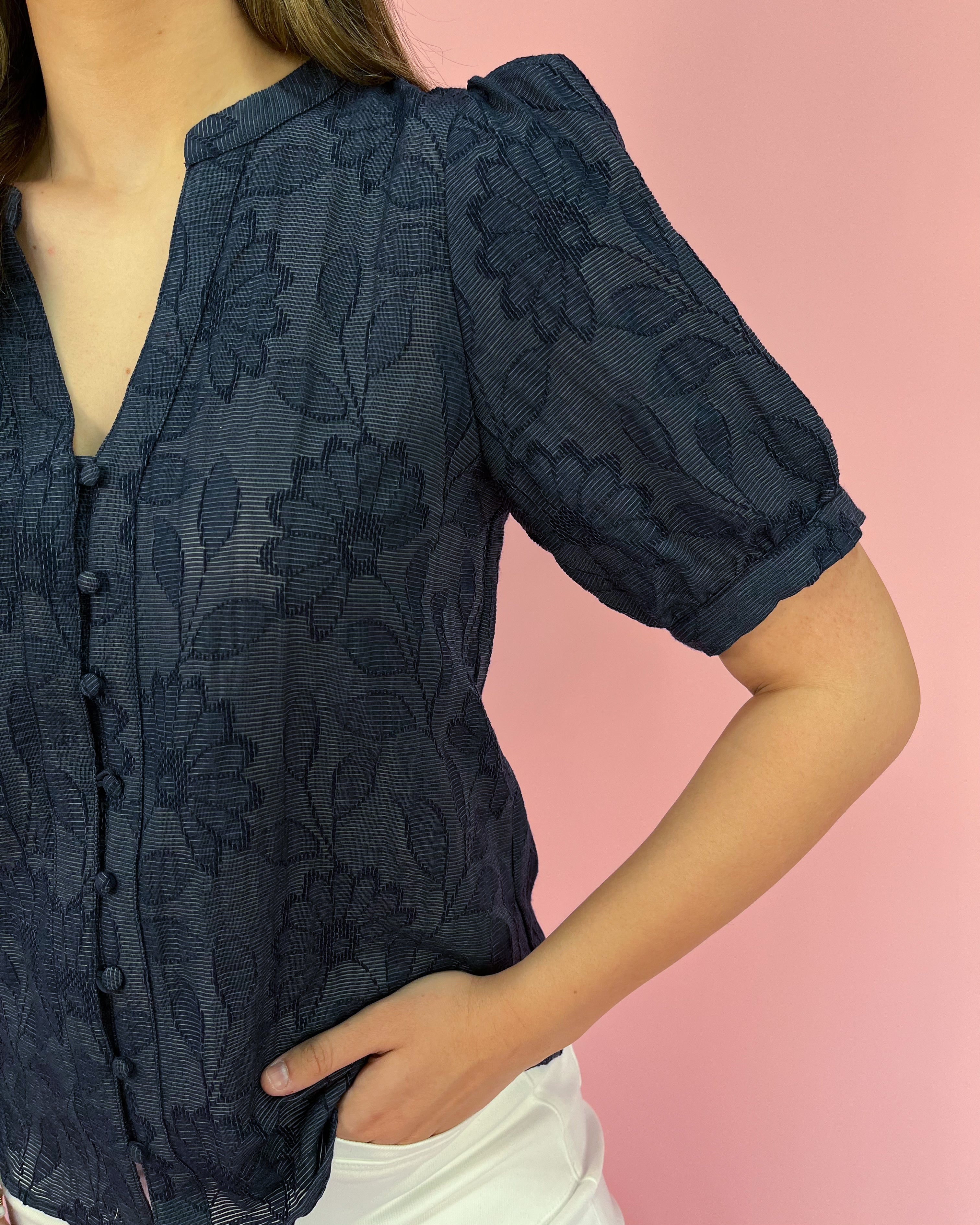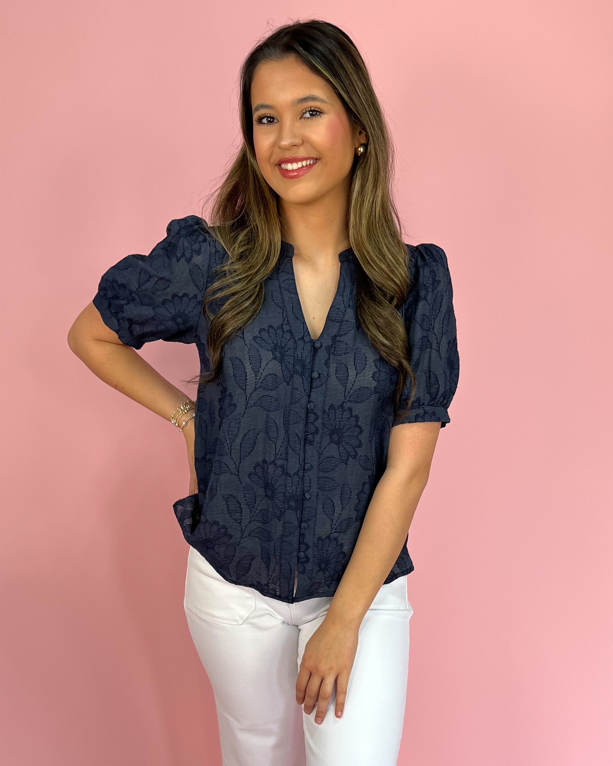 A timeless navy top with an elevated twist, this polished button-up brings subtle texture and effortless sophistication to your everyday wardrobe. The rich navy tone keeps it classic, while the delicate tonal floral texture adds just the right amount of interest.