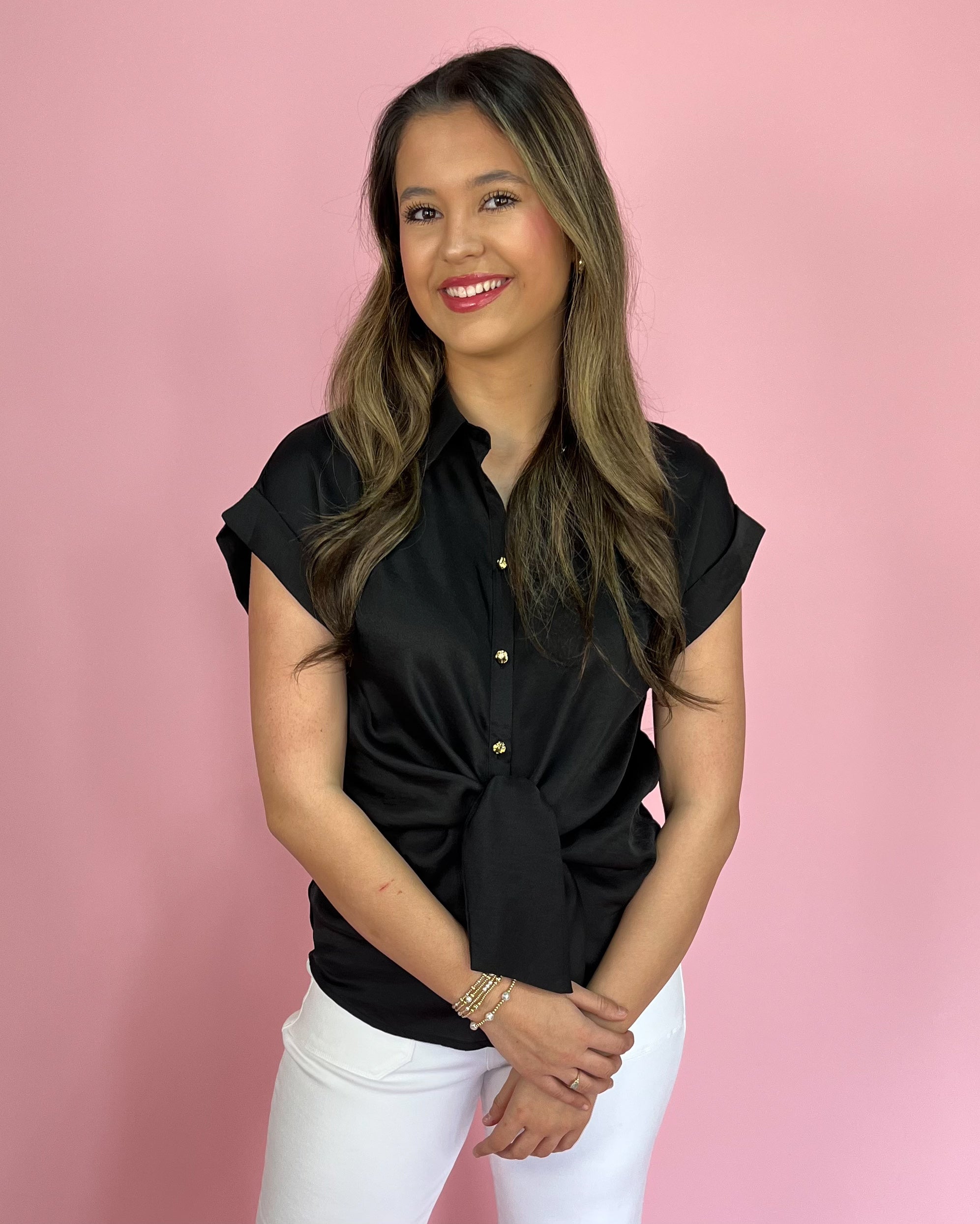 Noir Collar Front Tie Button Up Top