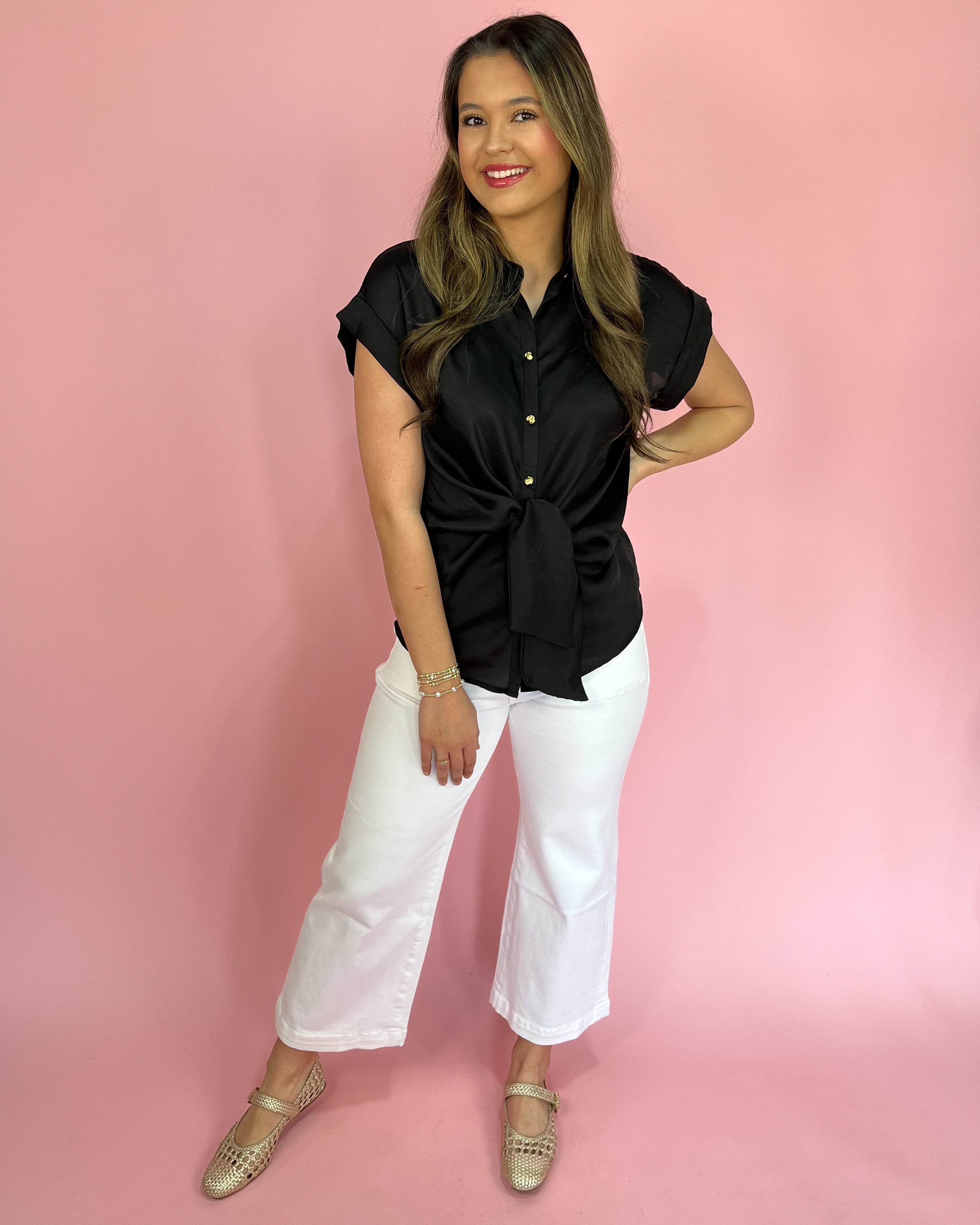 The front tie detail adds a flattering, waist-defining touch while keeping the overall look soft and feminine. Easy short sleeves and a relaxed silhouette make this one a go-to for dressing up or down.