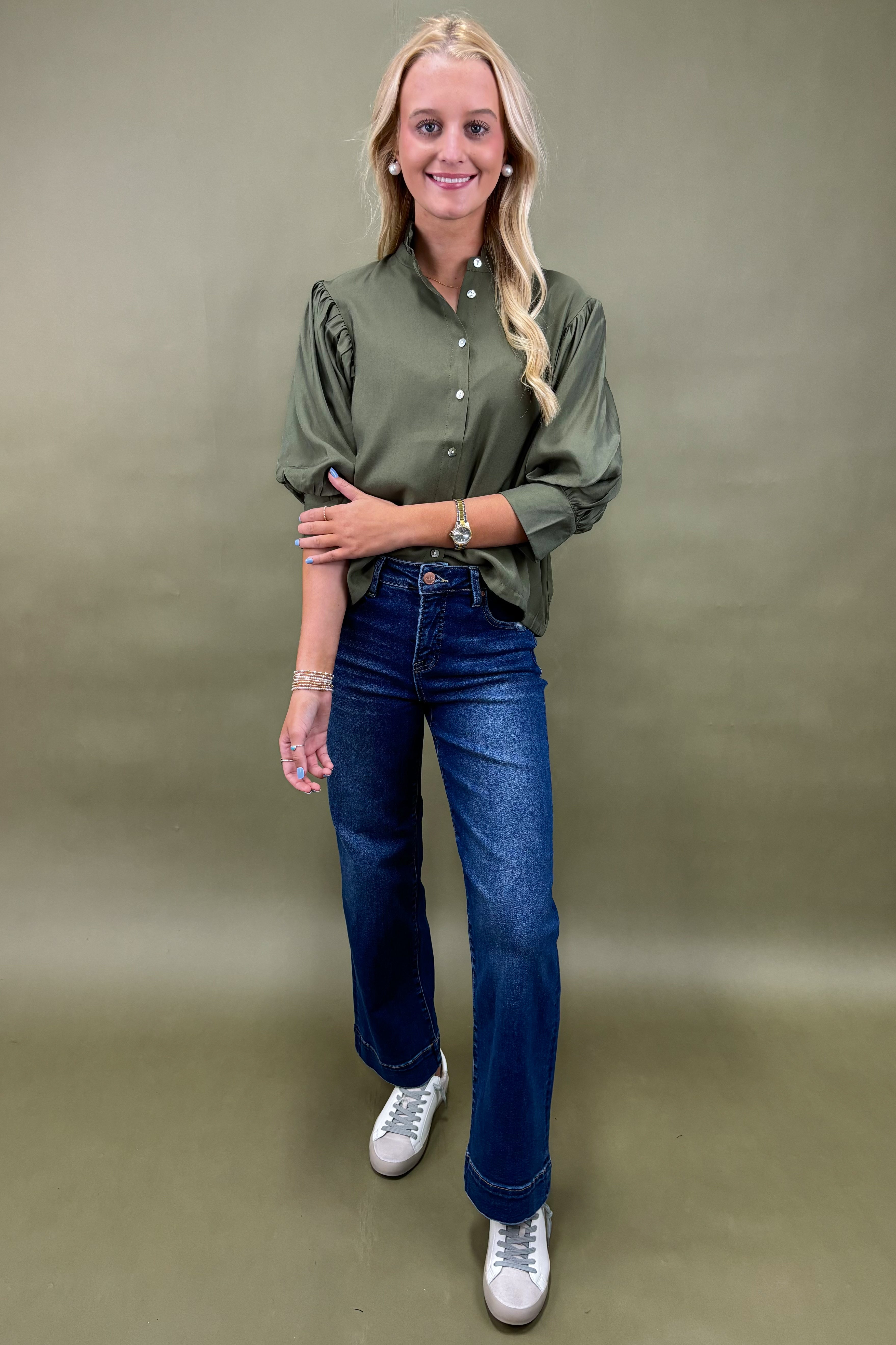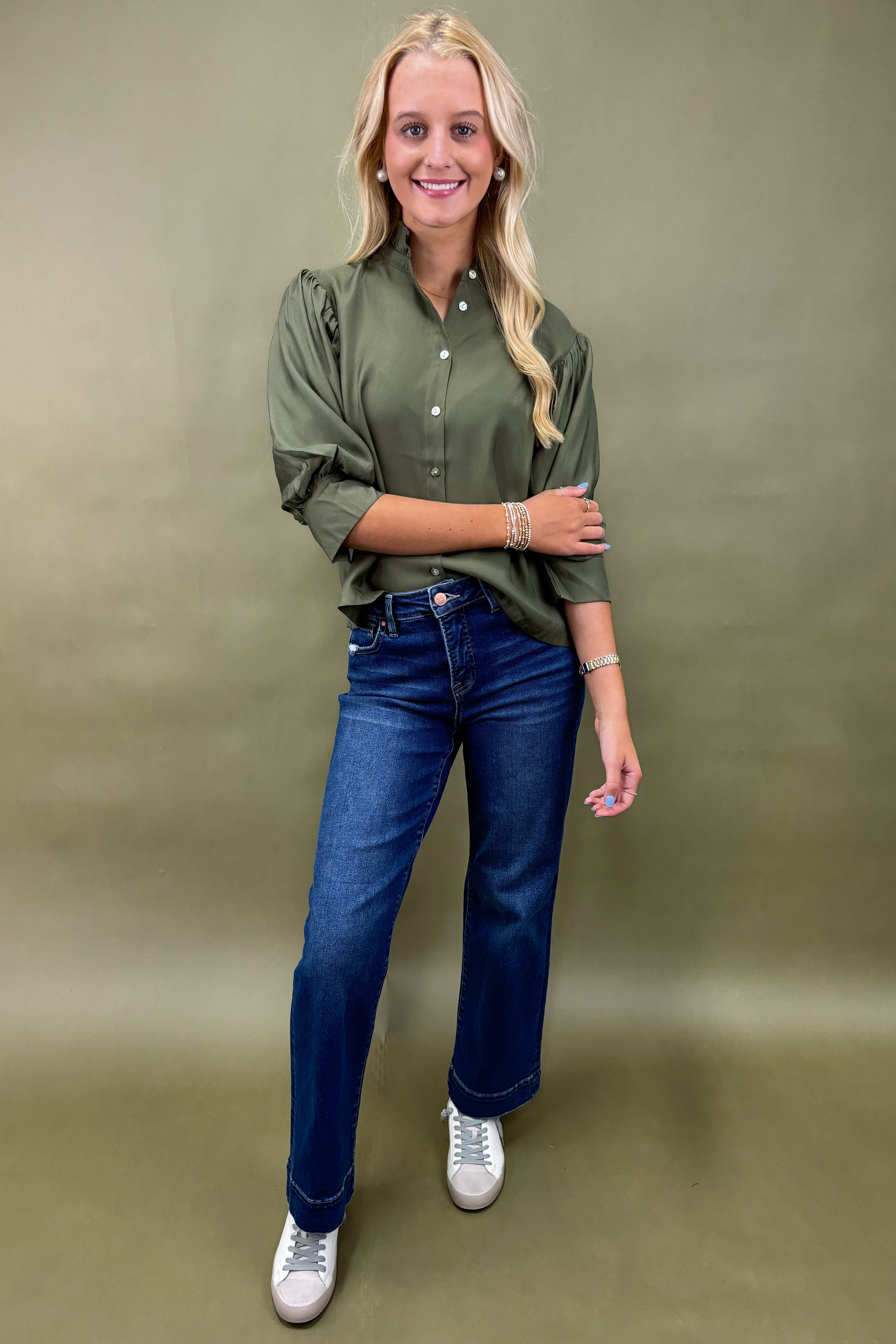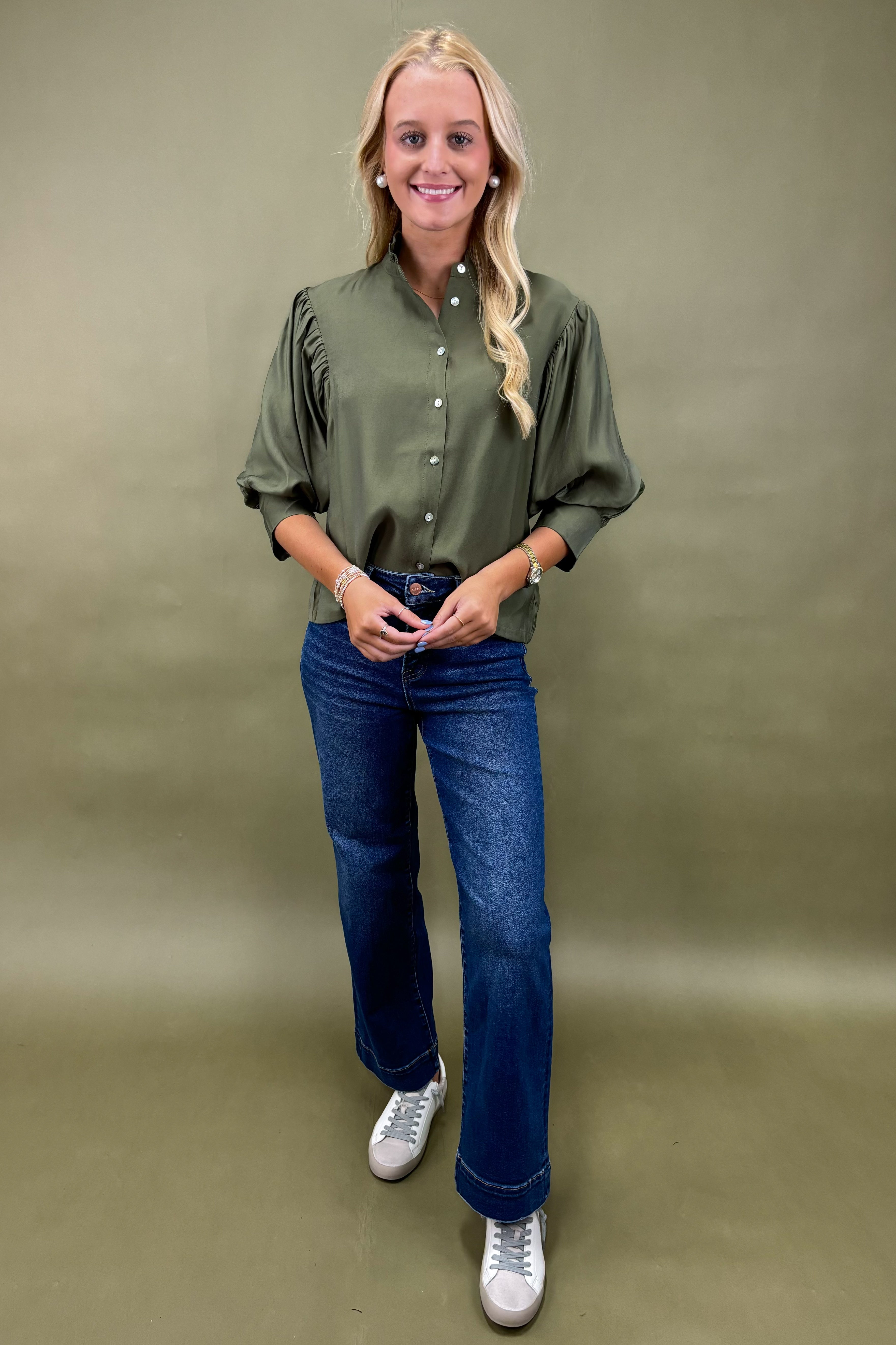 No matter how you wear it, this olive green top ensures you look put-together with minimal effort. It’s one of those pieces you’ll find yourself reaching for again and again—the perfect mix of classic design and fresh detailing.